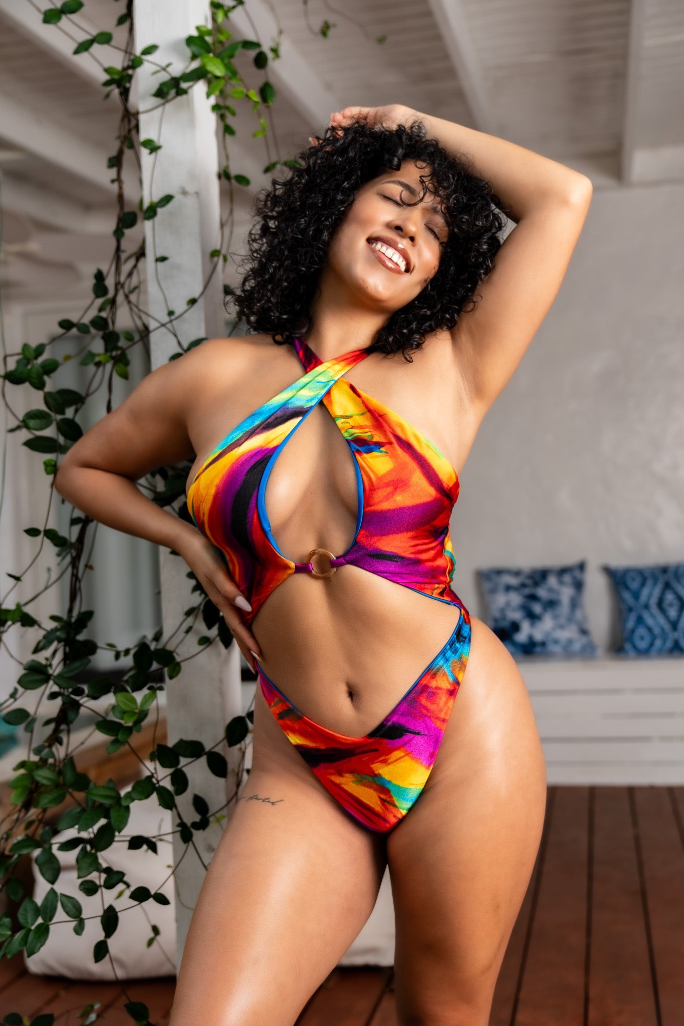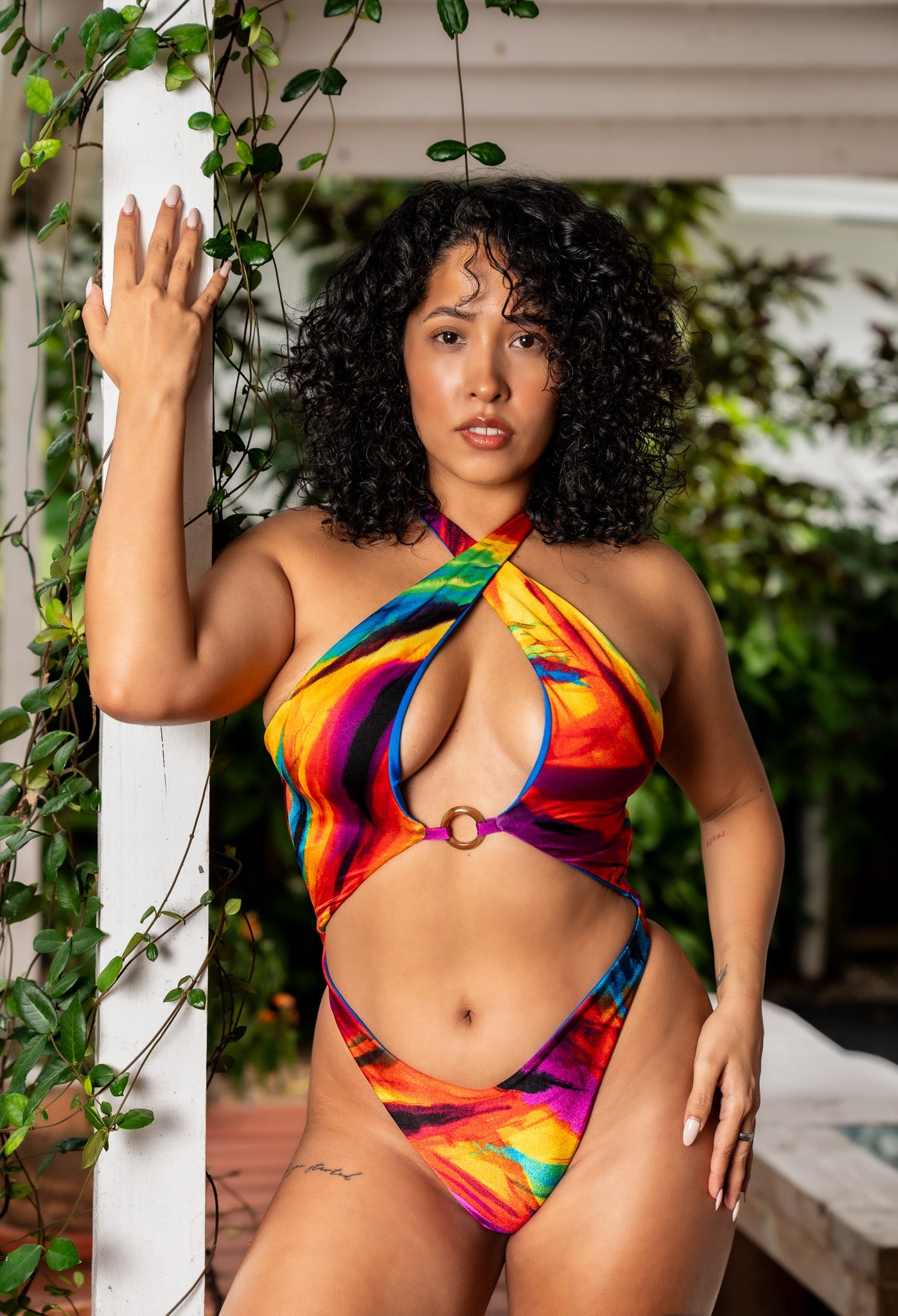 The Desire Monokini leaves the eye wanting more! This sexy piece can be cris crossed at the neck or tied halter style & sits high on the thigh promoting a slim waist. The bottom features a cheeky back coverage and is seamless.
