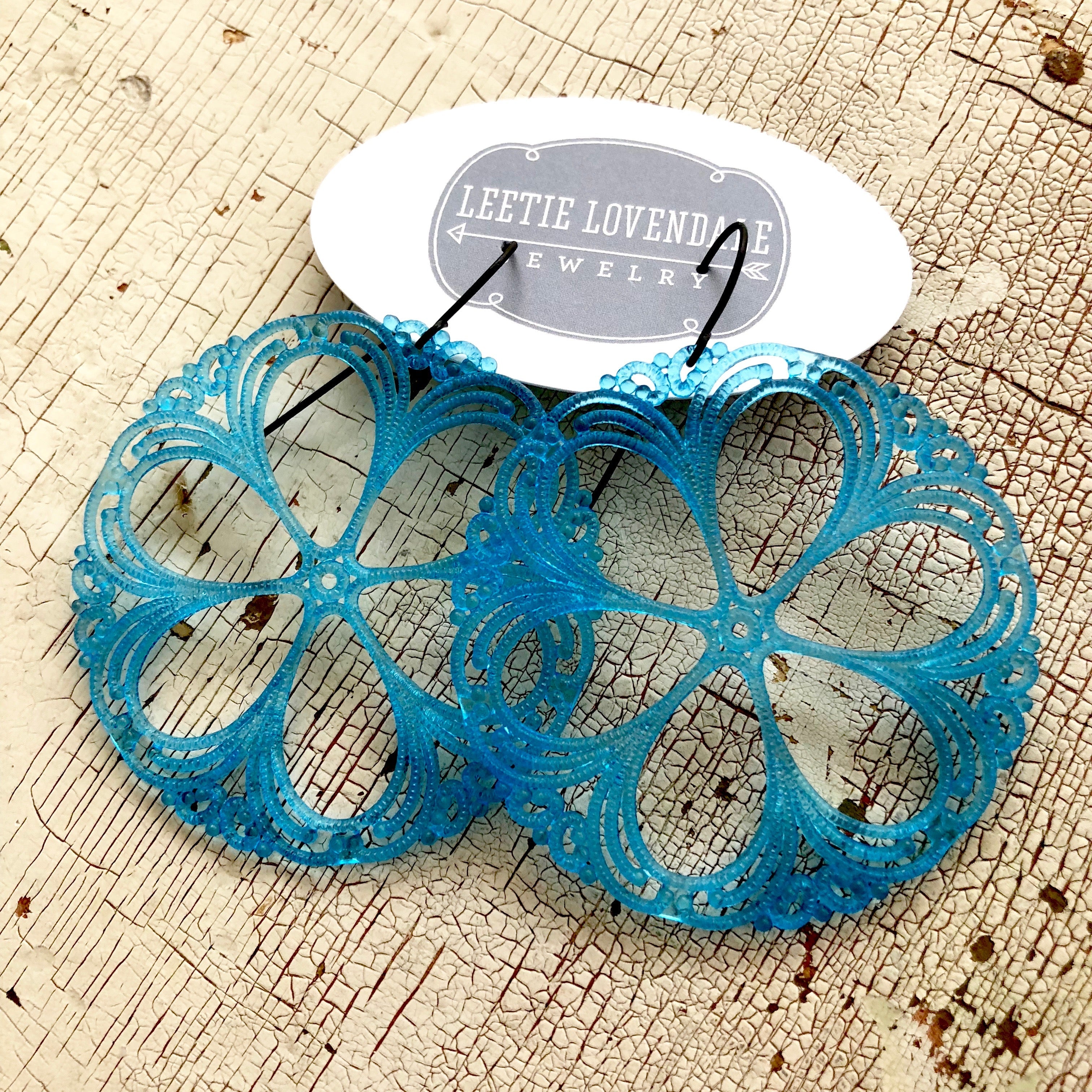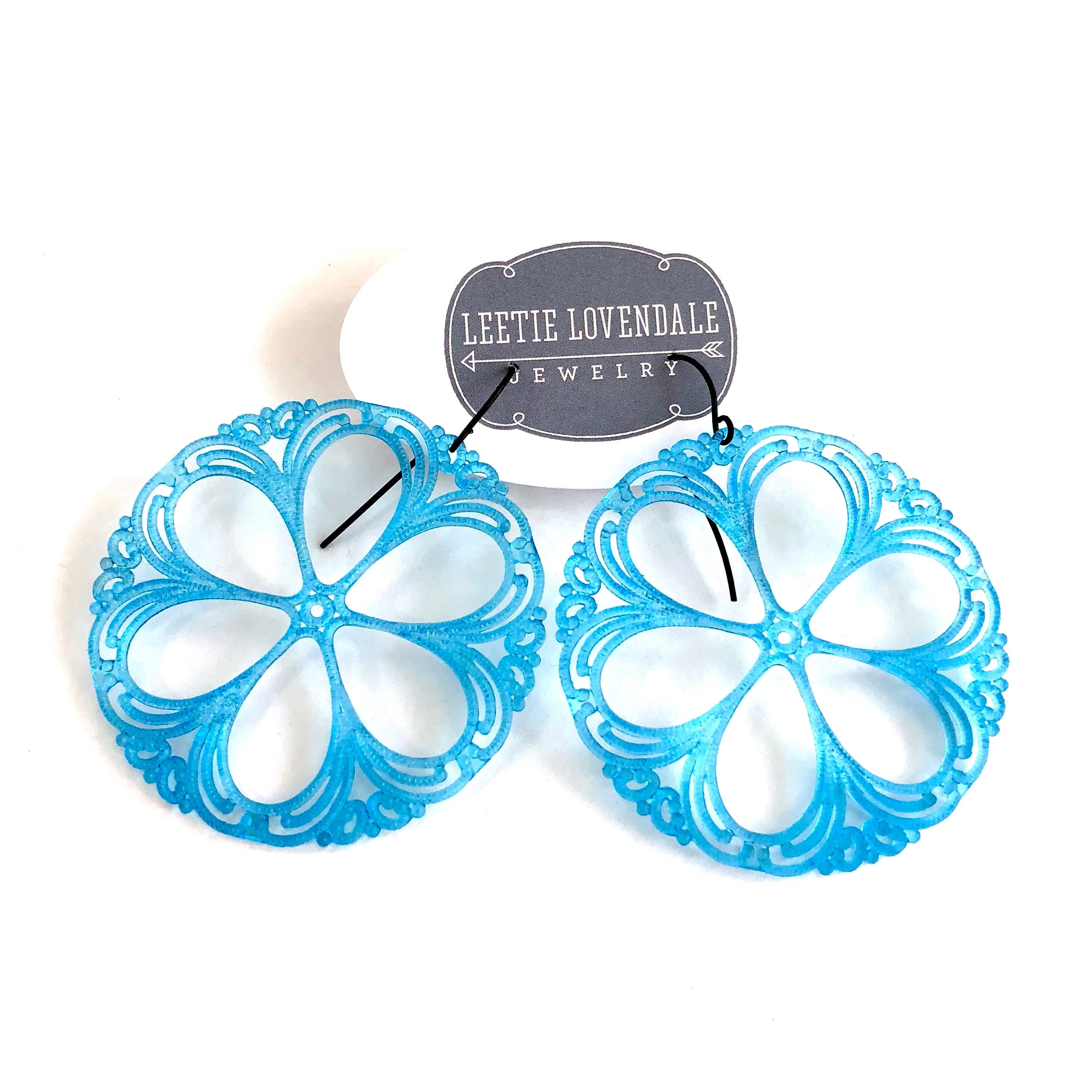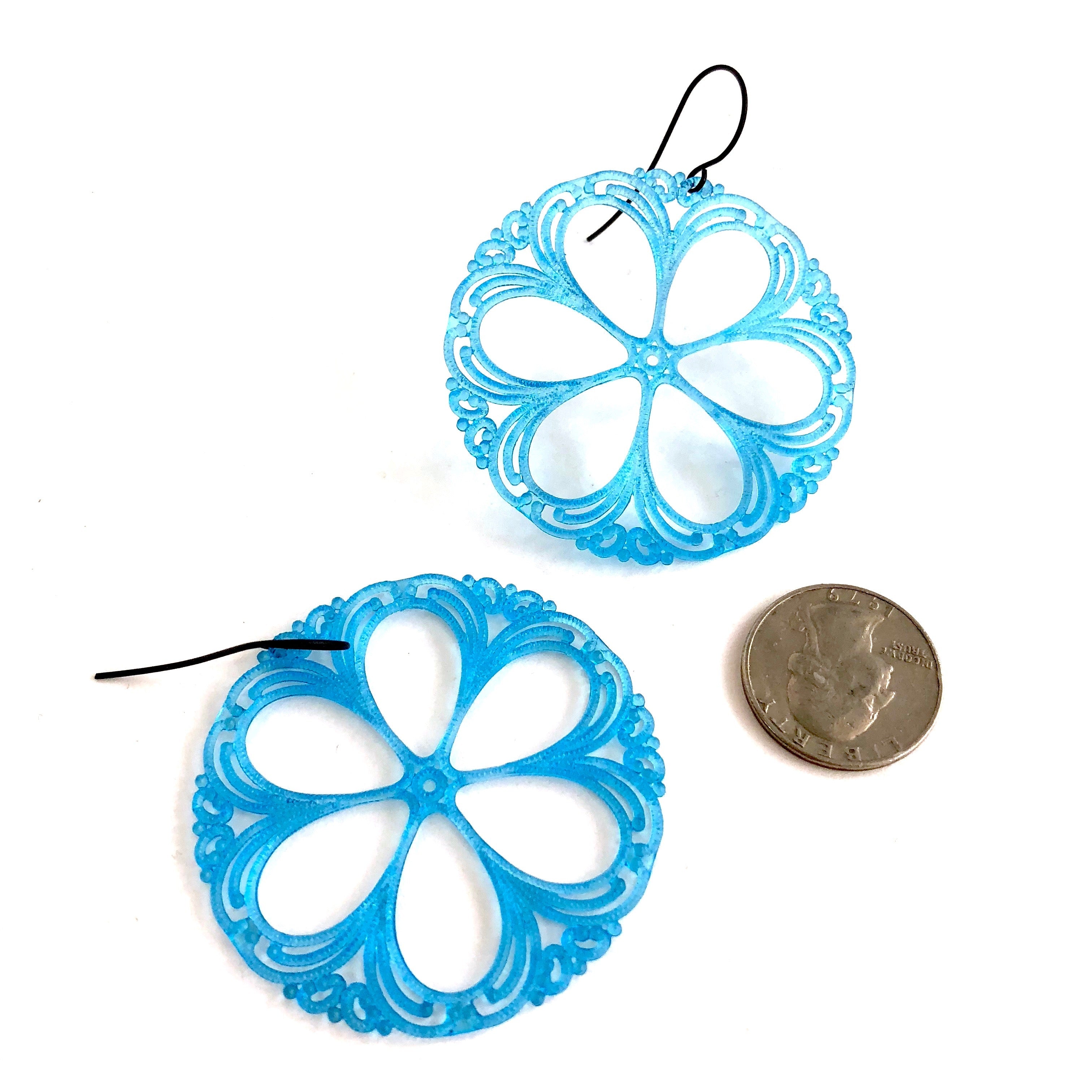 Aqua blue statement earrings in a lacy filigree round shield shape. Each drop earring measures about 2.25" in length & 2" in diameter & are made with vintage-reproduction plastics, ethically made and sourced in Europe. While most of our treasures are made with vintage stock, this style is made with new plastics and in old moulds.