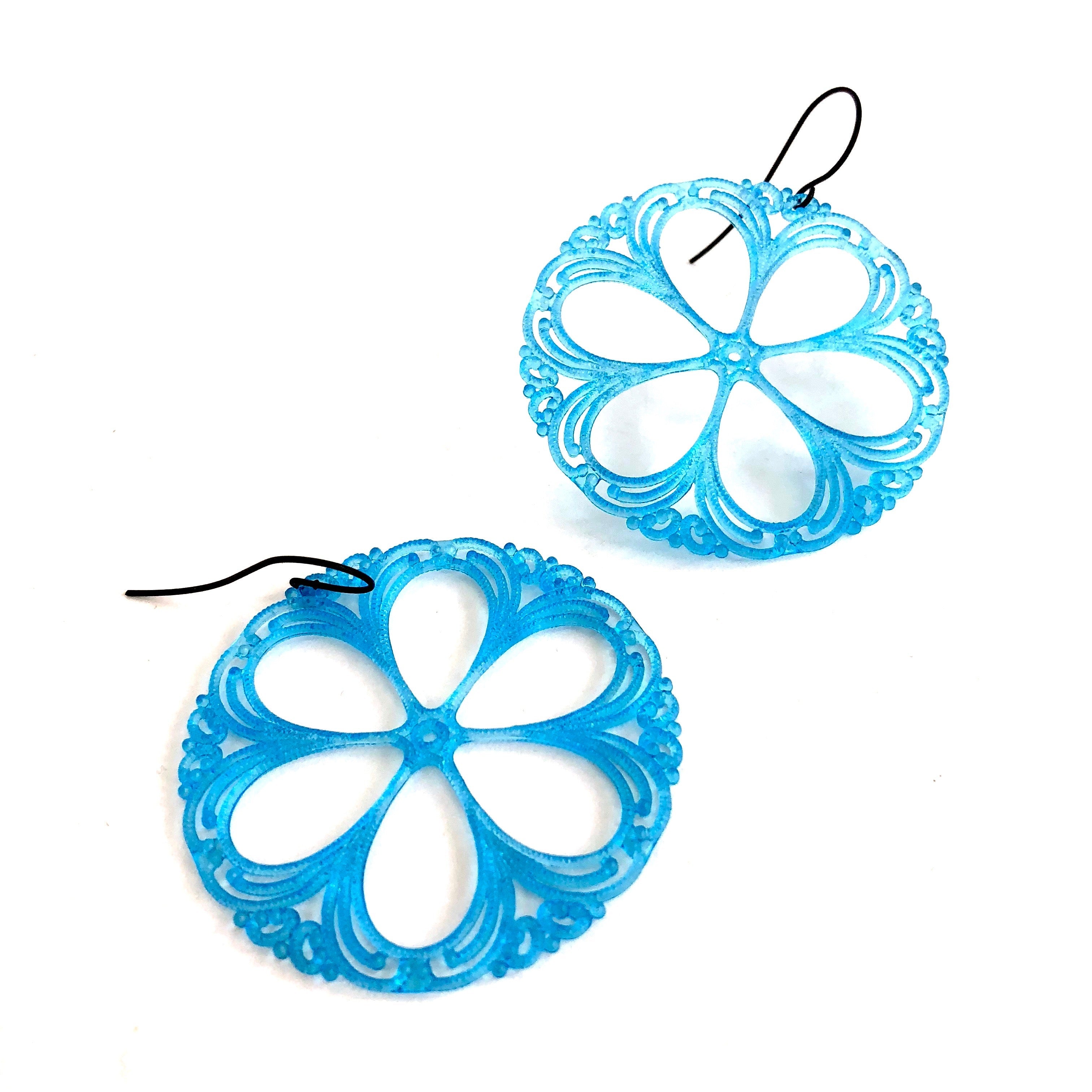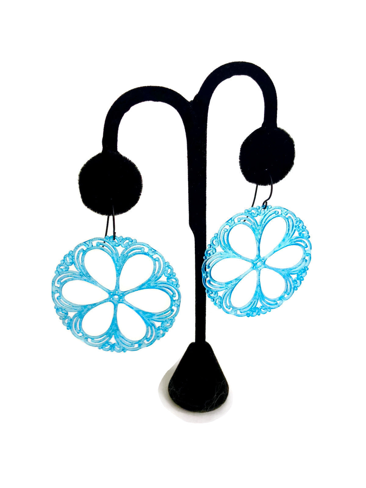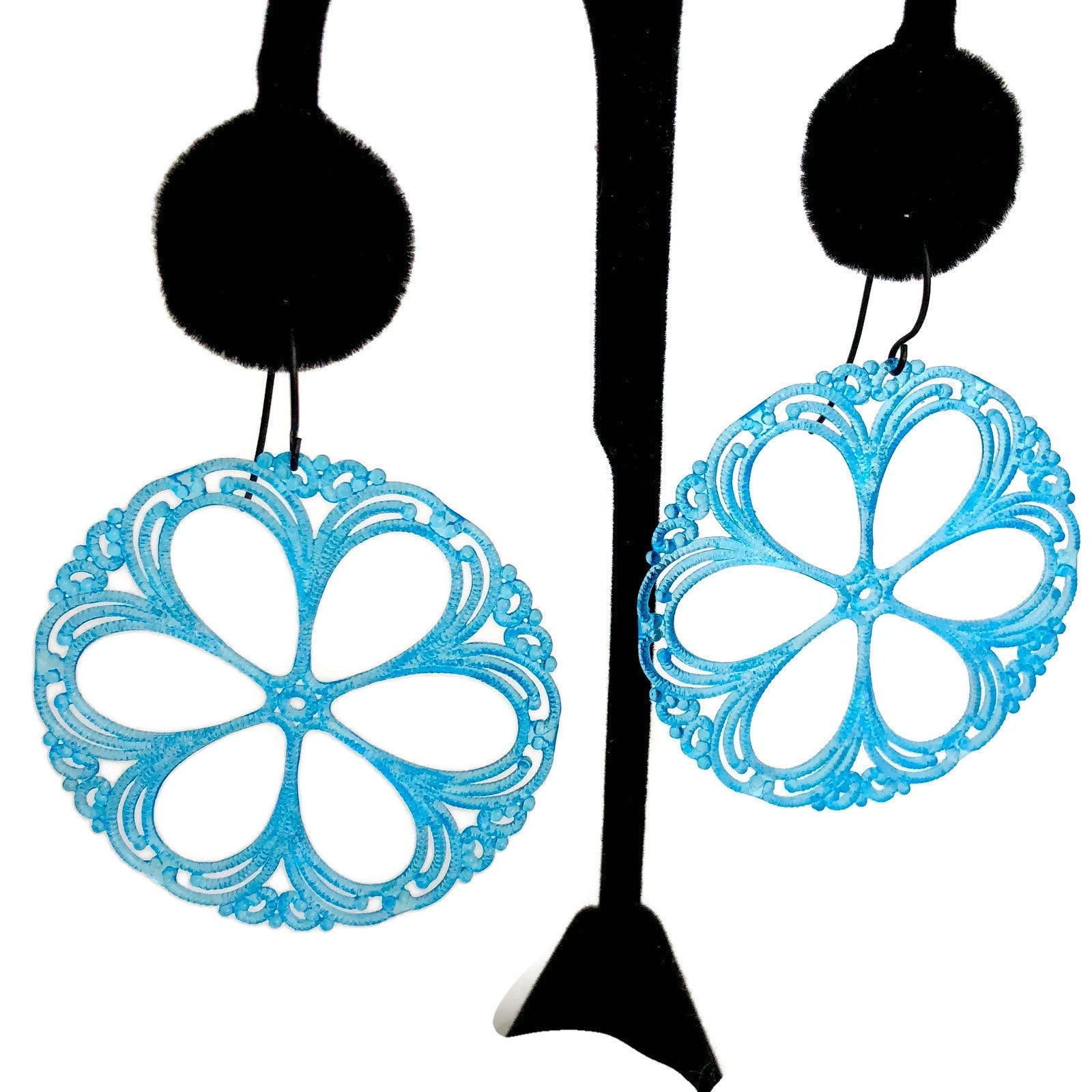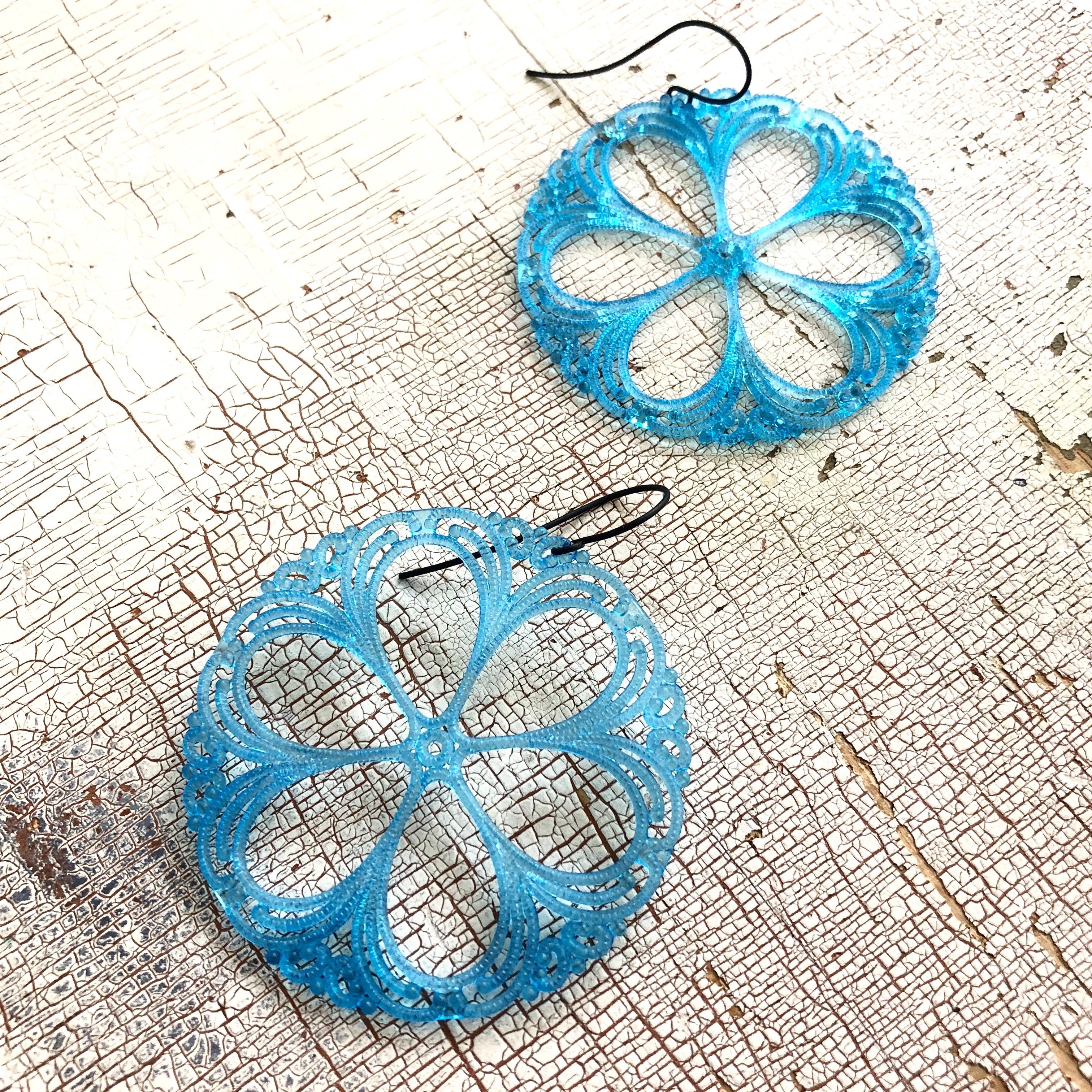 Aqua blue statement earrings in a lacy filigree round shield shape. Each drop earring measures about 2.25" in length & 2" in diameter & are made with vintage-reproduction plastics, ethically made and sourced in Europe. While most of our treasures are made with vintage stock, this style is made with new plastics and in old moulds.