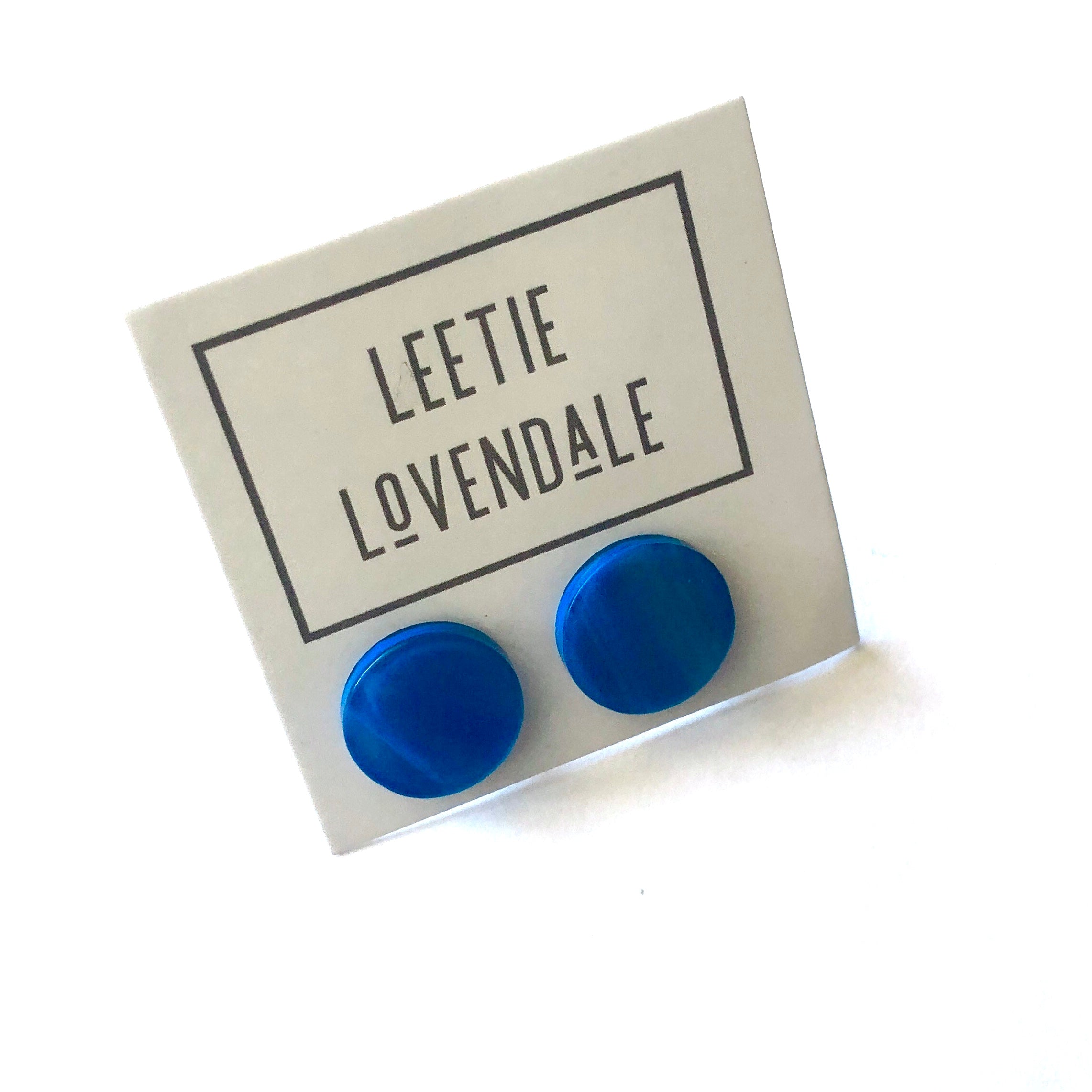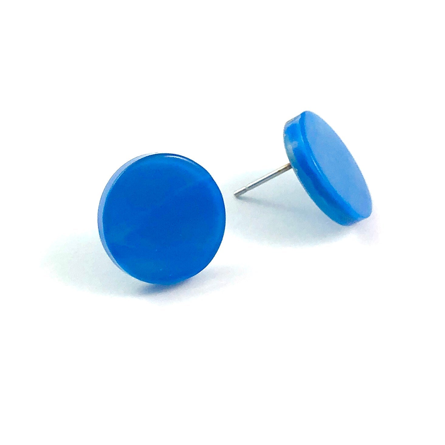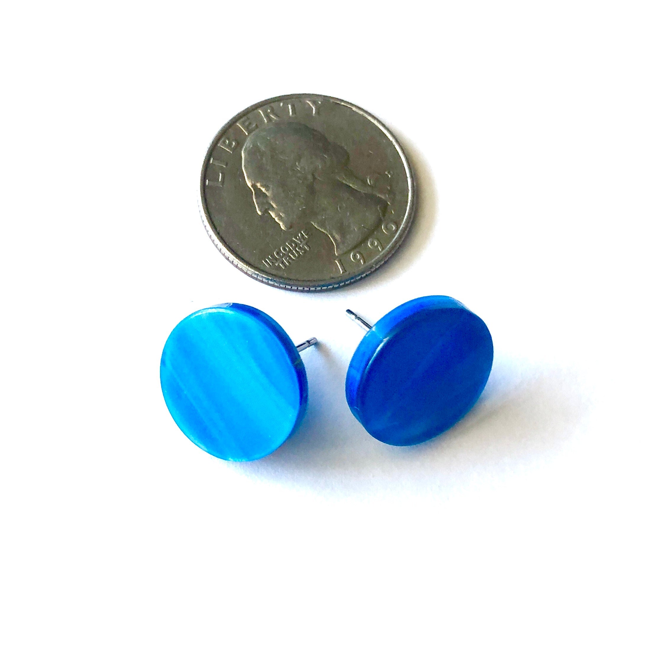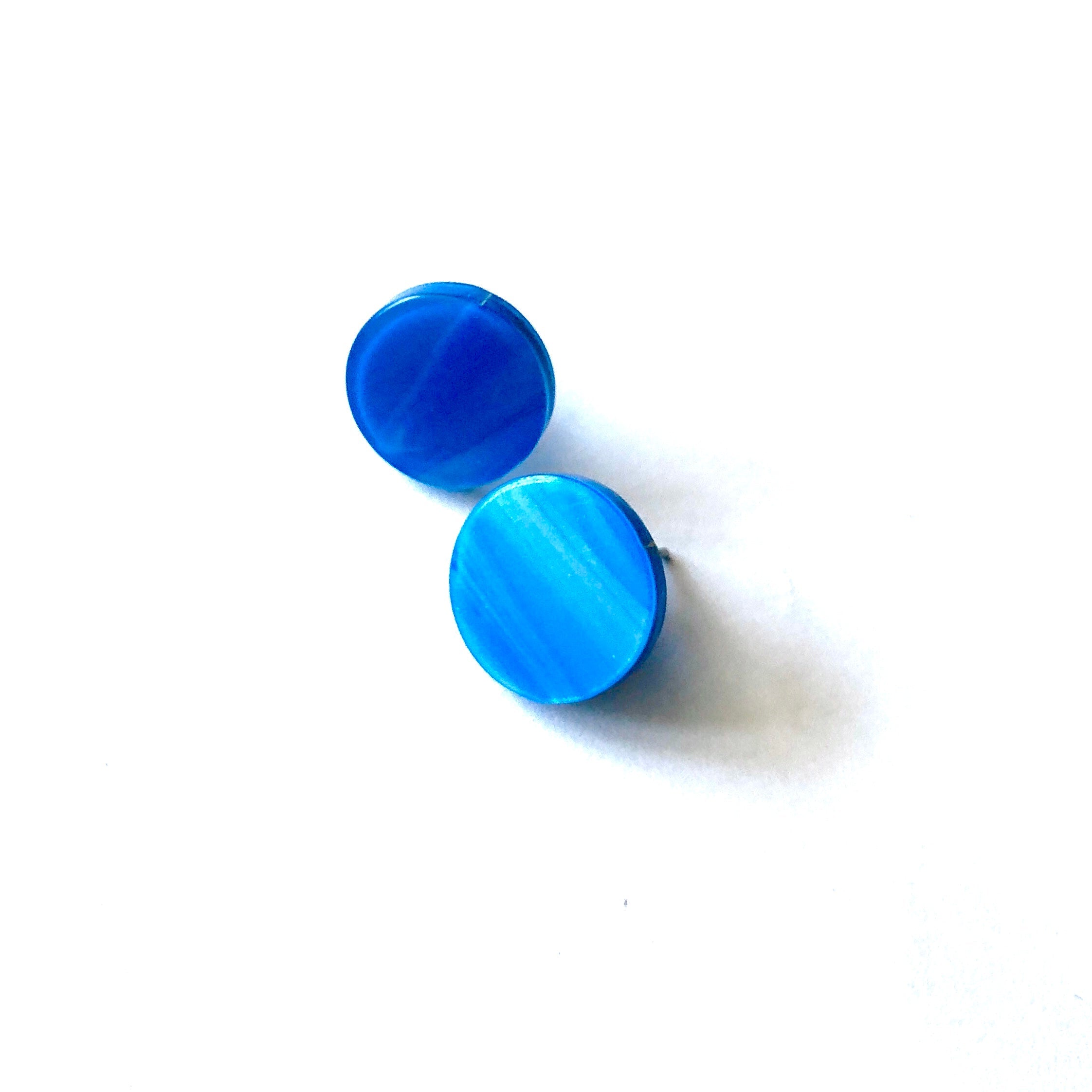 Bright aqua marbled stud earrings in a great disc shape. These button earrings are the perfect mix of classic and mod retro. Each measures just under 3/4" in or 15mm in diameter & 5mm thick. Retro-chic and sure to be noticed.