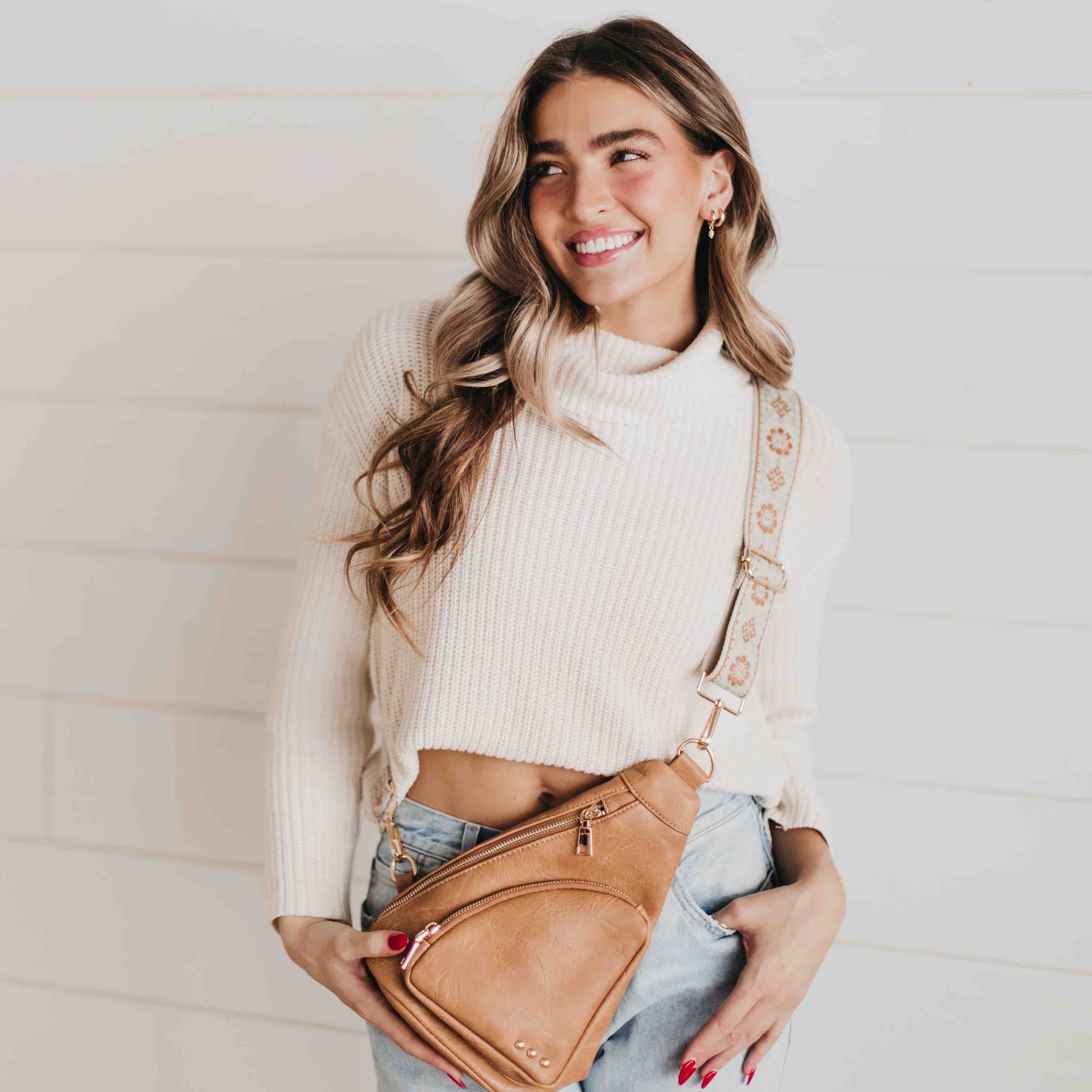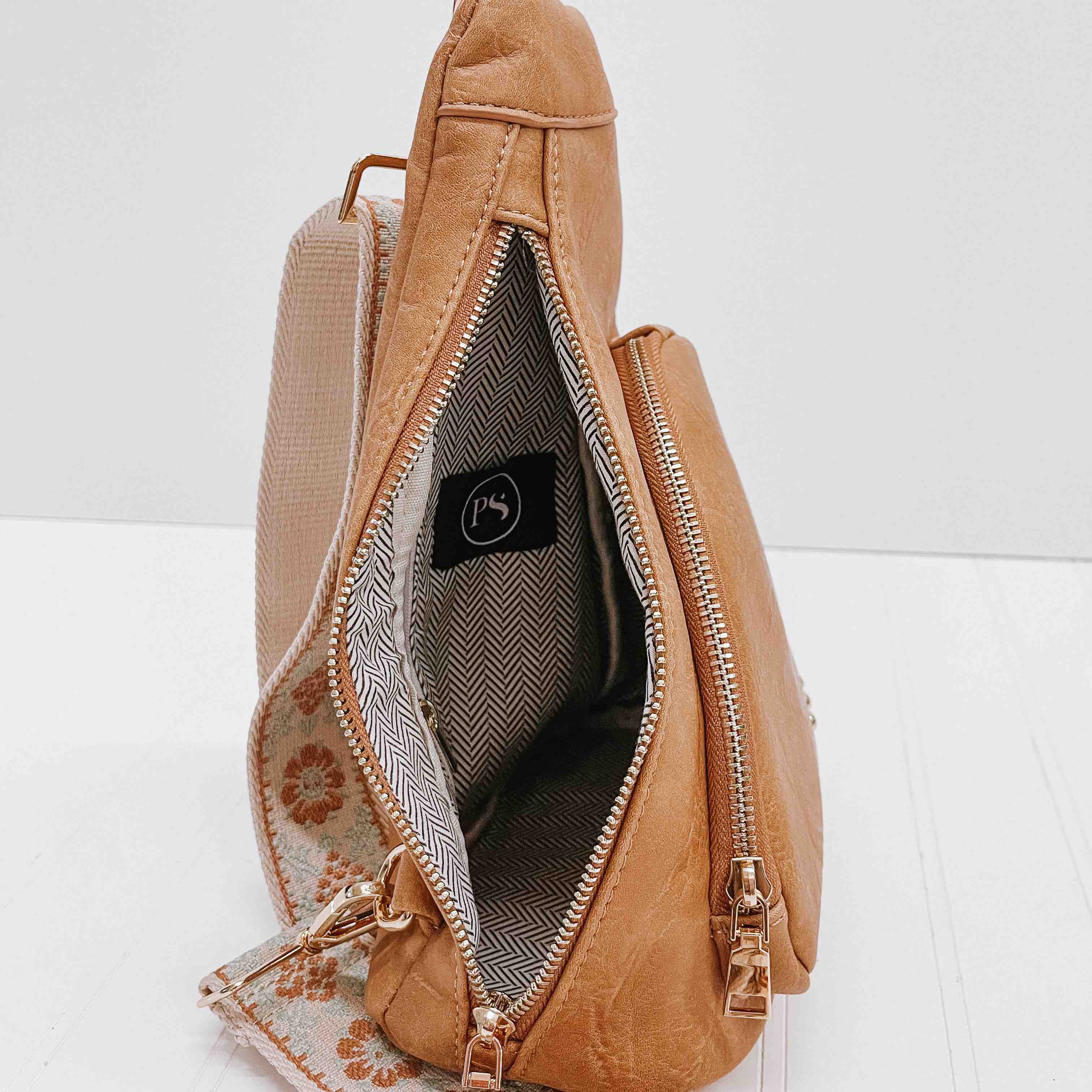 If you love our Jordan Sling Bag, you are going to love this style. This is the perfect bag to hold all your things. There is a small front pocket for your smaller easy to reach items such as keys, lipgloss, hair ties, etc. The large side pocket has a chevron pattern, and an additional slash zipper pocket. The Austin Sling Bag has a removable woven floral guitar strap, and is a great bag for many occasions.