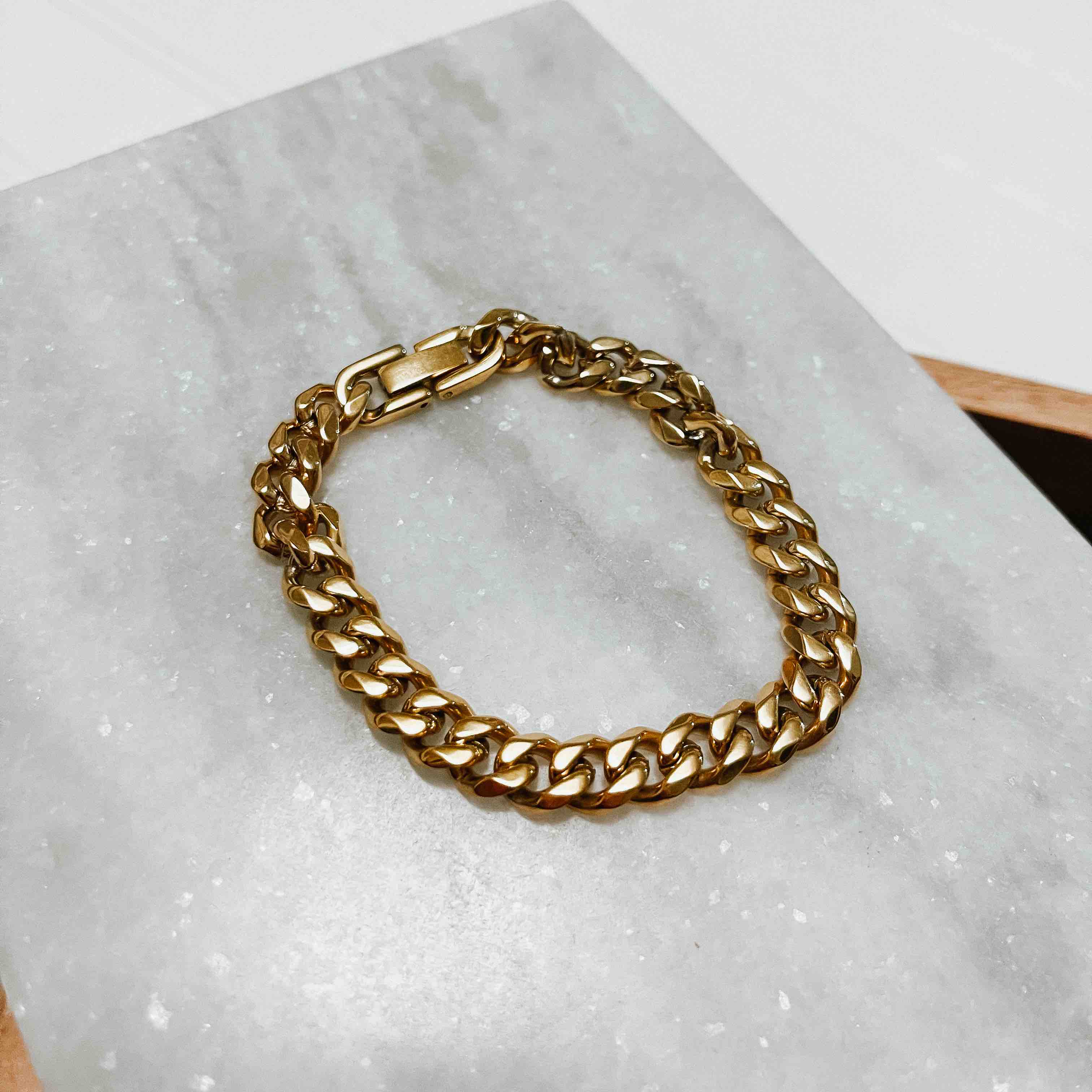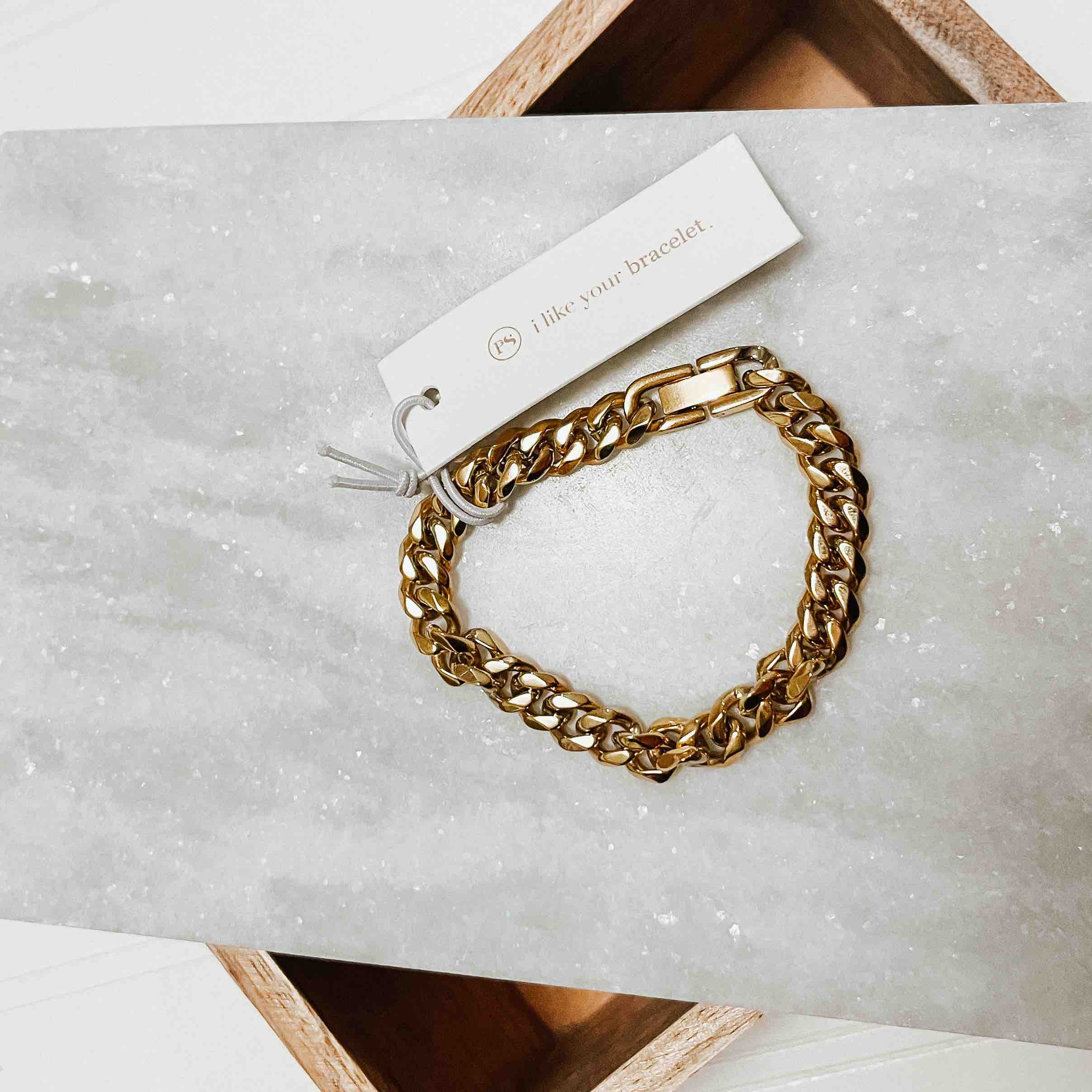 Our Charlie Chain Bracelet is the perfect chunky gold statement piece. This jewelry piece is 18k gold plated stainless steel and waterproof. They are tarnish resistant and expected to last up to 1-2 years. It is perfect for mixing and layering with other bracelets, and is guaranteed to complete any style outfit.