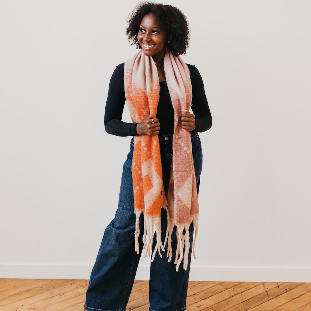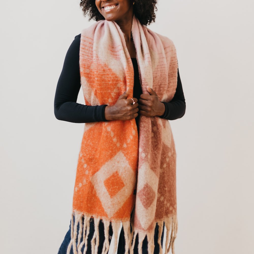 Nothing says cozy like the Diamond Fade Chunky Scarf. Inspired by the colors of fall and winter, this super cozy scarf is made with ombre design and a diamond accent pattern with chunky fringe on the bottom. Perfect for your morning stroll or just cozied up on your couch. Bundle up in your new favorite accessory in one of 2 fun colorful pathways.
