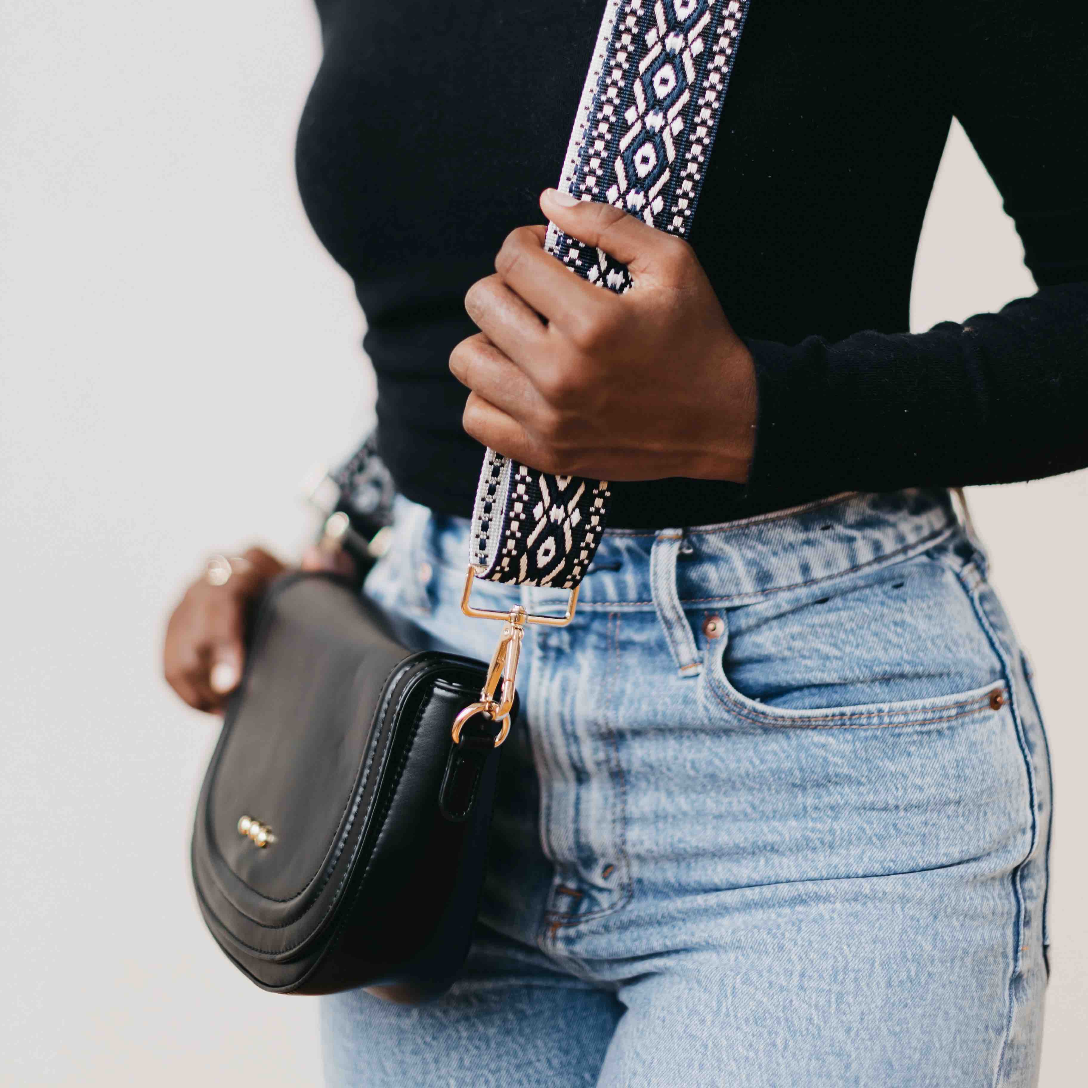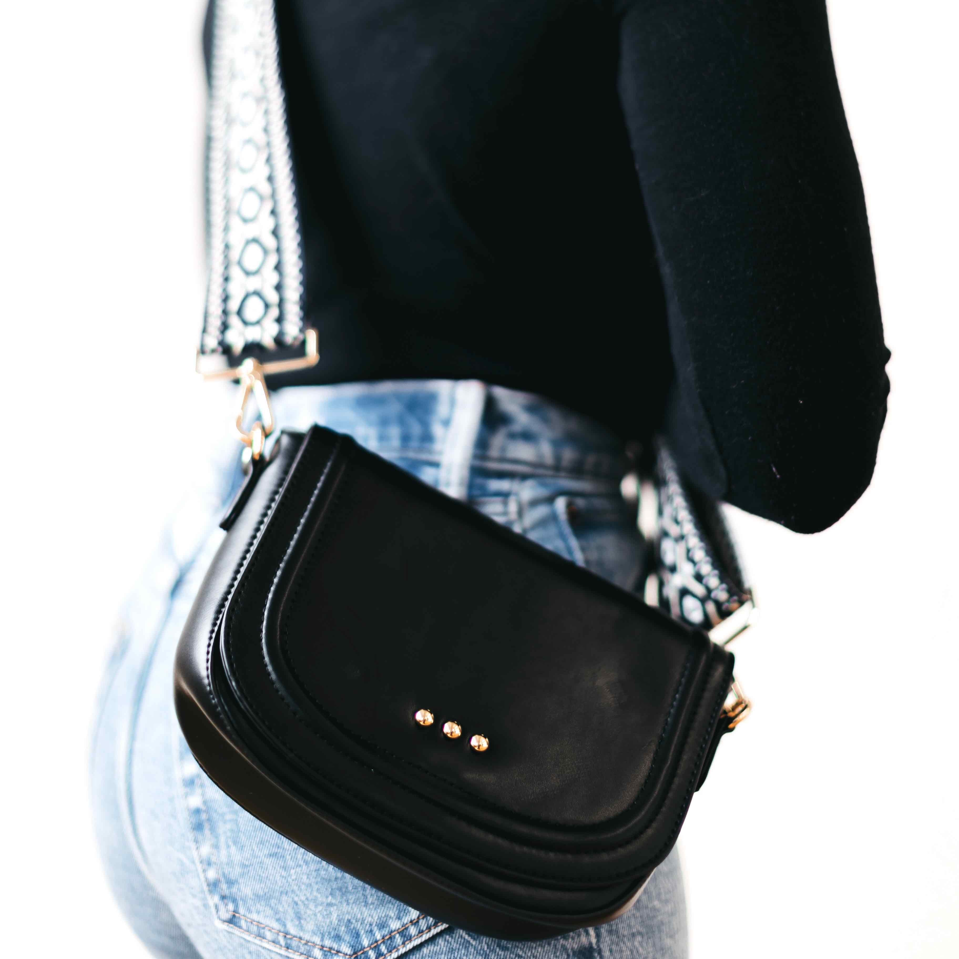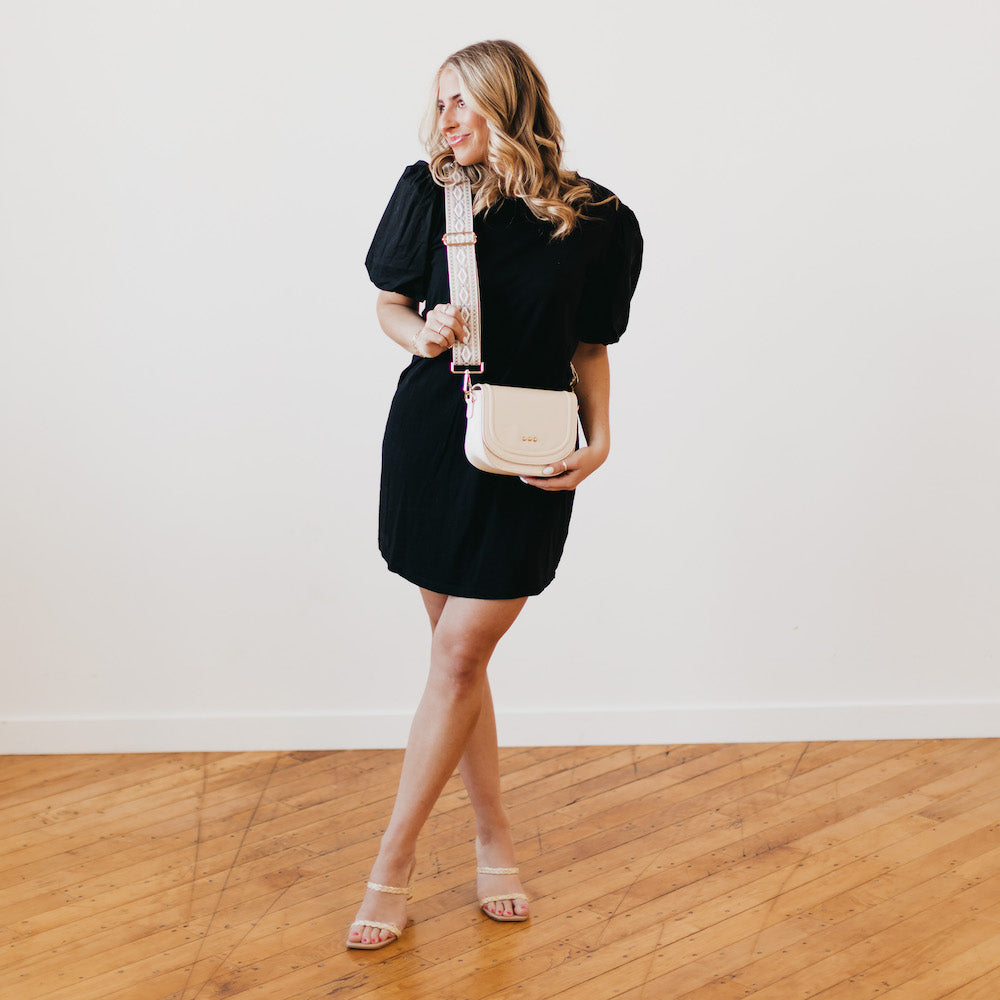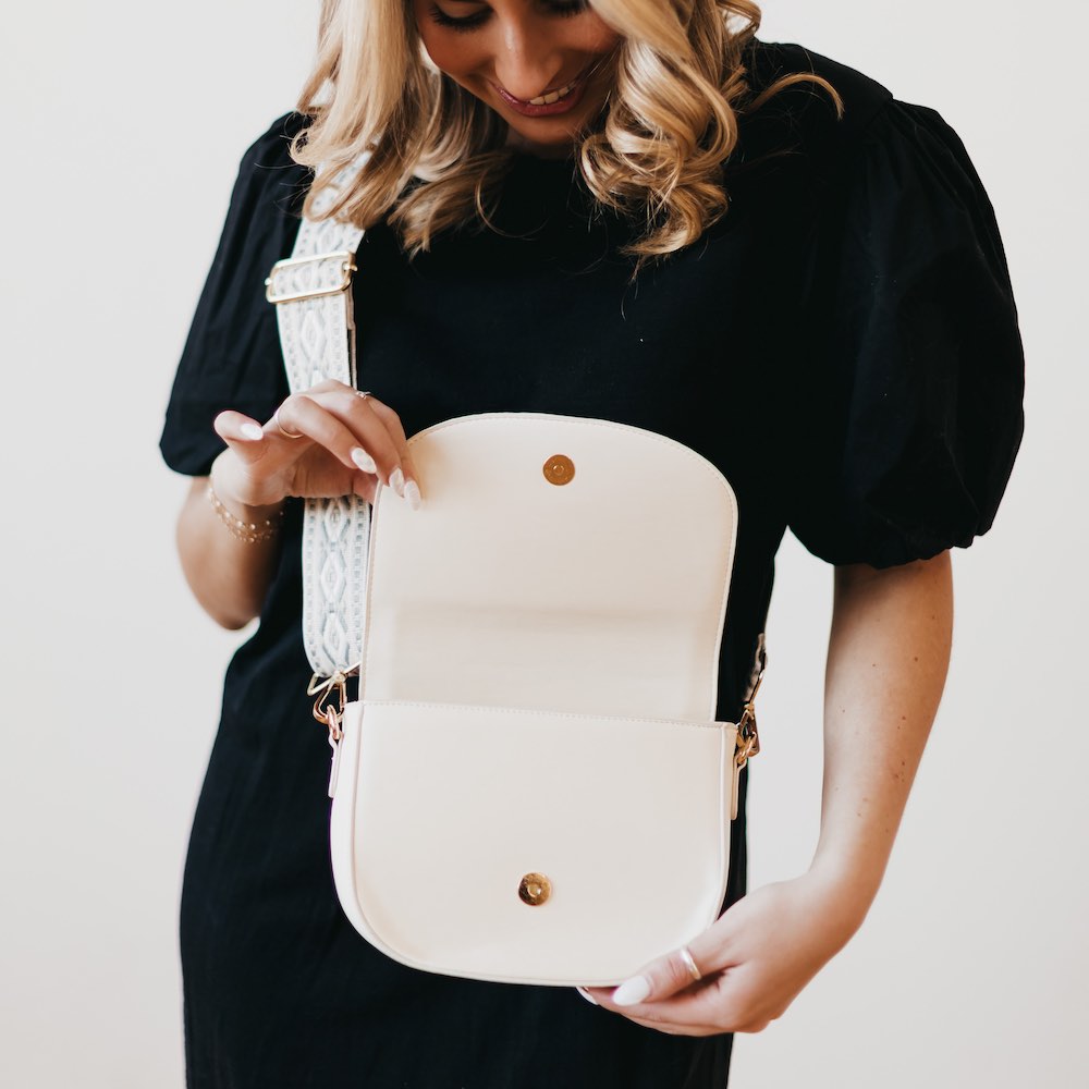 Introducing our Serenity Saddle Bag - your ultimate go-to bag for all your events! This bag has a saddle shape and includes a neutral, adjustable and removable, canvas guitar strap, and an interior zipper pocket. The Serenity Saddle Bag can be styled as a crossbody or as a clutch bag, allowing you to wear it for a variety of different occasions. Available now in 3 colors including cream, brown, and black!