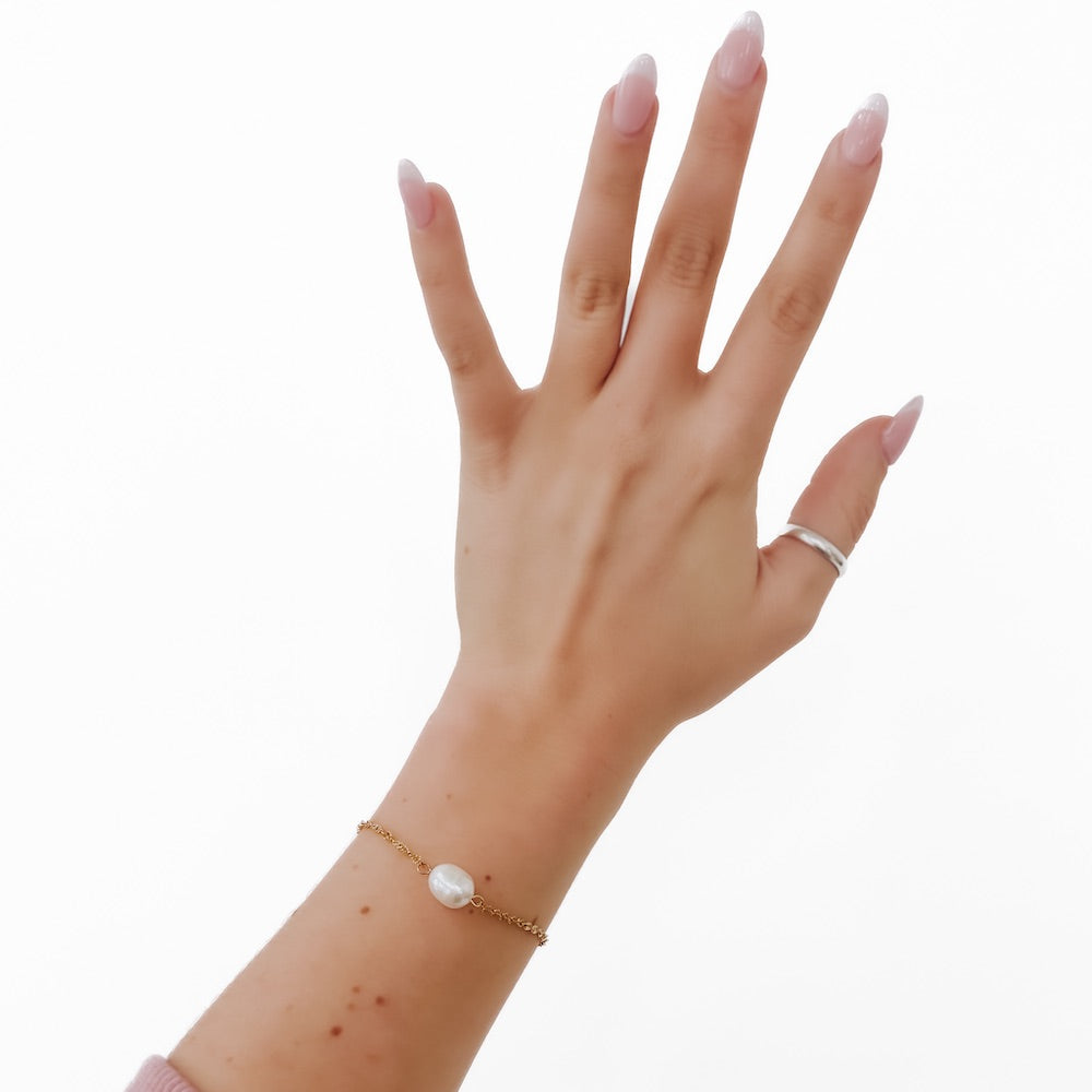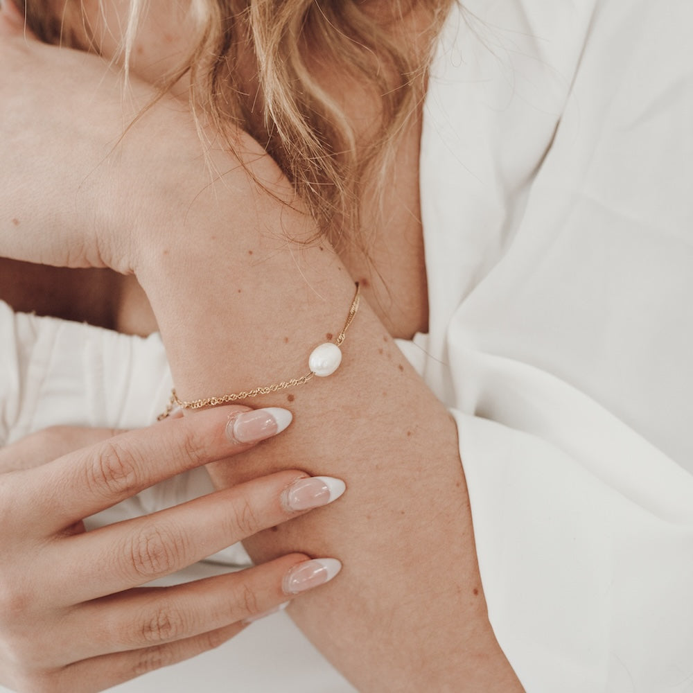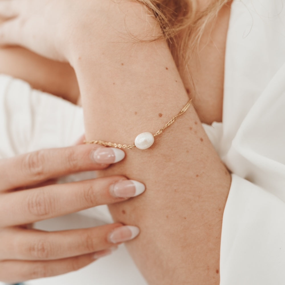 Dive into style with our Under The Sea Twisted Chain Bracelet. This adjustable clasp bracelet features a gold twist chain and a singular pearl charm, perfect for adding a touch of elegance to any outfit. Plus, it's WATERPROOF!