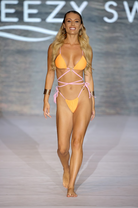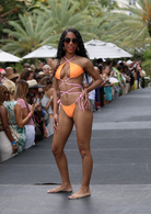 Your go-to bikini top in our new sunset orange print. Mollie features a classic triangle top bodice with ultra-thin baby pink straps that tie around the neck and back to give you a comfortable, custom fit. Mollie also has a center ring detail with wrap around straps for an additional styling touch. Mollie is one of our favorite bikini tops because of her versatility and flattering shape.