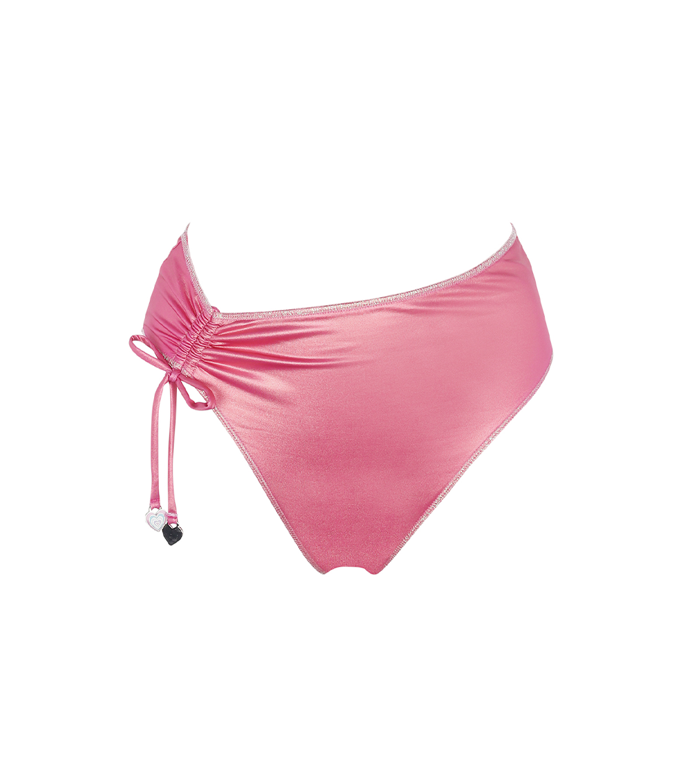 Arabella is just what you were looking for. Pink high-waisted bikini with a bottom wrinkled on one side and the ideal top for your summer days. Produced in a sustainable factory and handmade by Peruvian artisans.