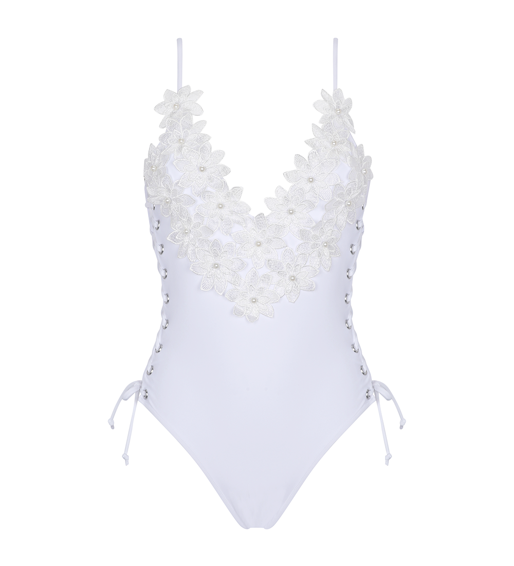 The dreamy one piece totally white! Designed with two adjustable sides and flowers details. This swimsuit is more modest looking from the front but keeps the fun in the back. Produced in a sustainable factory and handmade by Peruvian artisans.
