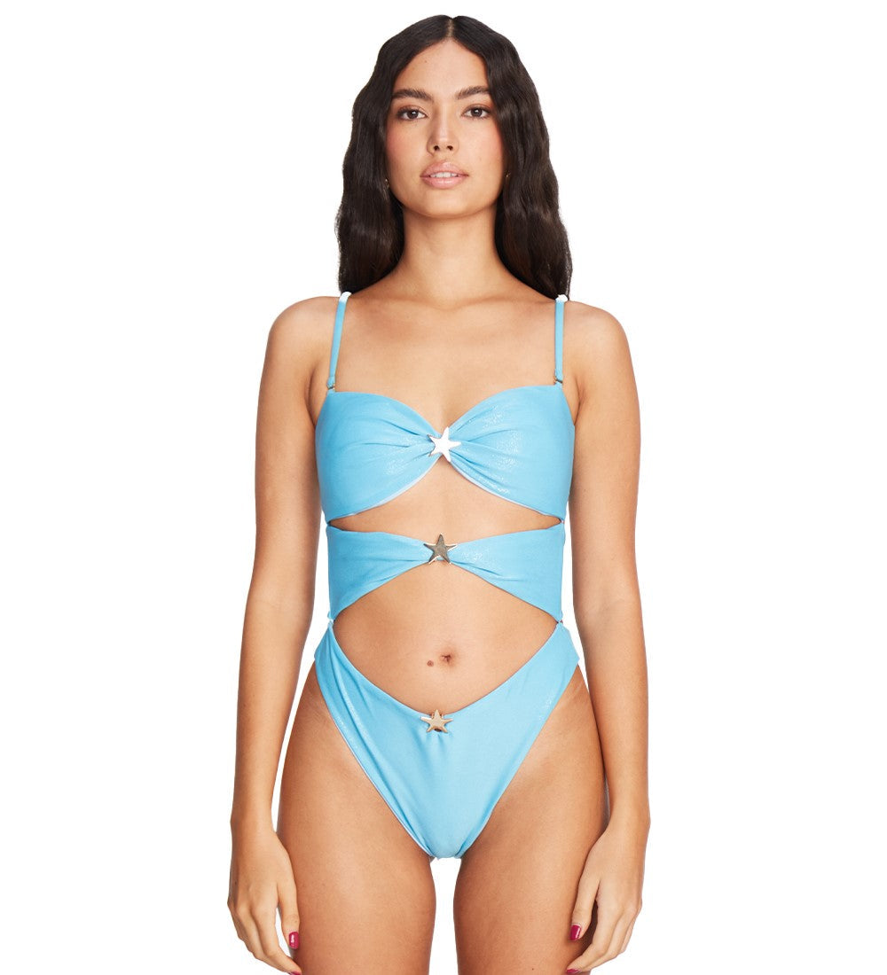Make it shine with our elegant Josefina Light Blue one piece. Crafted in shiny fabric, this cut out model features gold details in the center and adjustable straps that guarantee a perfect fit. Perfect for shining under the sun in style.
