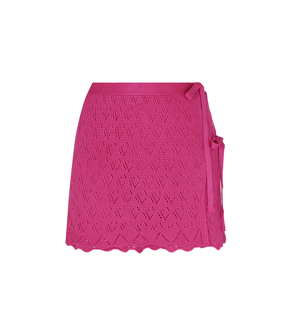 The perfect mix of cute and comfy! Fuchsia mini skirt woven in crochet that wraps around the waist to accentuate your figure to the maximum and with details on the edge of the skirt. Produced in a sustainable factory and handmade by Peruvian artisans.