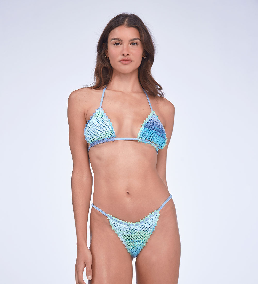 You asked for it so Kendall is back in blue! Your favorite low waist bikini with adjustable straps on the bottom and made in total crochet. Each bikini is unique since it is made with colored threads made by hand. Produced in a sustainable factory and handmade by Peruvian artisans.