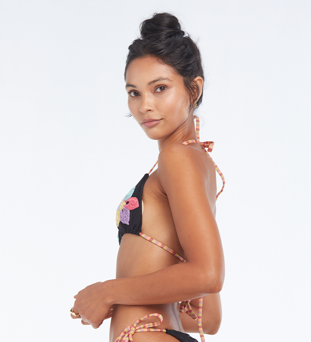 The combination of a solid color and print makes this bikini unique. With adjustable straps and crochet flower detail on the top. Produced in a sustainable factory and handmade by Peruvian artisans.