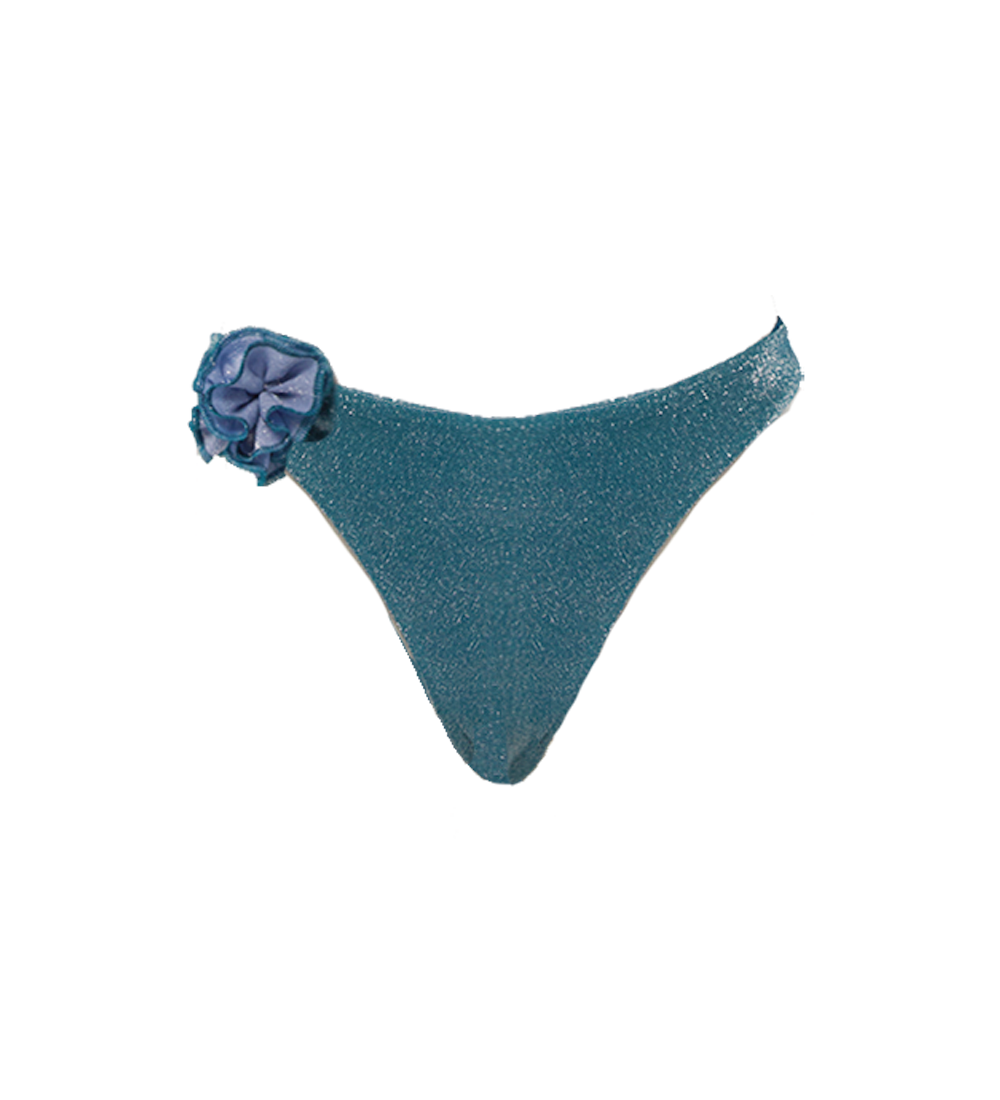 Lulu will make you shine like never before. Triangular bikini with shiny fabric, removable flower details and wrap-around pitas on the torso. Produced in a sustainable factory and handmade by Peruvian artisans.
