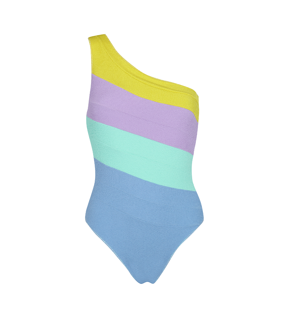 Glowing under the sun with Maria Multicolor Blue. A one-shouldered swimsuit that will give you an amazing fit. Also, is made with shiny fabric. Produced in a sustainable factory and handmade by Peruvian artisans.