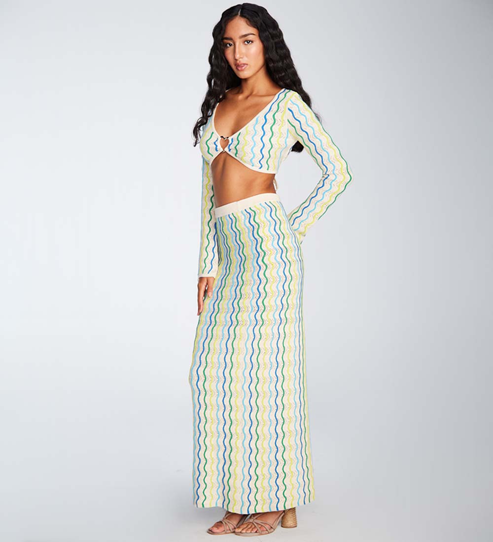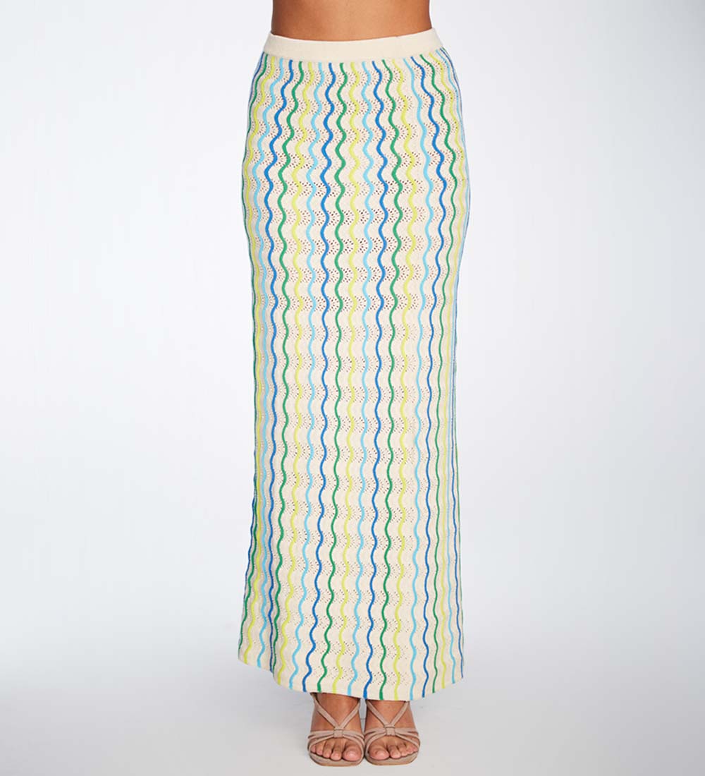 Maxi skirt woven in ivory with a wave design that perfectly complements the Olga Top, ideal for looking elegant and fresh on any special occasion. Produced in a sustainable factory and handmade by Peruvian artisans.