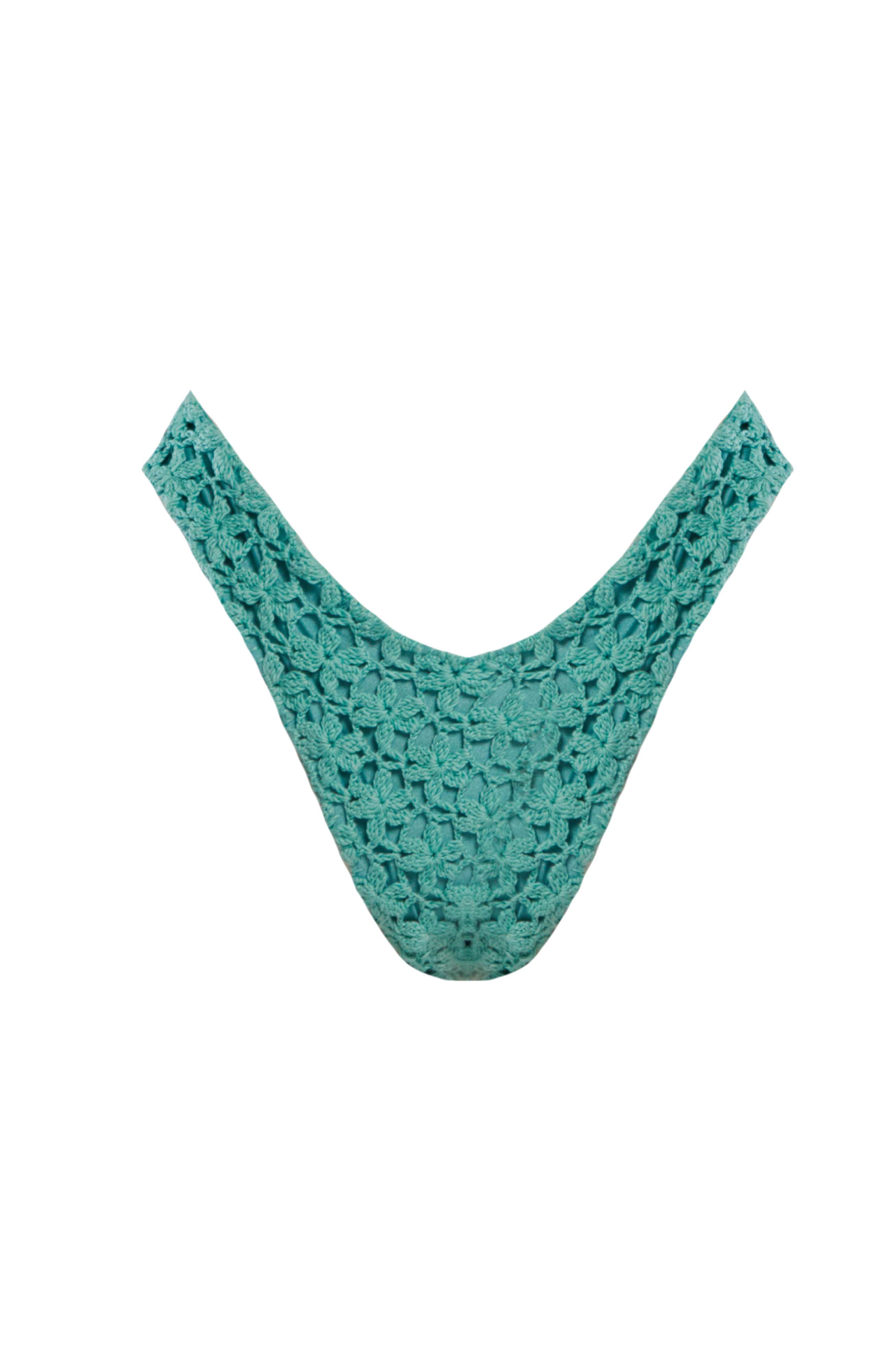 The cutest! Mint bikini with full crochet details on the top and bottom, high-leg bottom and adjustable straps on the top. Produced in a sustainable factory and handmade by Peruvian artisans.