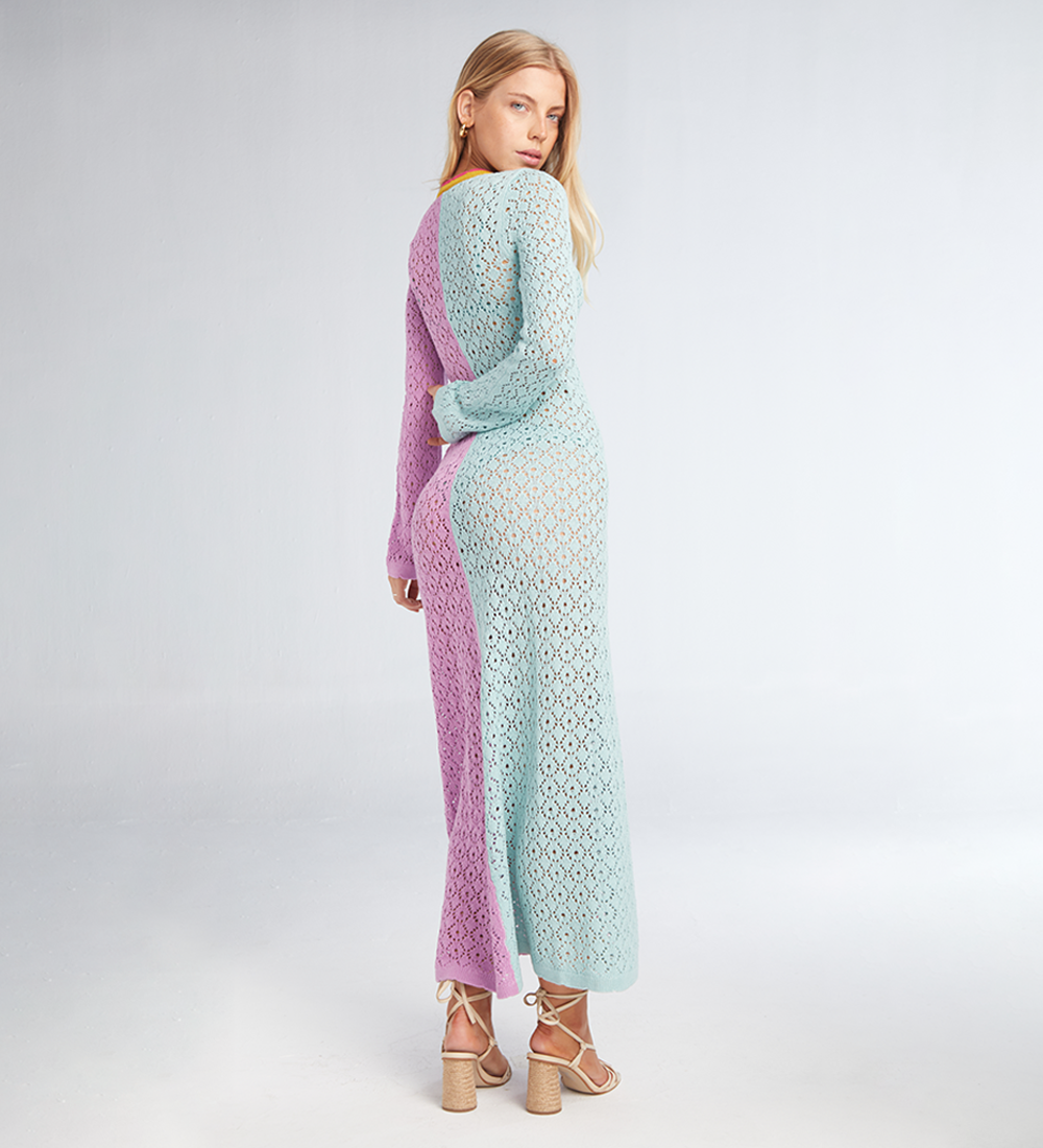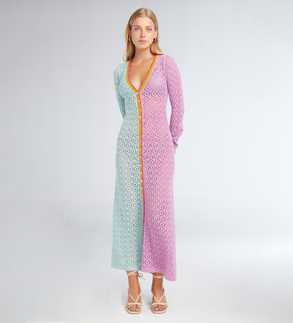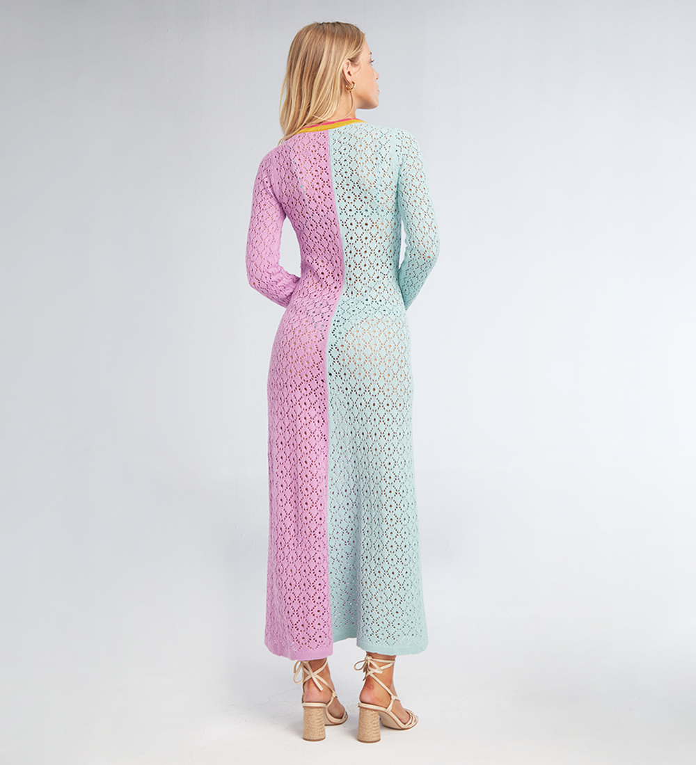 Alexandra is perfect for everything! Multicolor knitted dress, buttoned up, maxi length with the cutest details in crochet. Produced in a sustainable factory and handmade by Peruvian artisans.