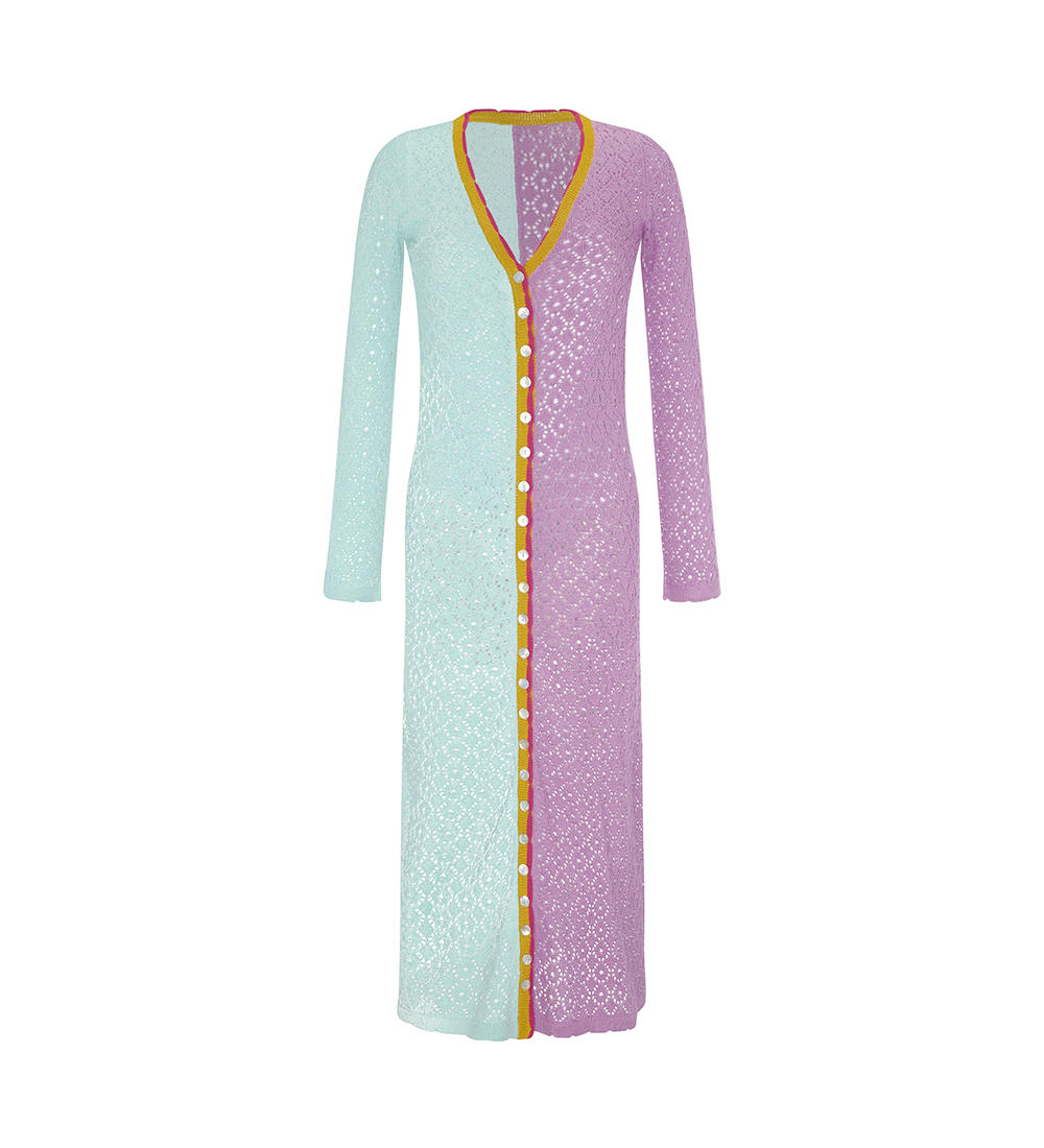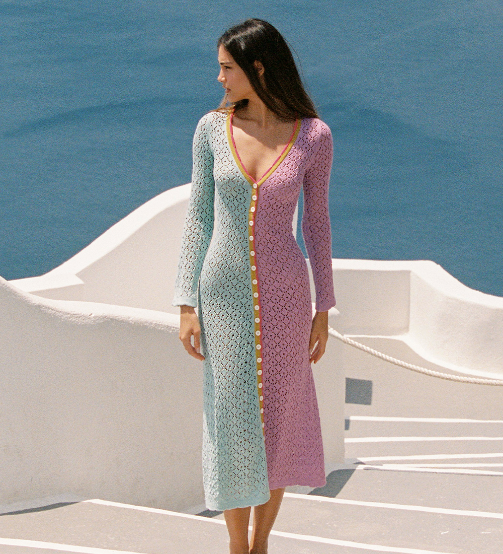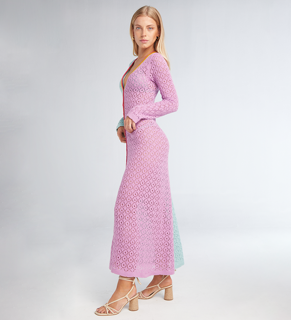 Alexandra is perfect for everything! Multicolor knitted dress, buttoned up, maxi length with the cutest details in crochet. Produced in a sustainable factory and handmade by Peruvian artisans.