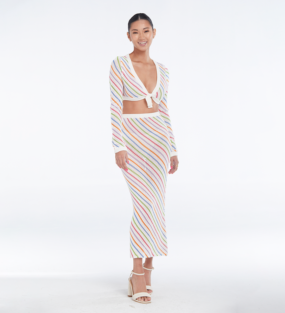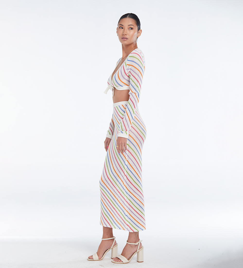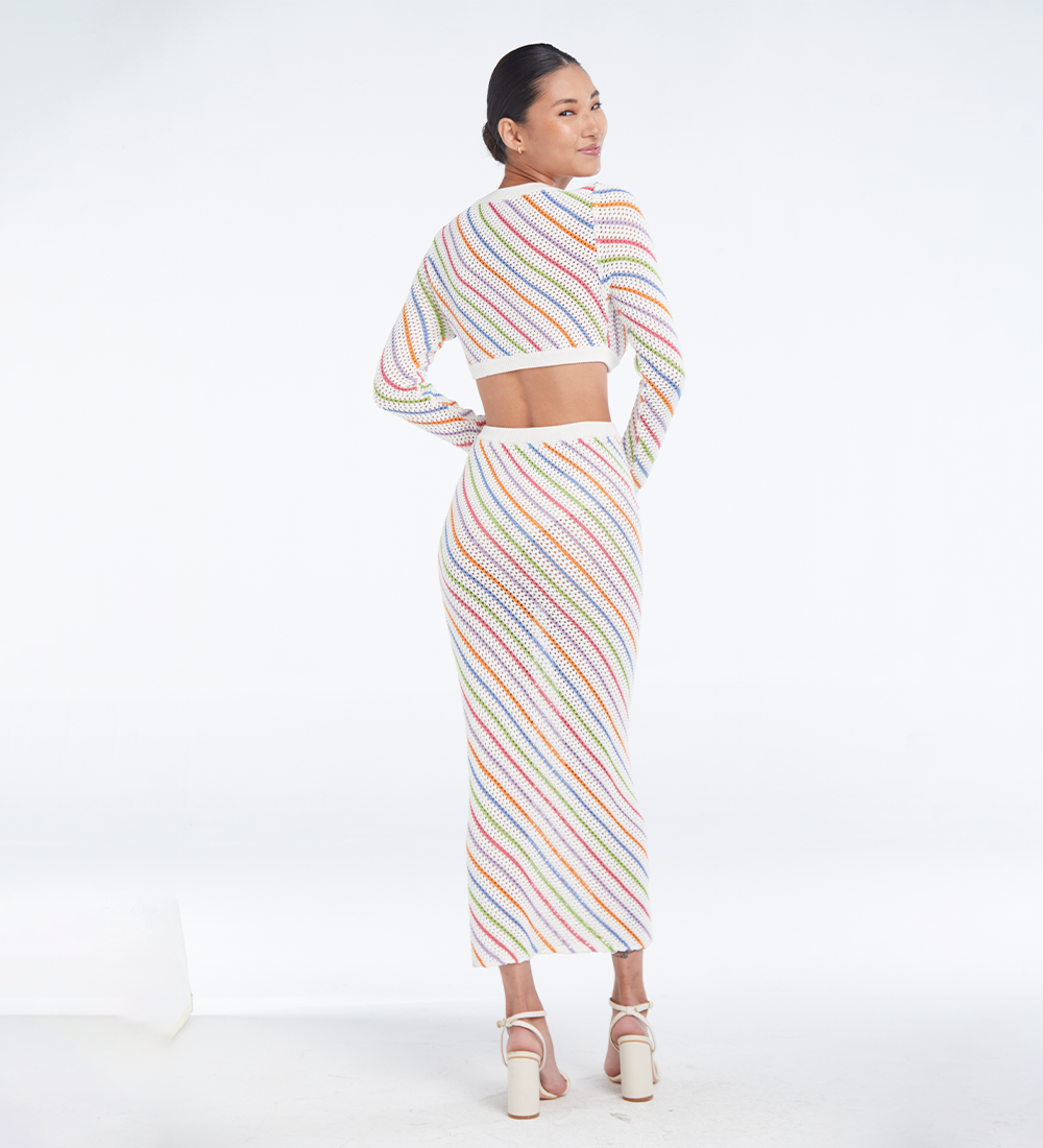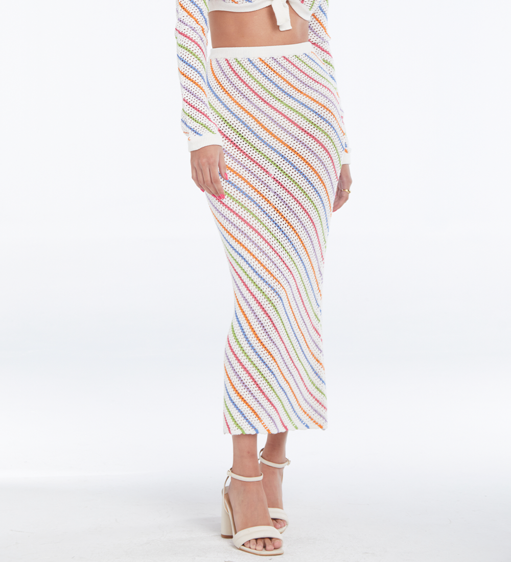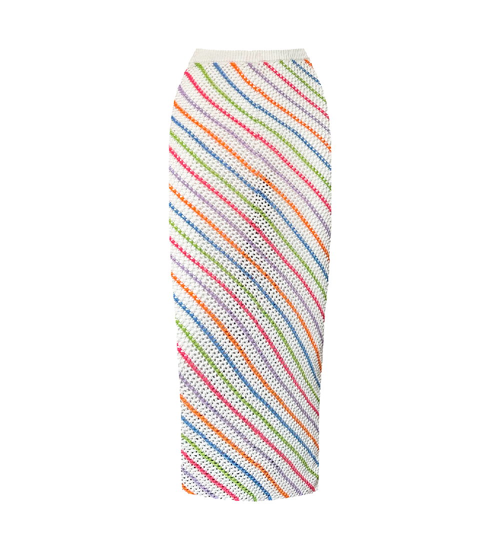 Bruna is what you were looking for. Ivory skirt with details in colored stripes with an ideal fit for any occasion. Produced in a sustainable factory and handmade by Peruvian artisans.