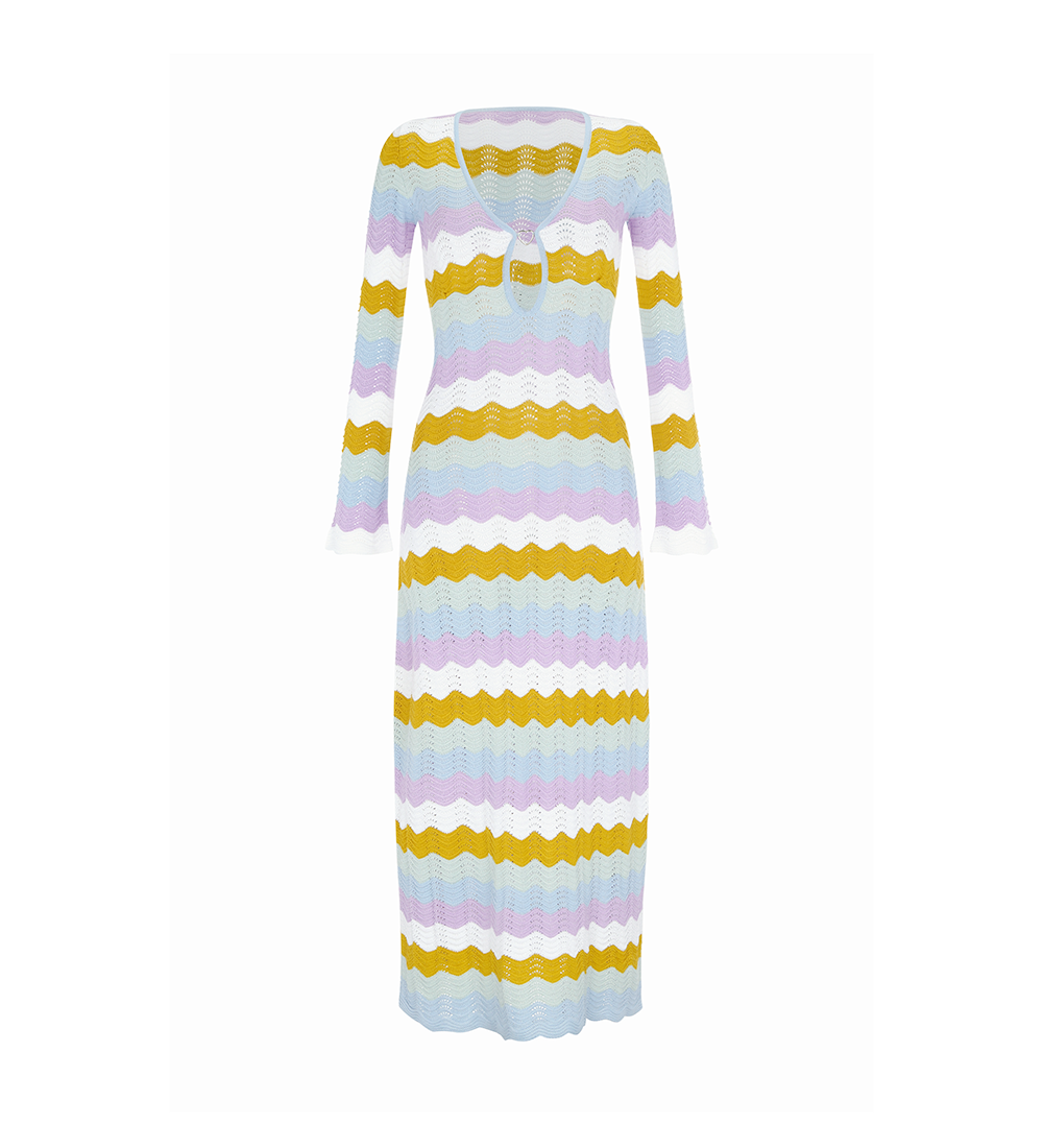 Attract all eyes with Ella. Multicolored crochet dress, maxi length and with a unique neckline with a heart-shaped detail. Produced in a sustainable factory and handmade by Peruvian artisans.