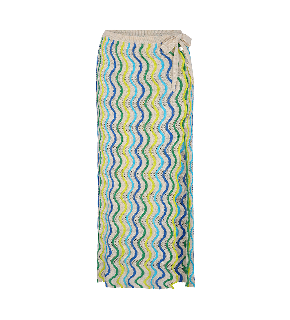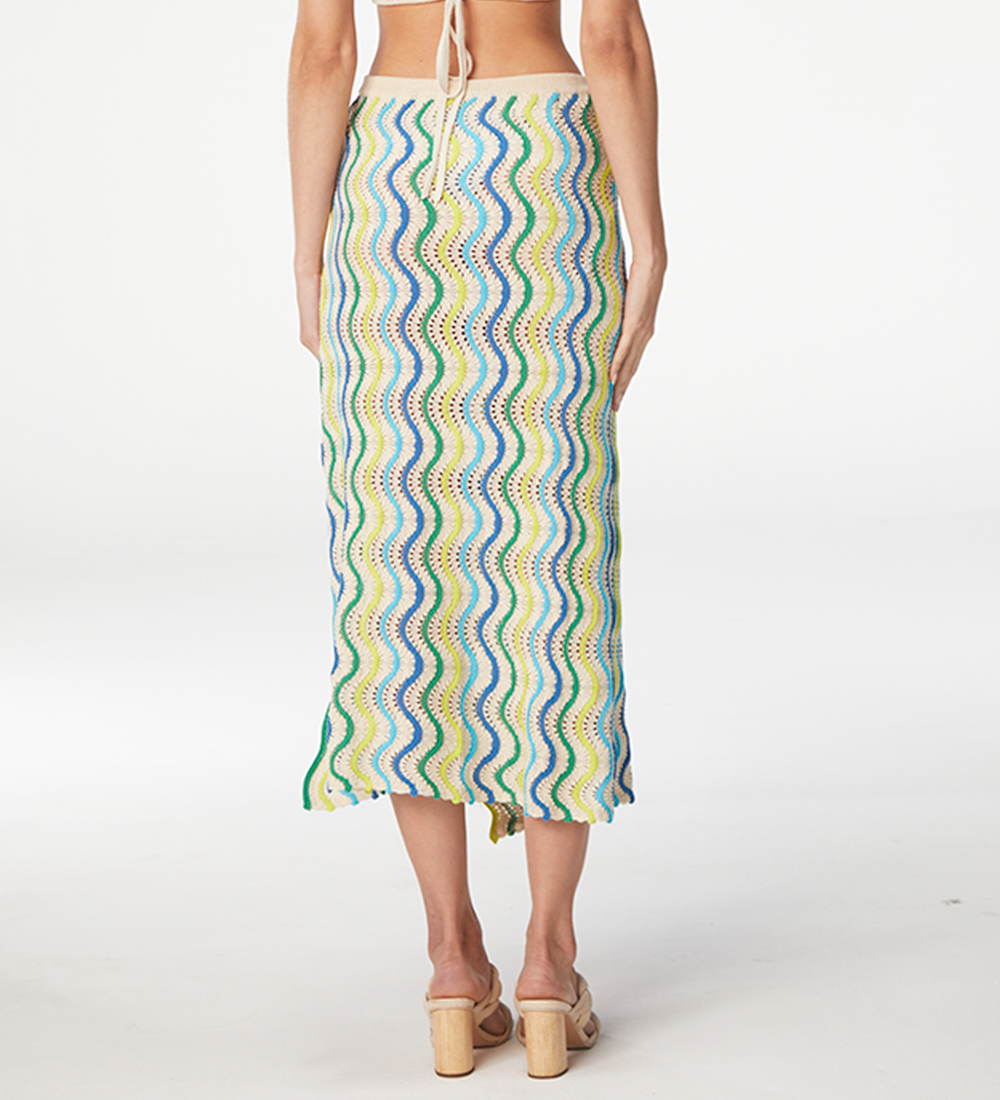 Set Jade is what you need for your summer afternoons. Knitted crochet midi skirt with colorful wave design, leg opening to make it sexy and button detail. Produced in a sustainable factory and handmade by Peruvian artisans.