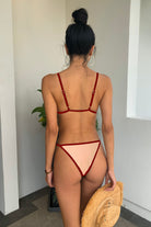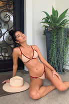 Looking for the perfect tanning bikini? Look no further! This stunning set features a gold clip on the top for push-up support and gold minimal adjustors on the bottom to customize the fit to your curves. Made from a soft nude mesh fabric, this bikini is sure to turn heads with its chic red and nude color blocking.