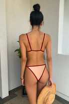 Looking for the perfect tanning bikini? Look no further! This stunning set features a gold clip on the top for push-up support and gold minimal adjustors on the bottom to customize the fit to your curves. Made from a soft nude mesh fabric, this bikini is sure to turn heads with its chic red and nude color blocking.