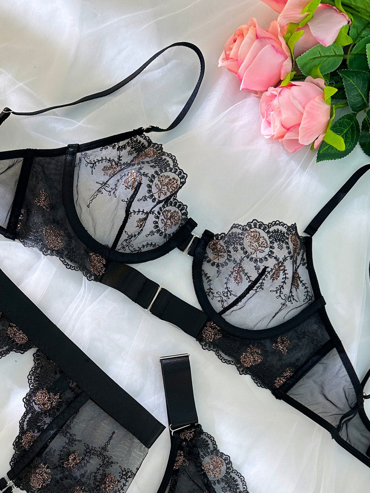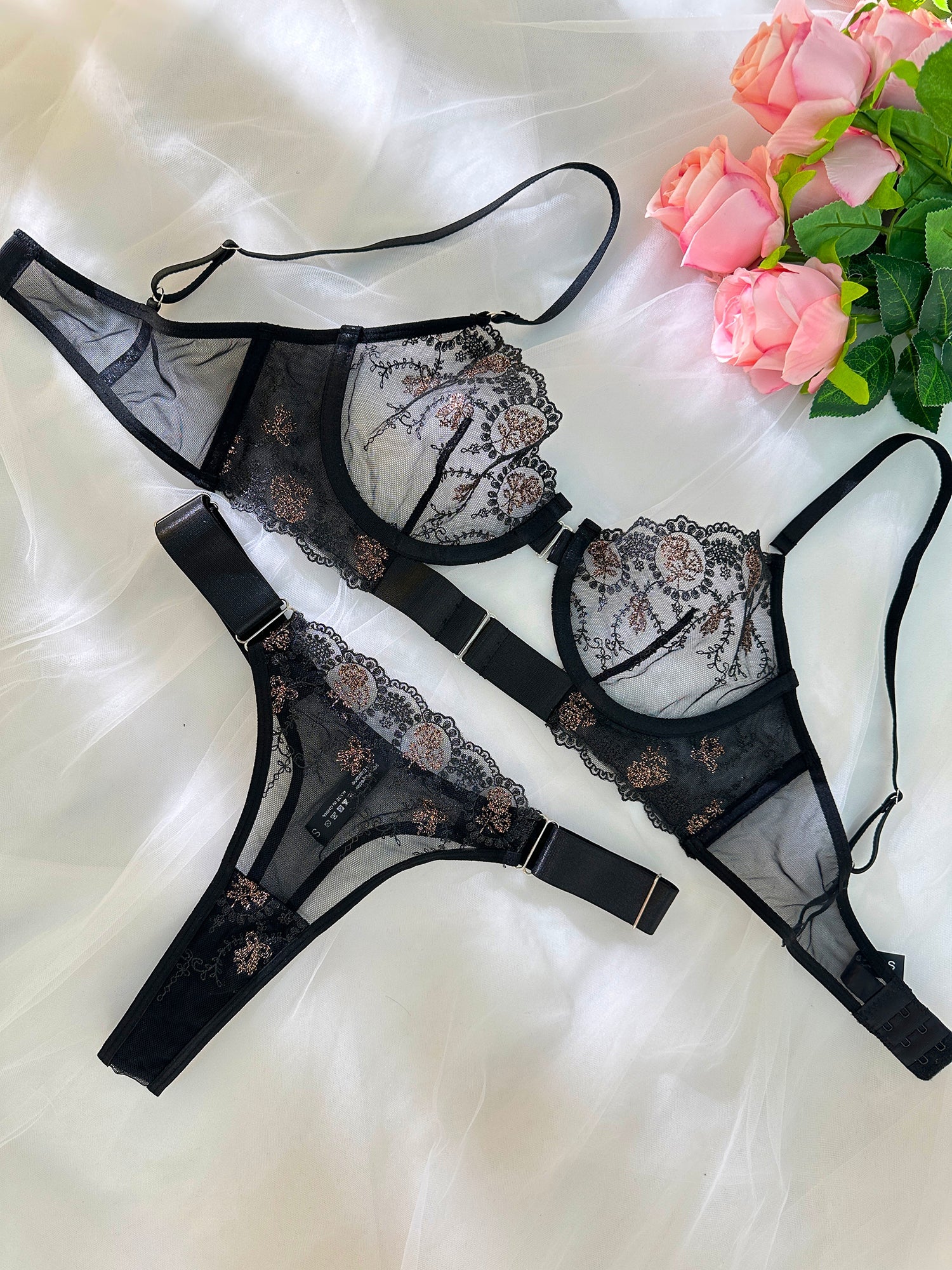 Sheer Black&Champagne Embroidered Lace Lingerie Set