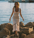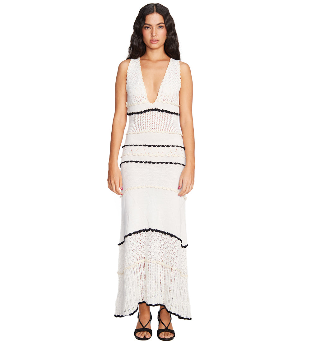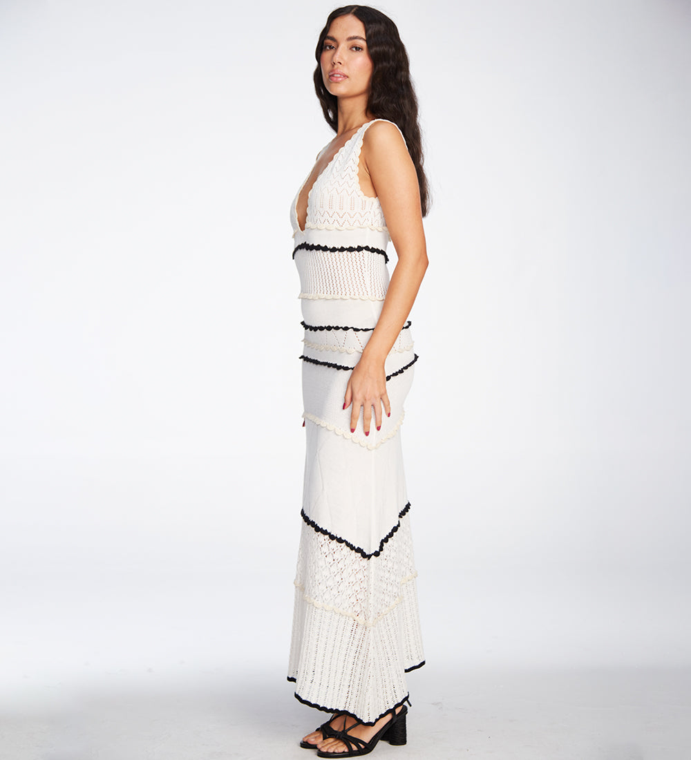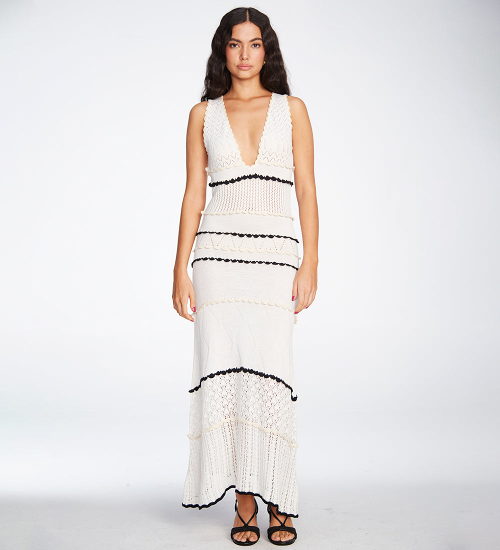 Maxi crochet dress in Ivory! It stands out for its elegant black contrast details that run along the fabric, creating a unique and sophisticated design.