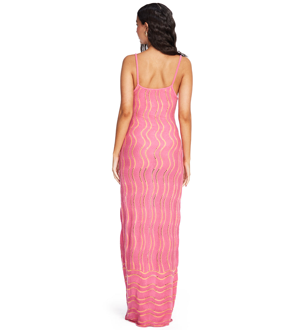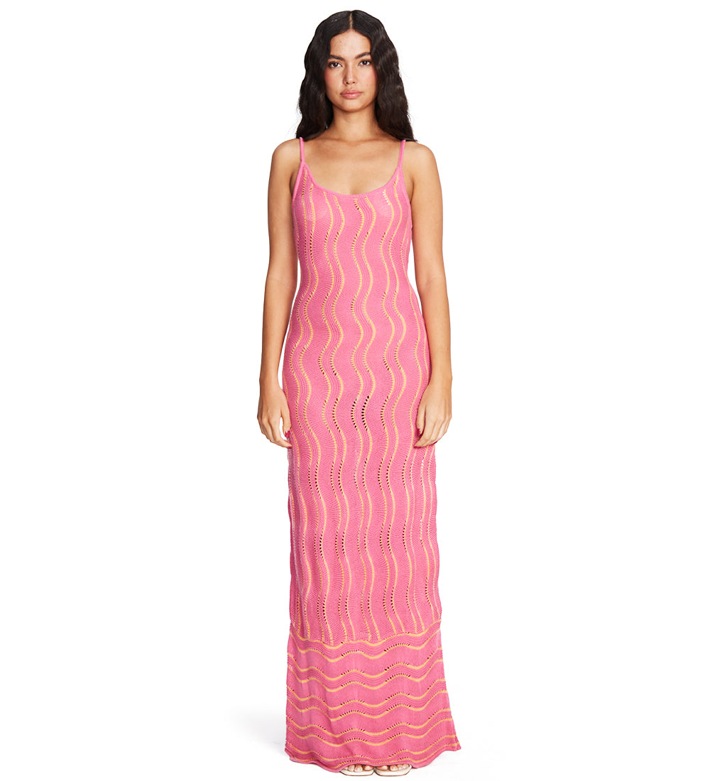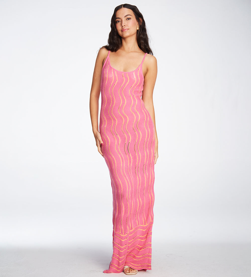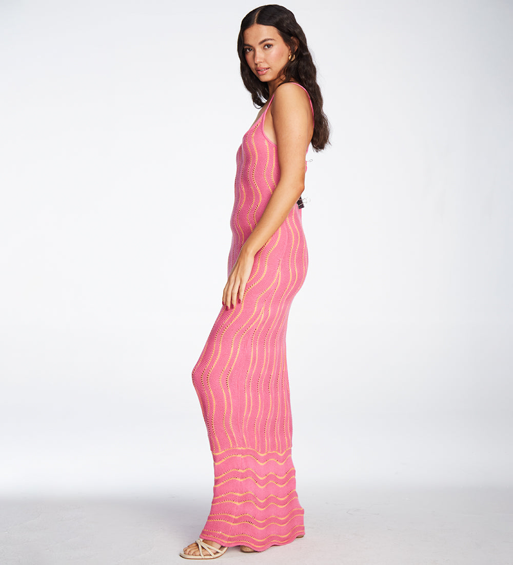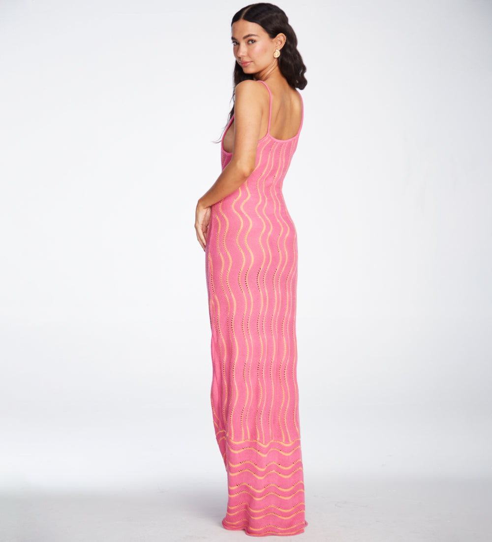 Our Alondra Pink dress is designed with delicate wave details throughout the fabric and thin straps that add a touch of elegance and sophistication. Perfect for highlighting your unique style.