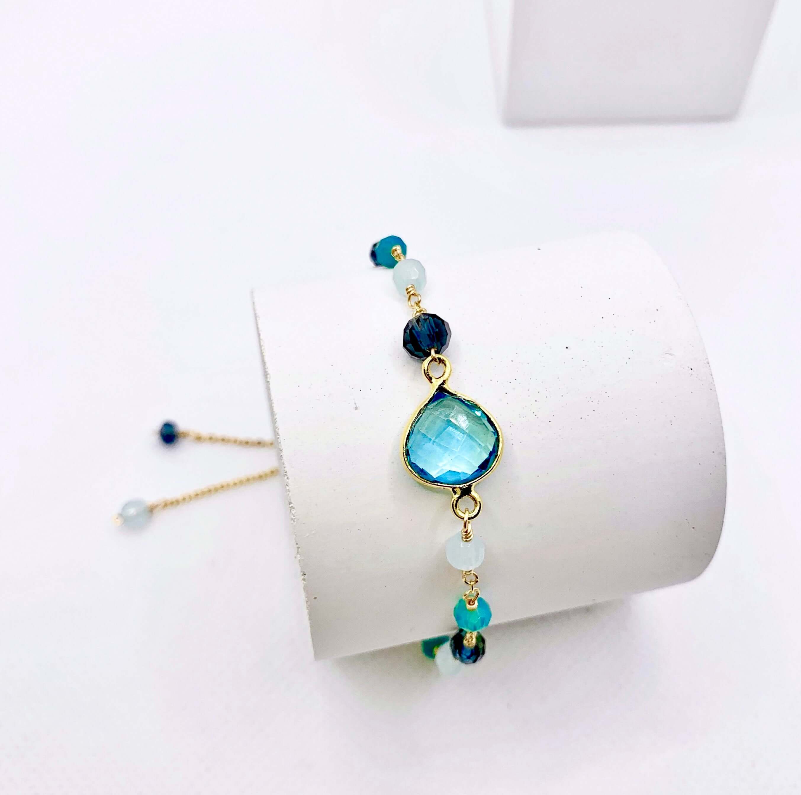 Adjustable, stackable and handmade with our signature Aquamarine Quartz and chalcedony, london blue quartz and turquoise quartz accents.