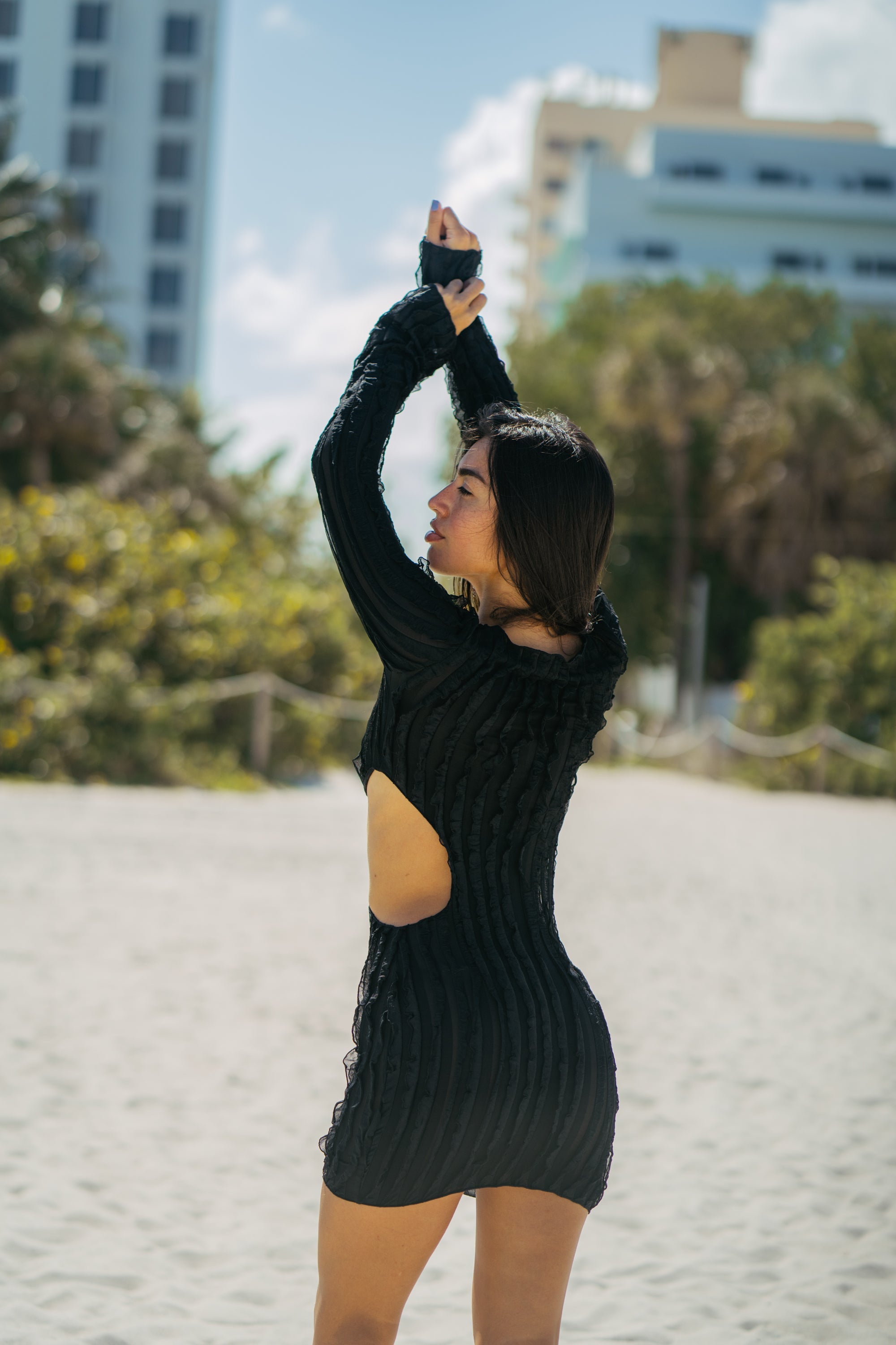 The Dove Coverup Dress in Black is the perfect semi-sheer coverup to take you from day to night. The cutouts on the waist will accentuate your curves! Featuring long sleeves and a textured fabric that will have you standing out in the crowd.