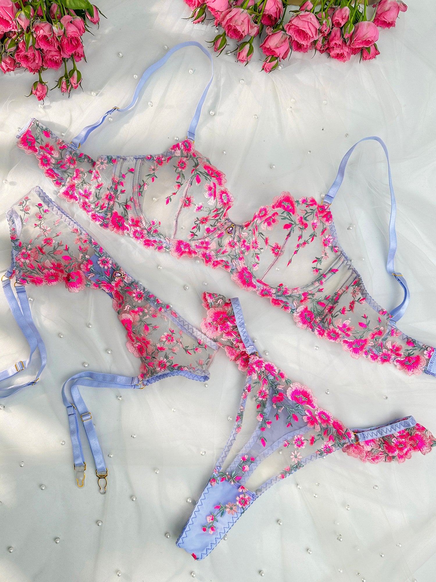Fantasy Pink Bloom Embroidery Lingerie Set