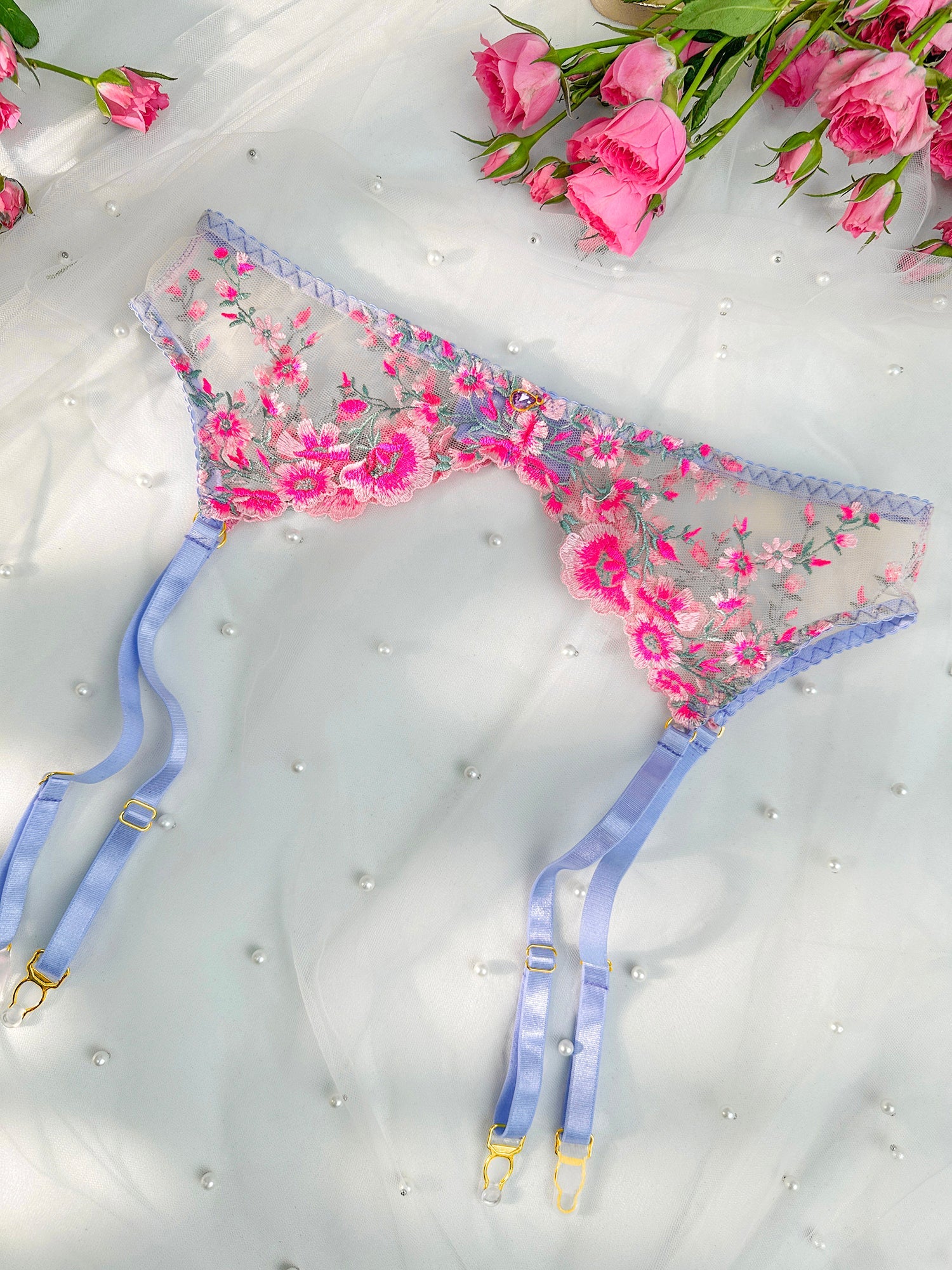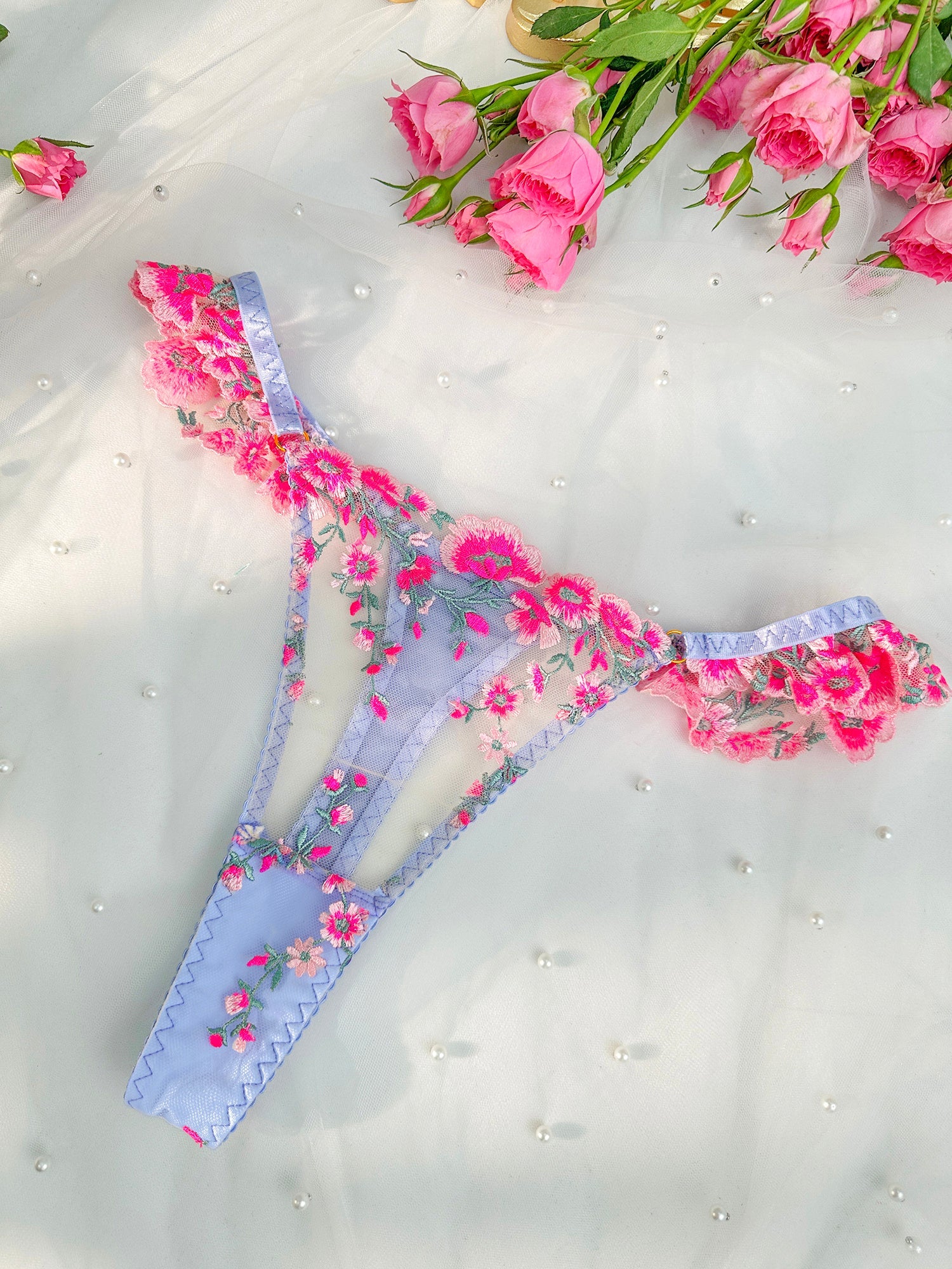 This lingerie masterpiece features vibrant pink floral embroidery that radiates with a passionate allure, elegantly paired with soft lavender straps and trims. The delicate lavender pendants add a touch of whimsical charm, creating a harmonious blend of bold color and gentle sophistication. Each detail weaves a story of romance and elegance, making this piece a captivating celebration of sensuality.🌸💜