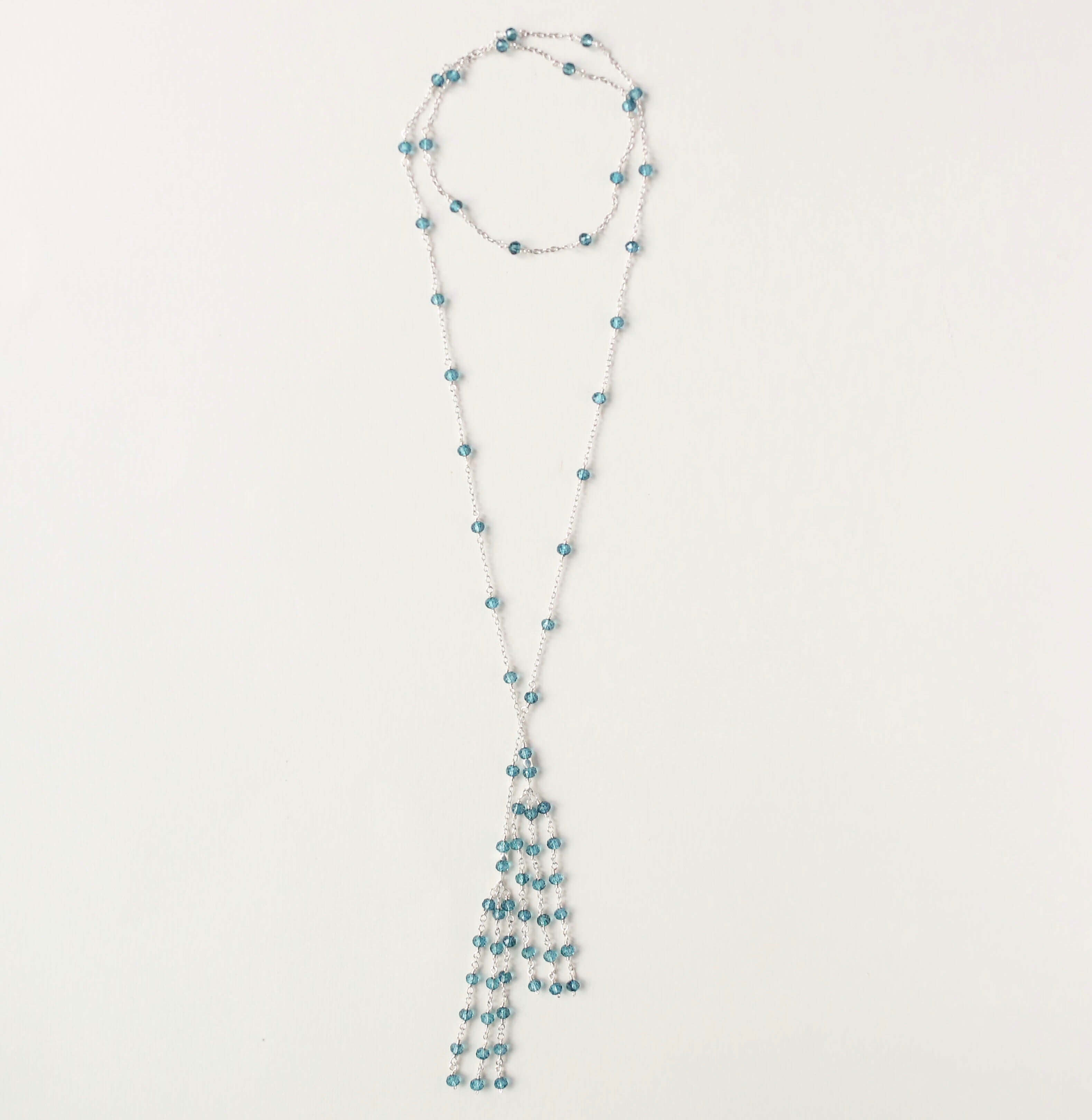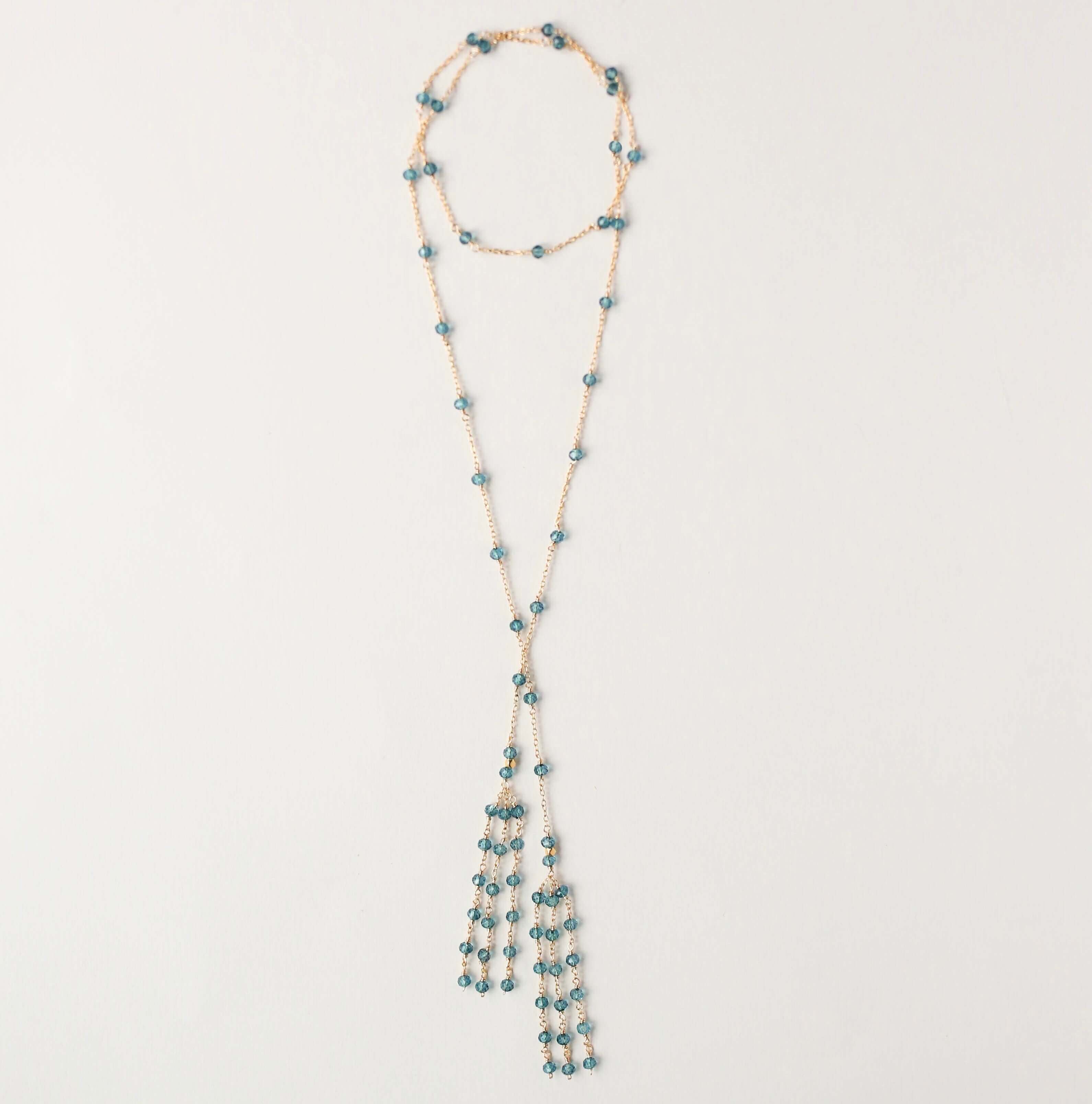 Delicate lariat necklace made with london blue quartz gemstones and finished off with a beautiful tassel design.