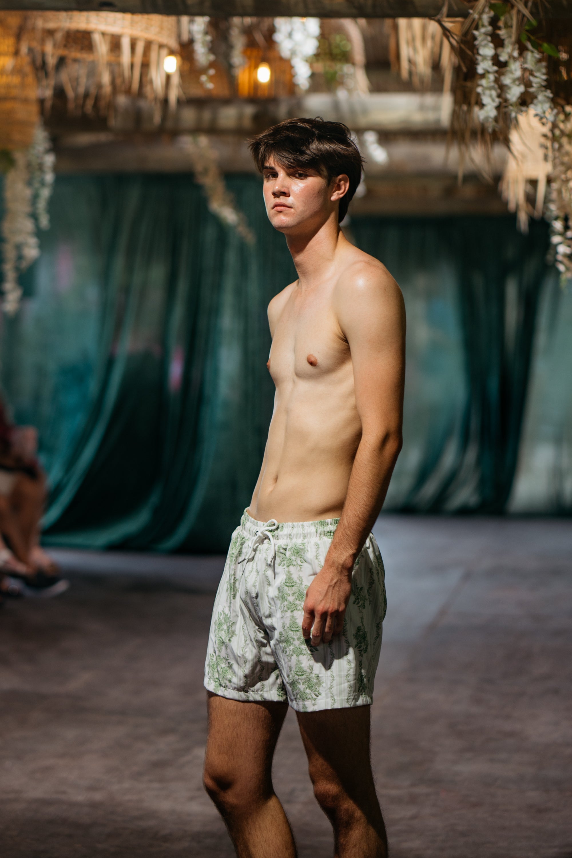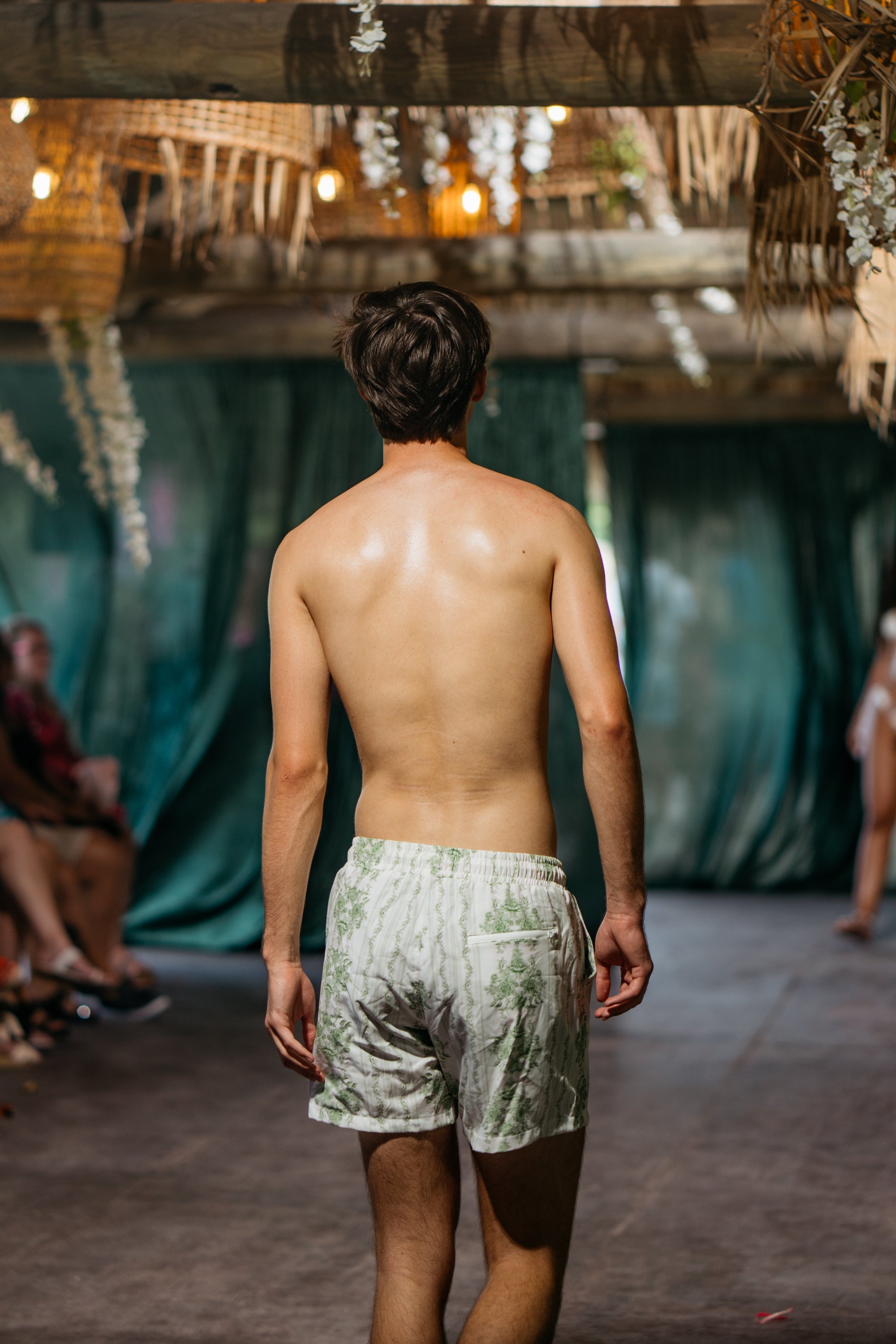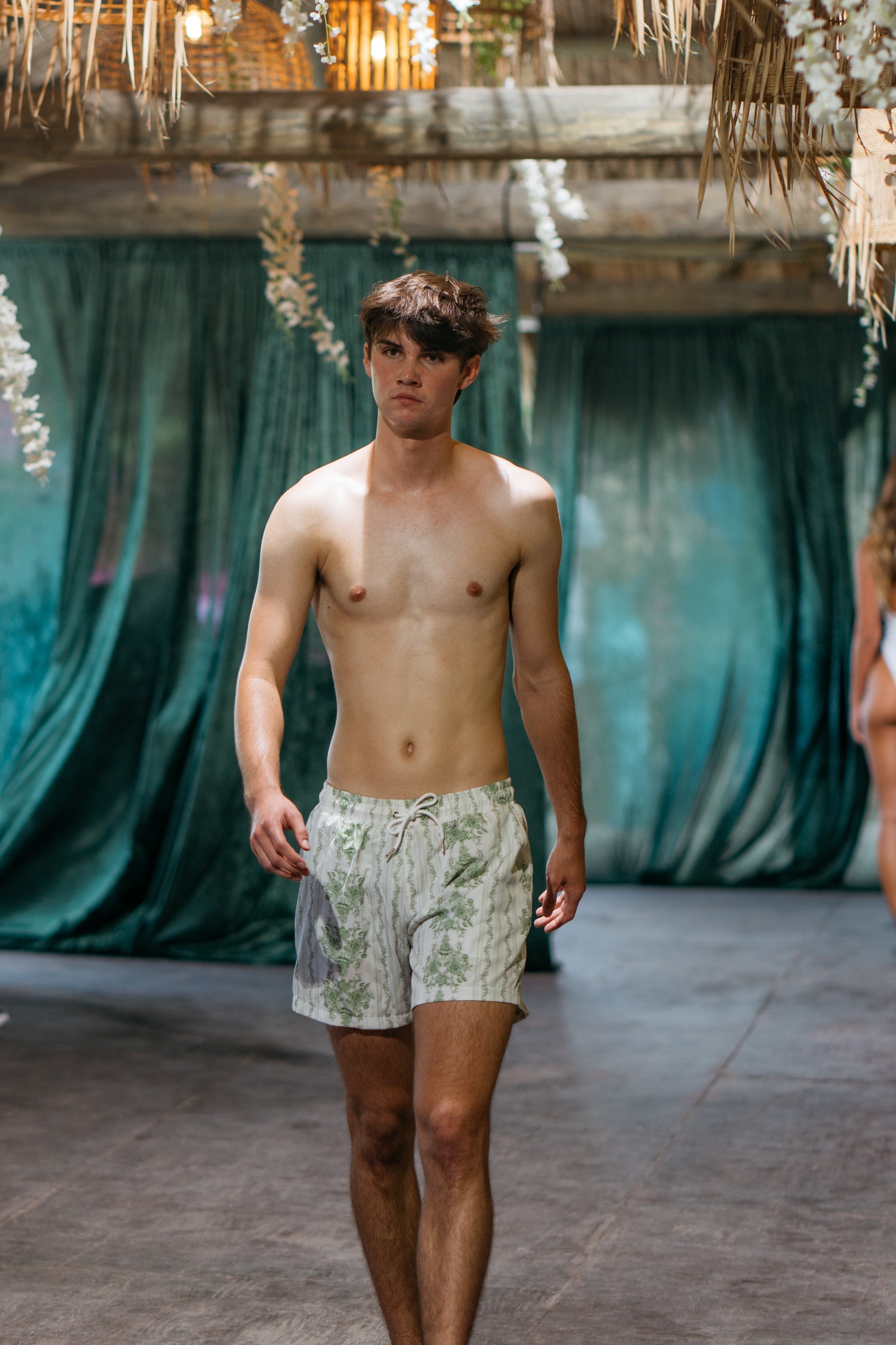 Our Miami Swim Week runway model Ryan is 6’4” with a 31” waist and 37” hips- he wears a size medium.