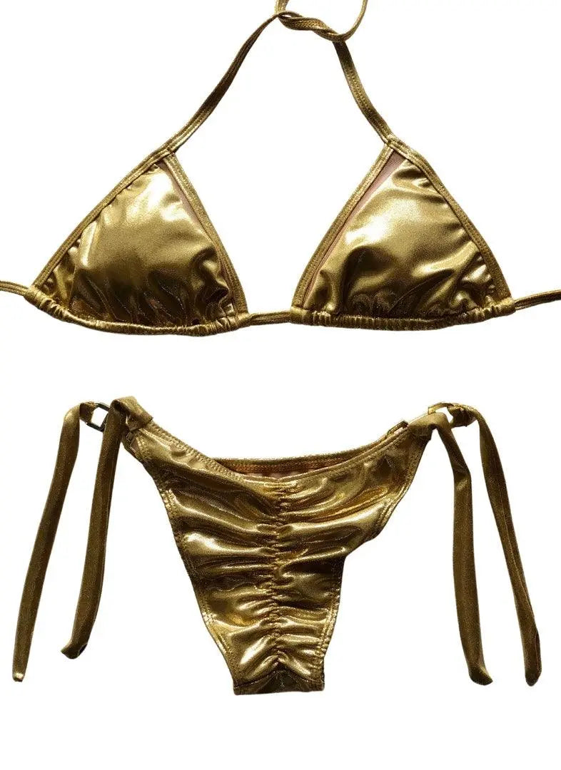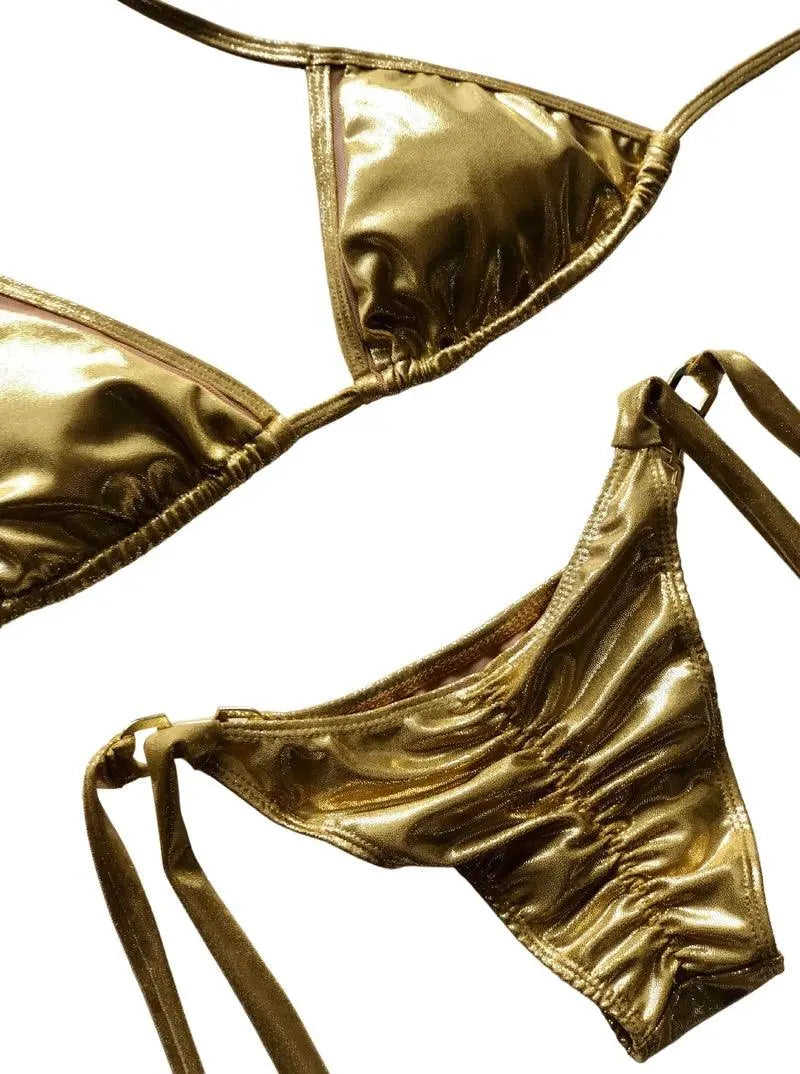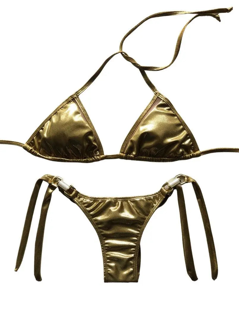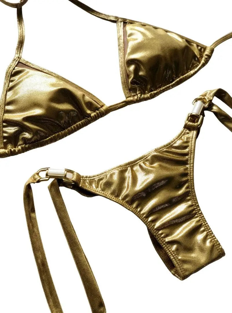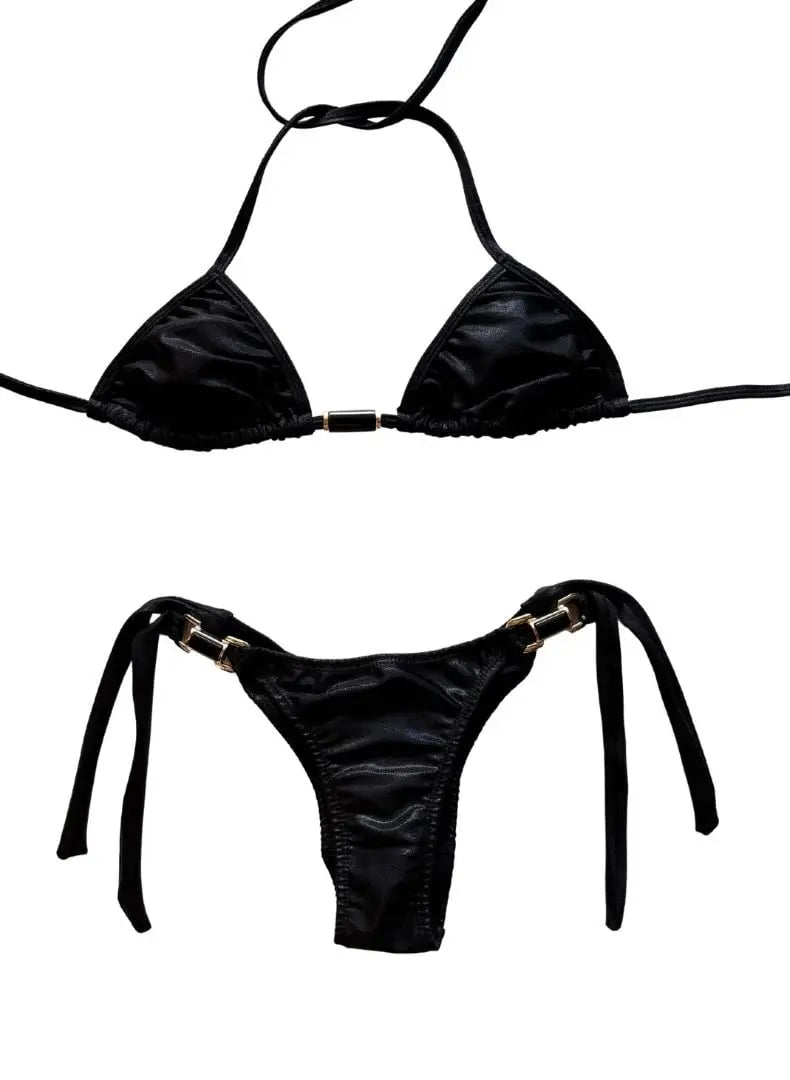 The Alice Top features a classic, non-padded triangle design with adjustable ties at the neck and back for a personalized fit. The gold version is elegantly complemented by a mesh overlay, while the black version is adorned with a stylish gold and black ornament.