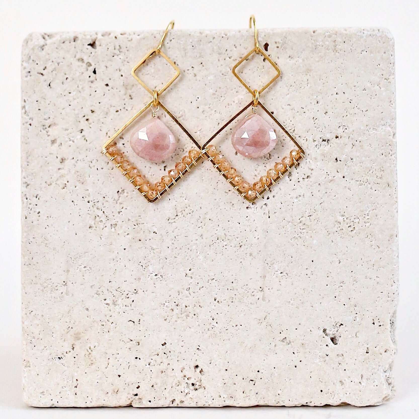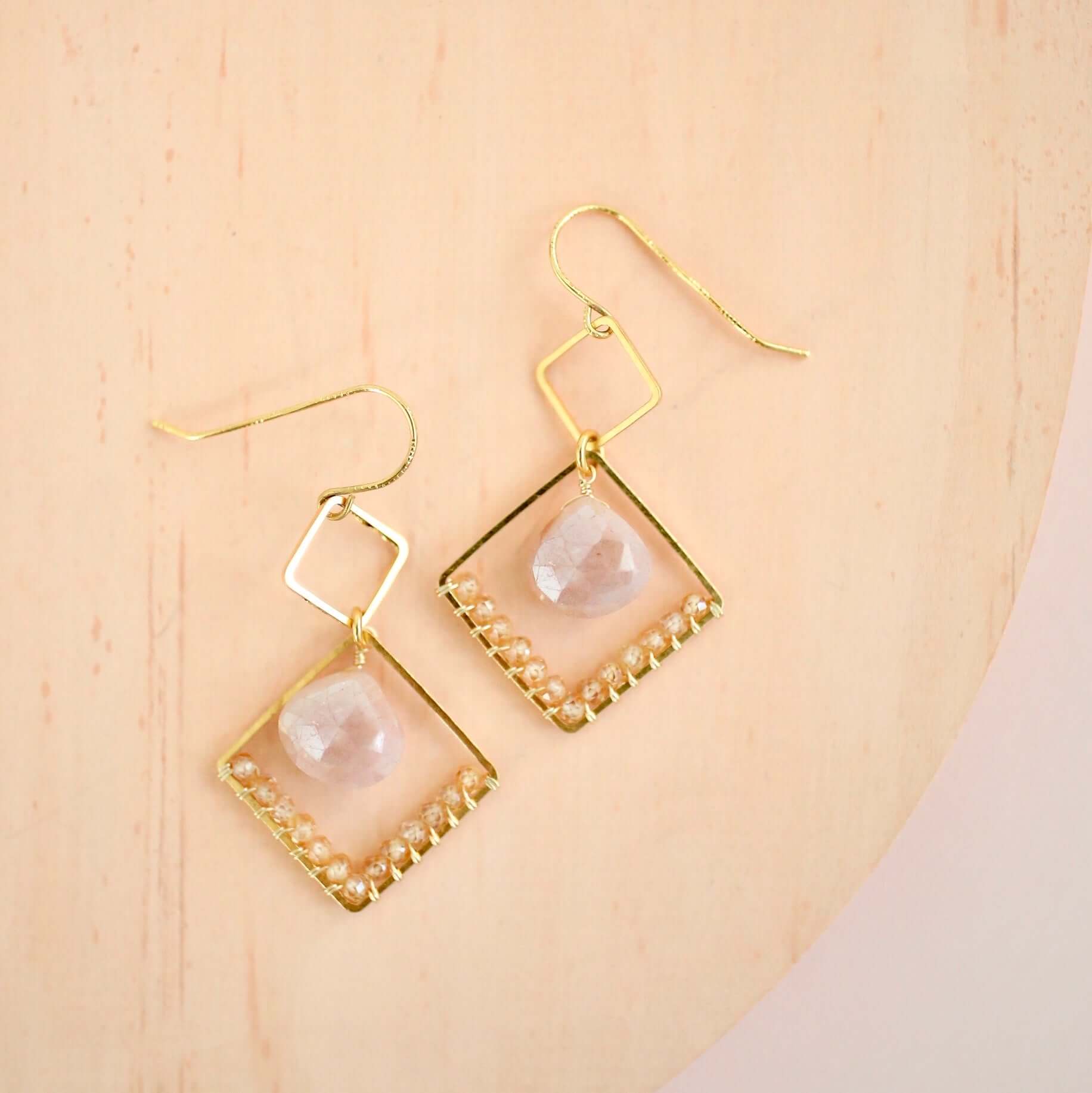 Easy-to-wear gold triangle earrings with peach moonstone and champagne quartz gemstones.