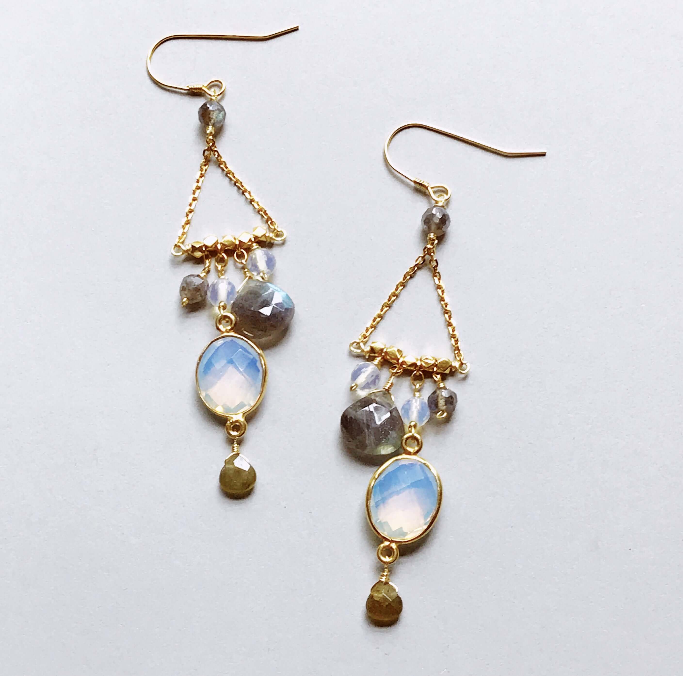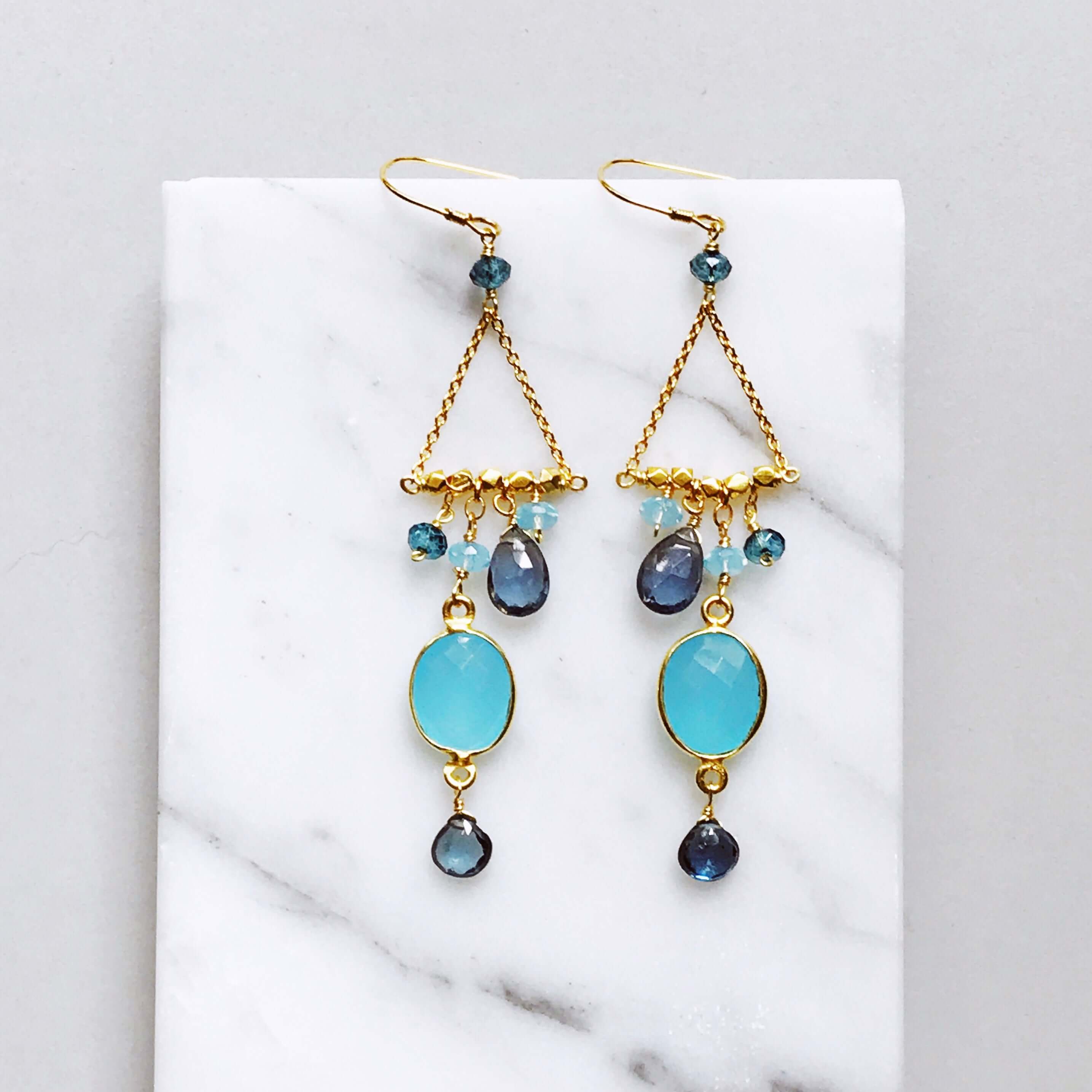 Our "chandies" are a modern take on classic chandelier earrings, using gemstone color combos and varying stone shapes and sizes.