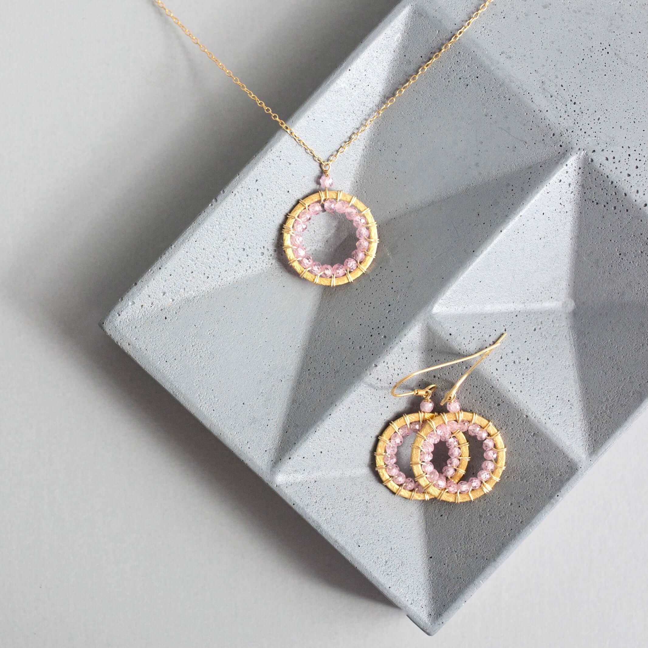 The mini version of our exclusive Mason Circle Collection. Our pretty mini circle eternity necklace+ mini hoops all featuring shimmering pink rose quartz gemstones.