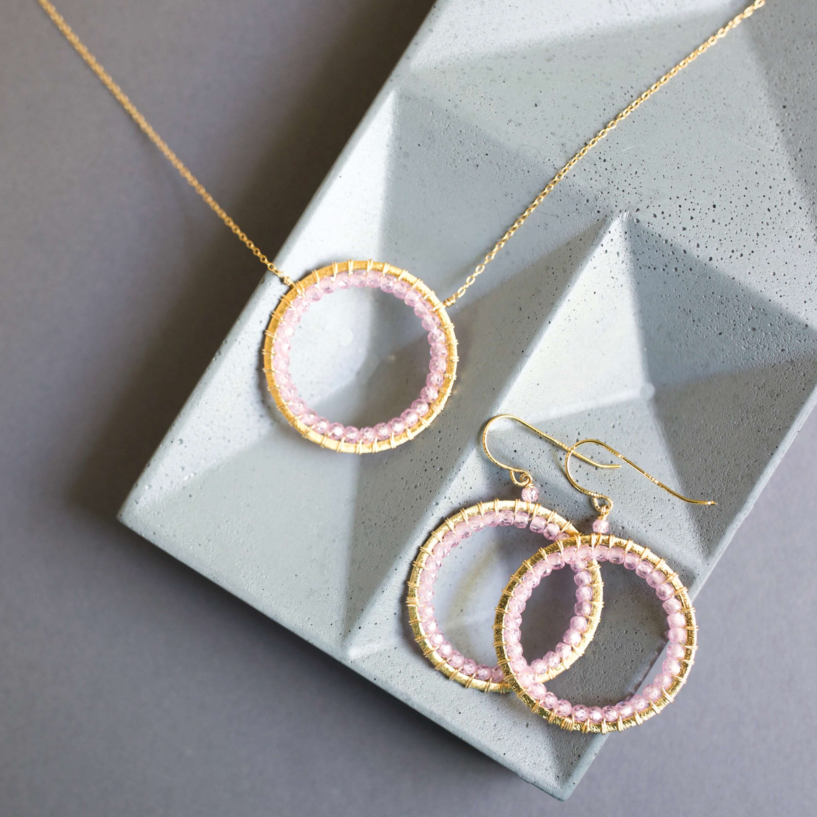 The Halo collection was our very first one. Intended to symbolize the intricate, universal energy woven within us all. This beautiful necklace is ultra lightweight and perfectly handmade featuring sparkling Rose Quartz gems woven into our unique floating pendant design.