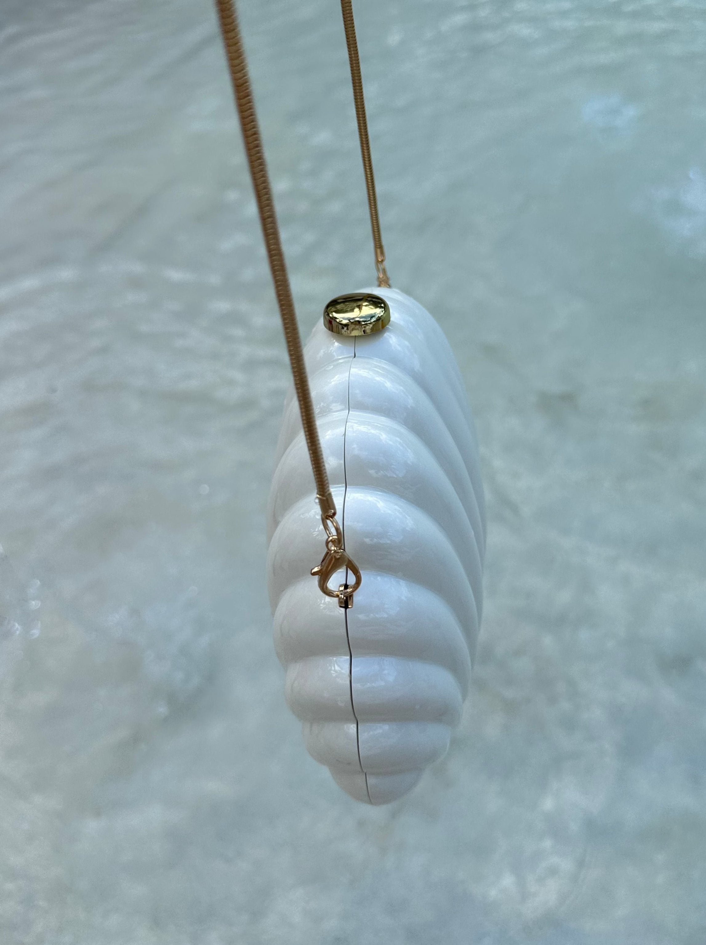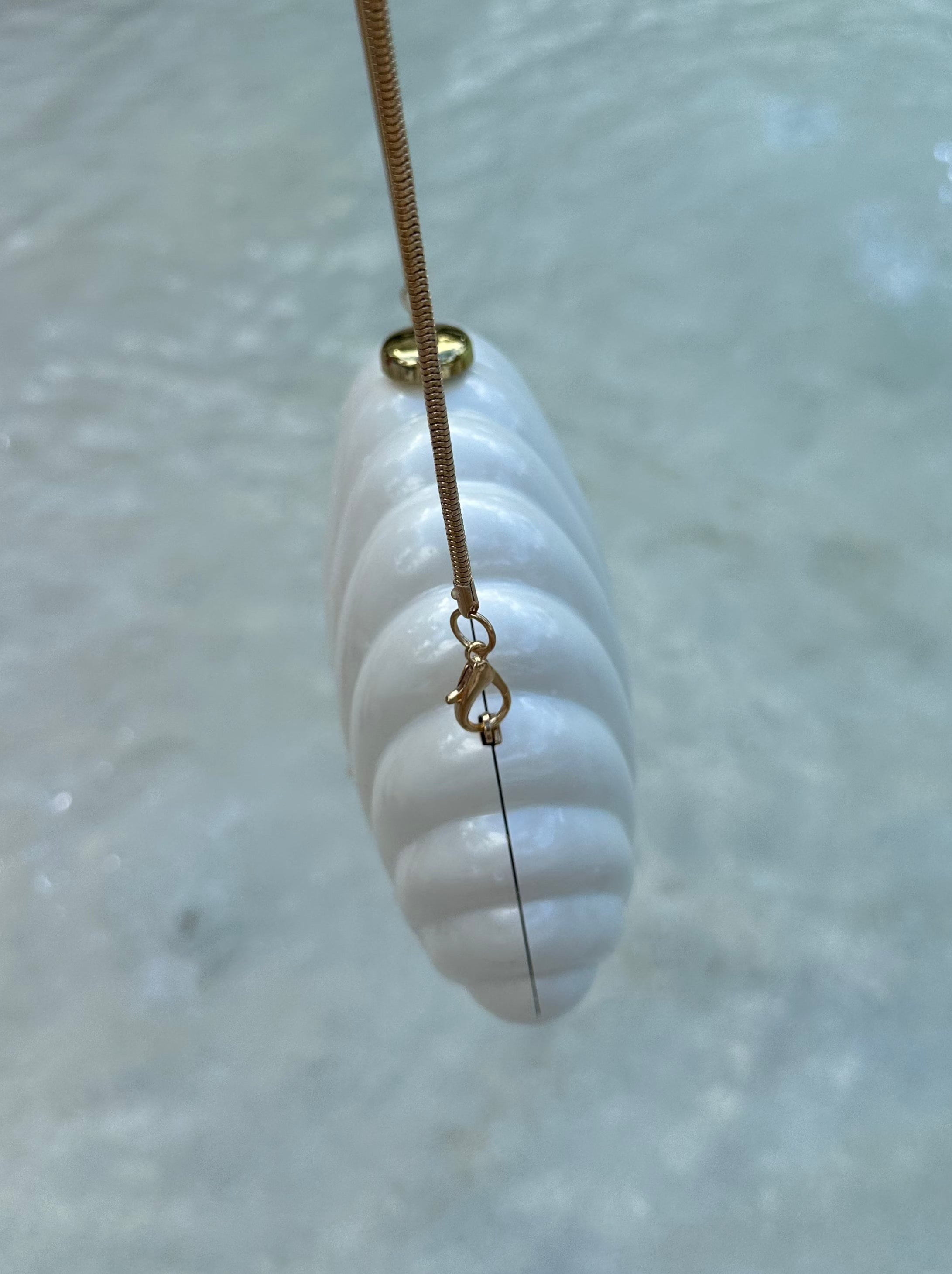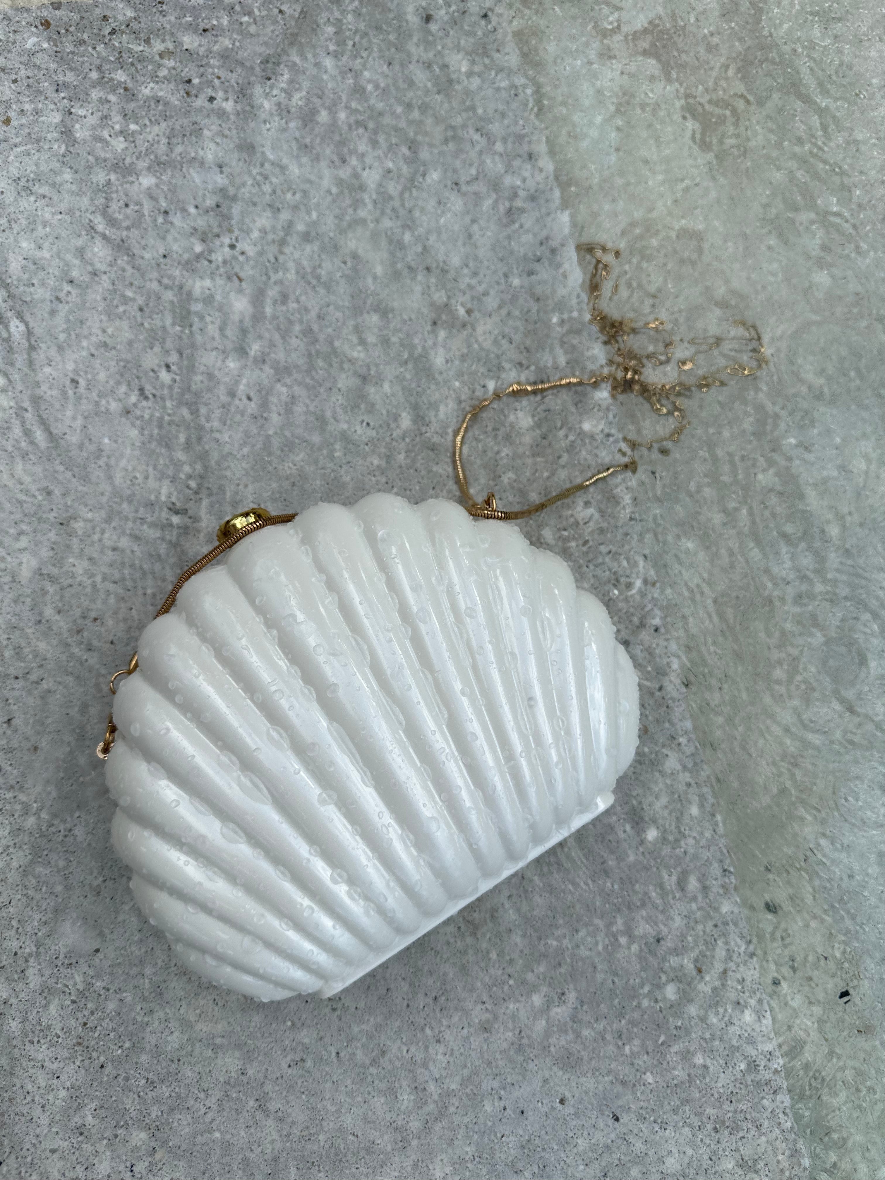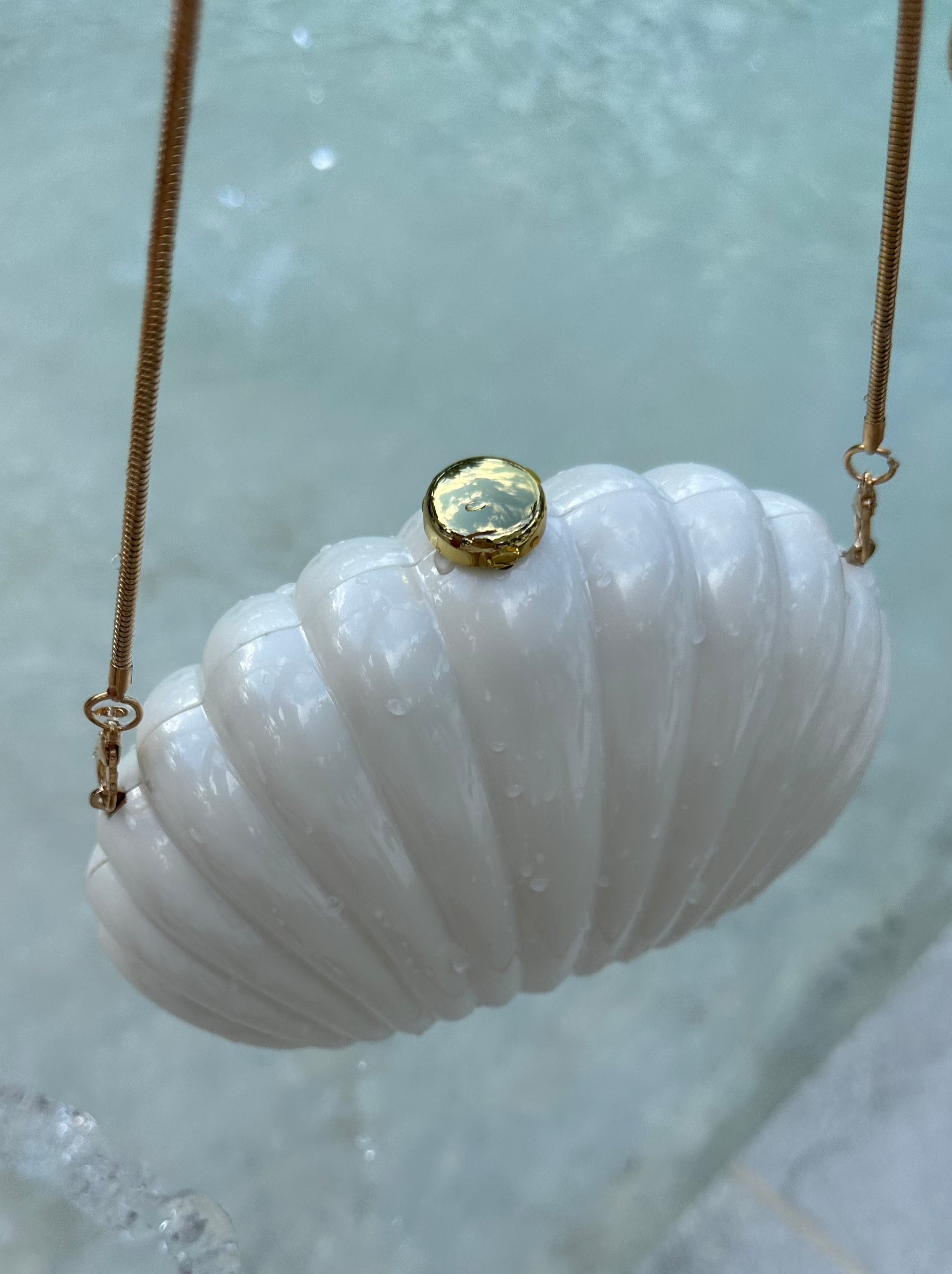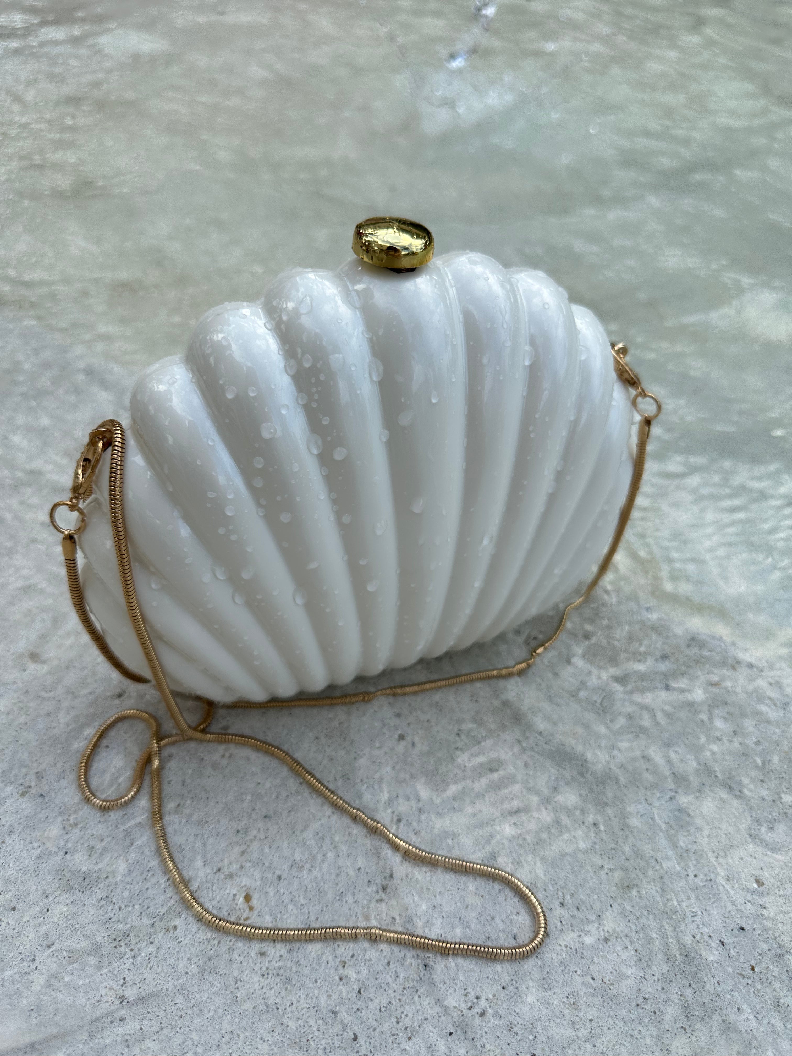 Embrace seaside charm with the water durable Seashell Purse in Pearl White. The seashell shaped exterior featuring gold hardware is the perfect accessory to turn heads. The fabric lined material and detachable chain ensures functionality.