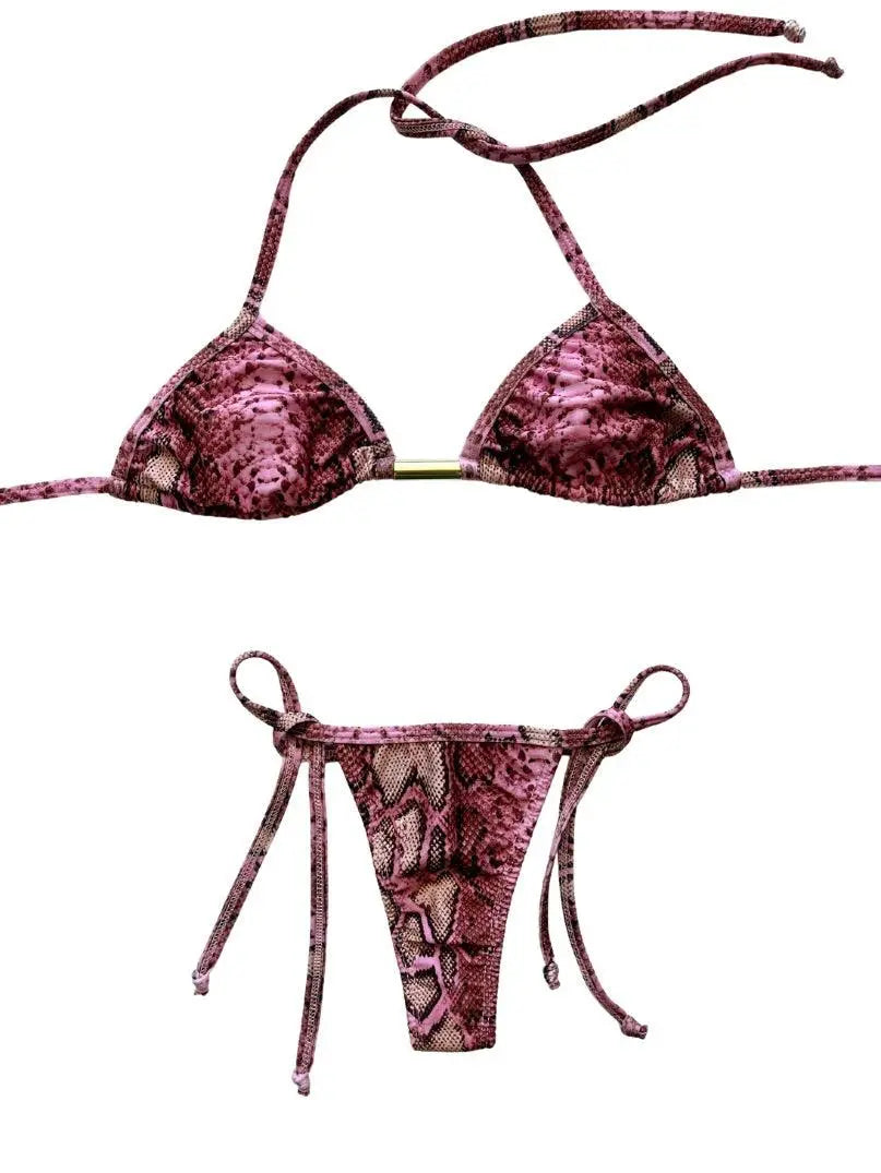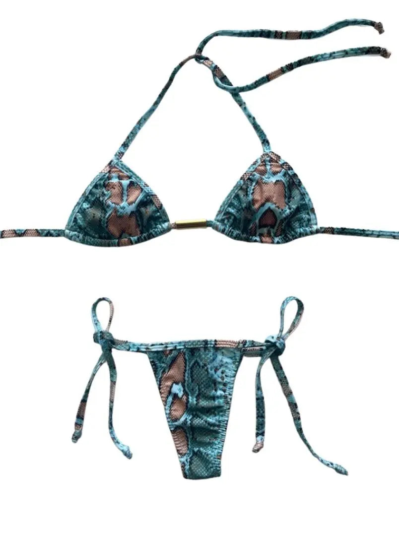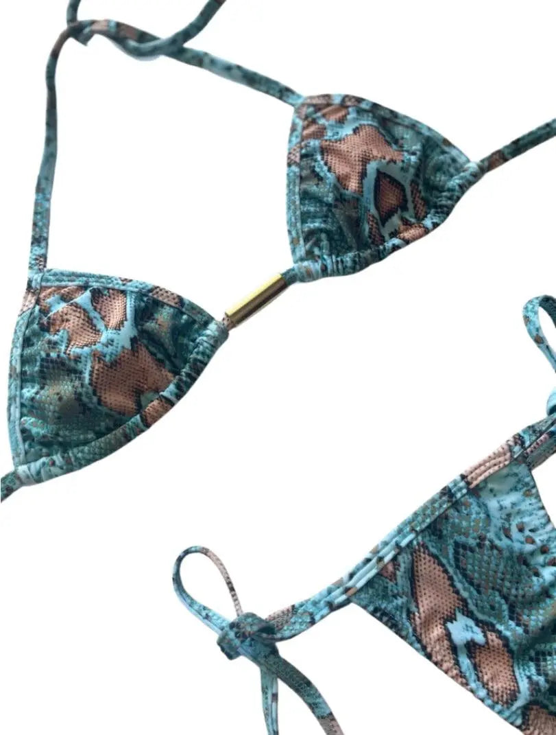 The Alice Top is a non-padded top with a timeless triangle design, complemented by a gold ornament. Adjustable ties at the neck and back for a personalized fit.