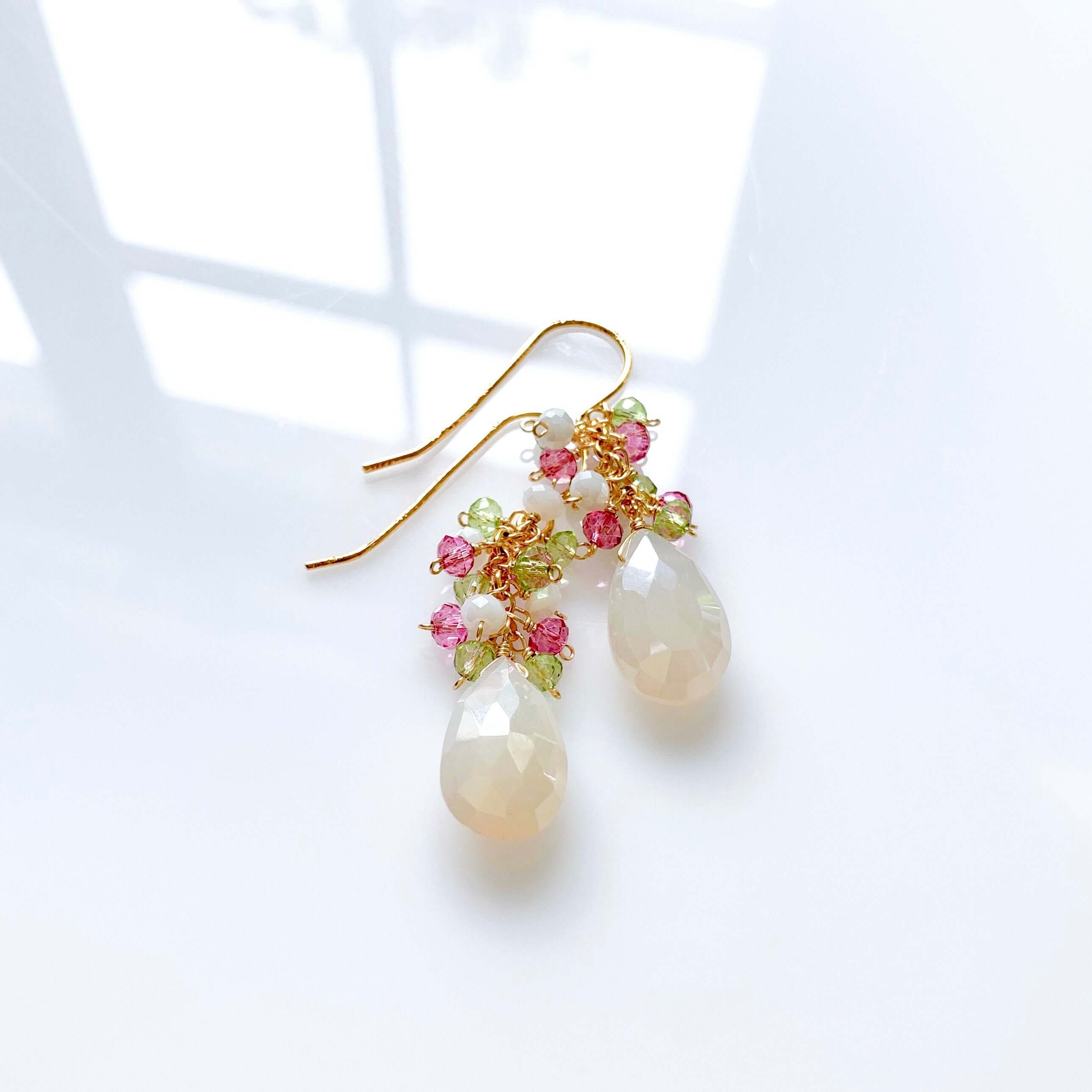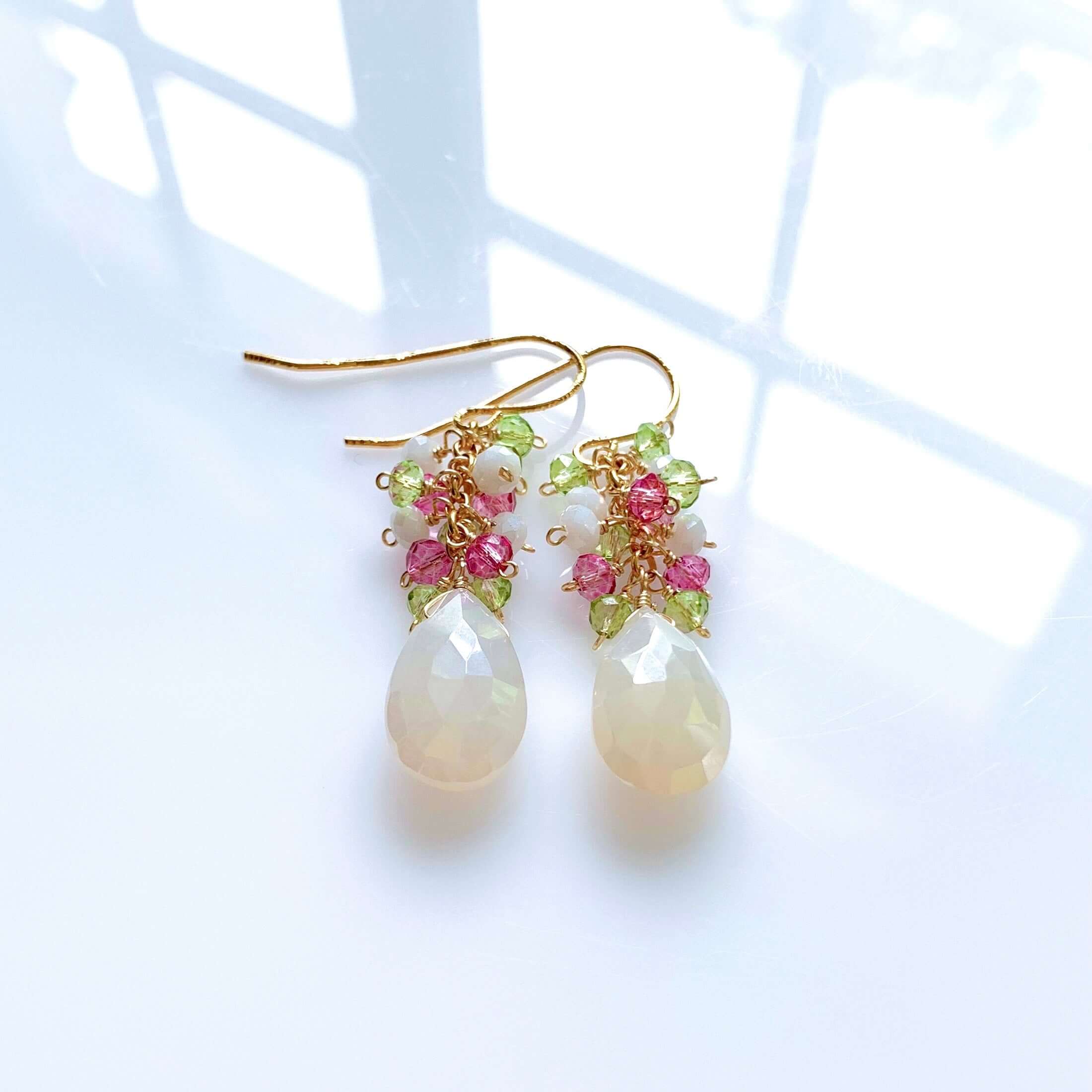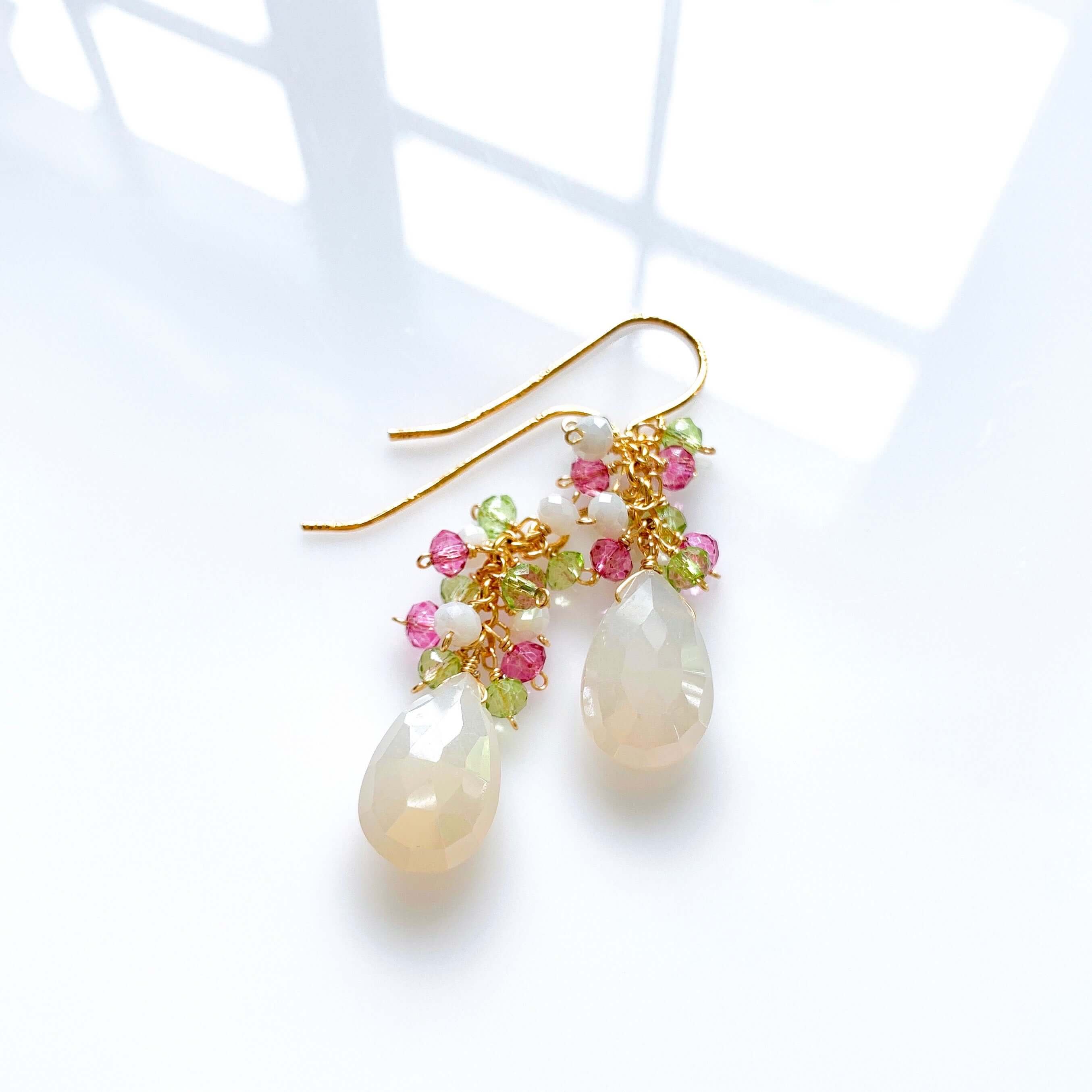 Shimmering white stones topped with a peridot, pink tourmaline and pearl cluster of gems.