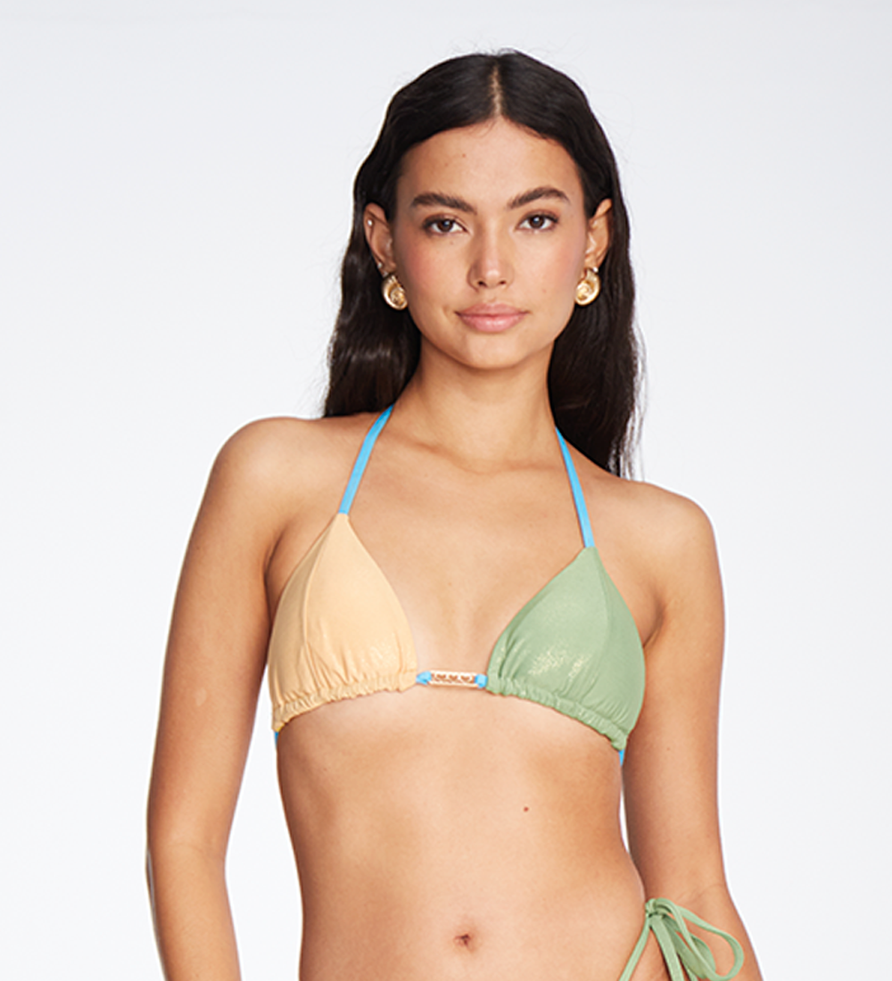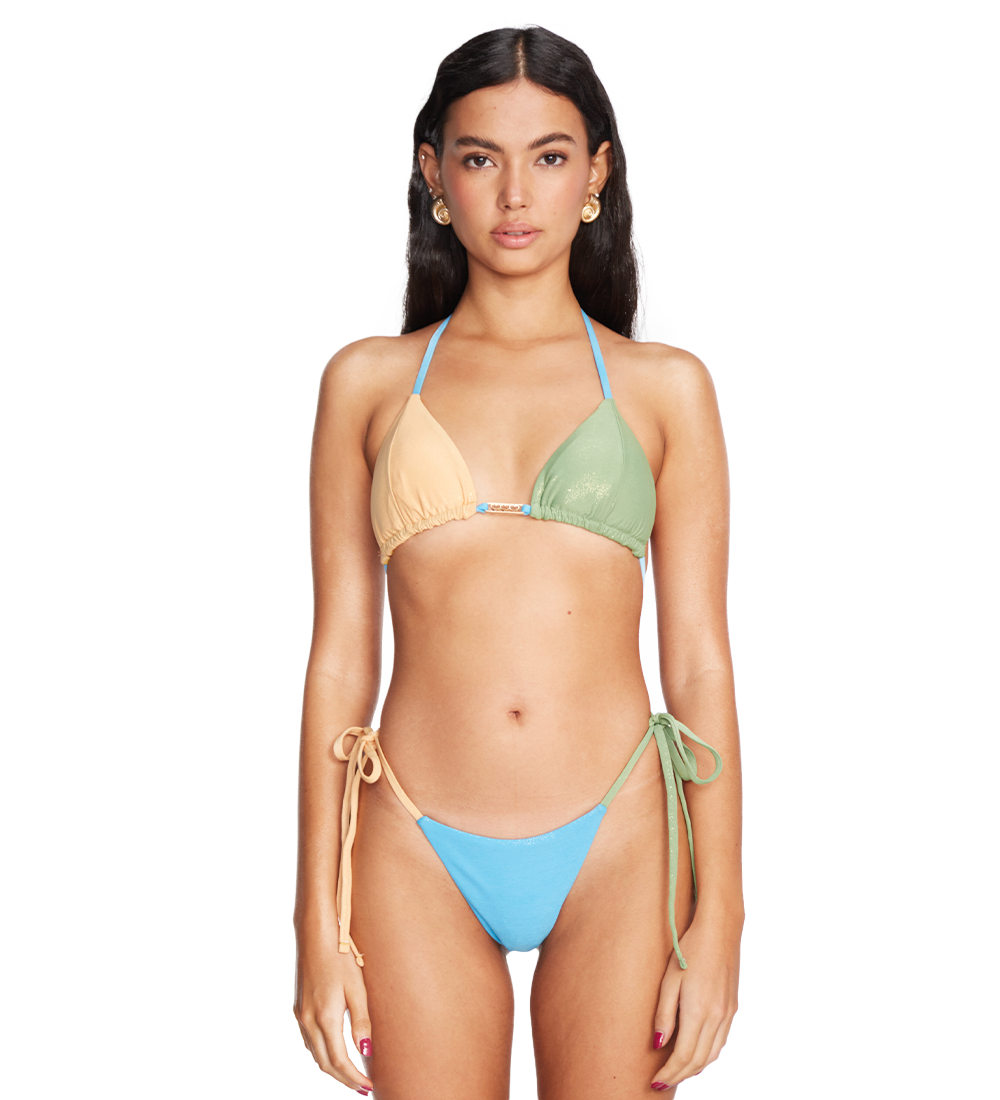 Shine in the sun with our Color Block Bikini. Shiny details in shades of blue, green and yellow catch the light, while the contrasting straps add a modern and comfortable touch. A must-have for those looking for style and versatility on the beach, produced in a sustainable factory and handmade by Peruvian artisans.