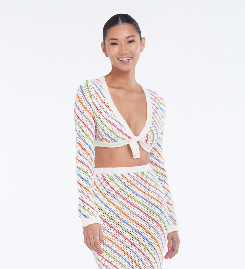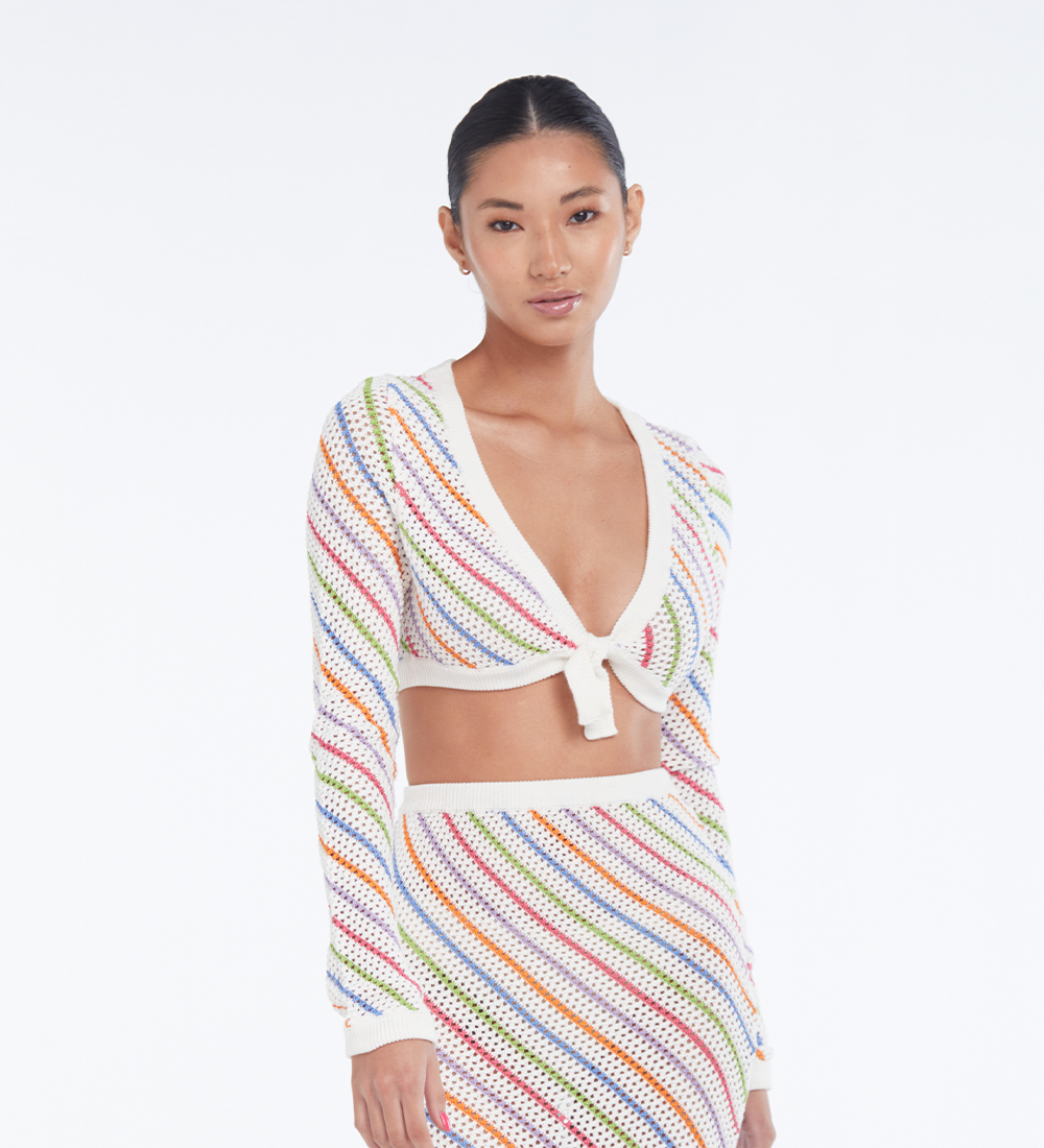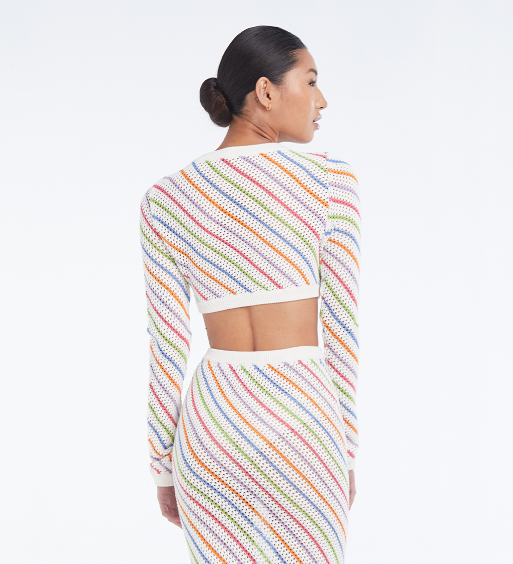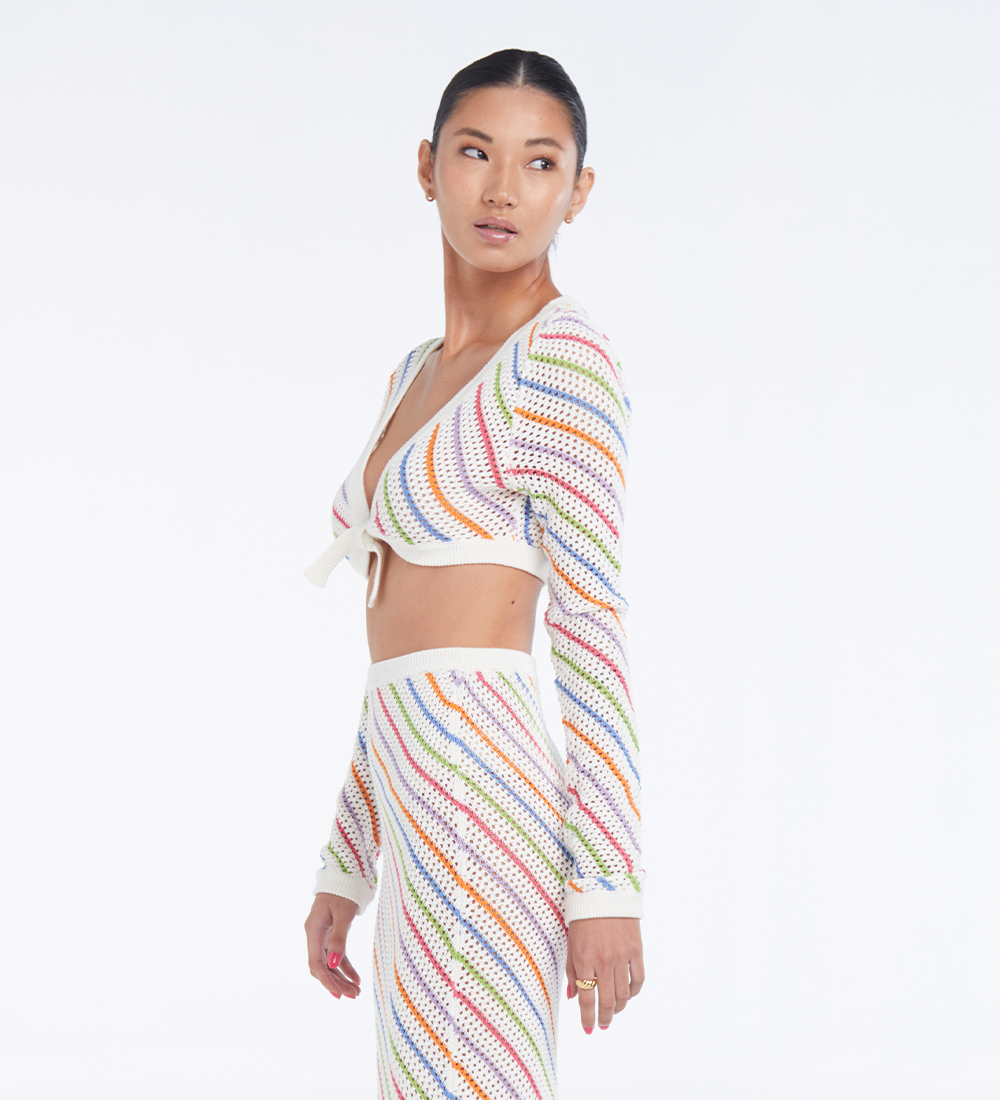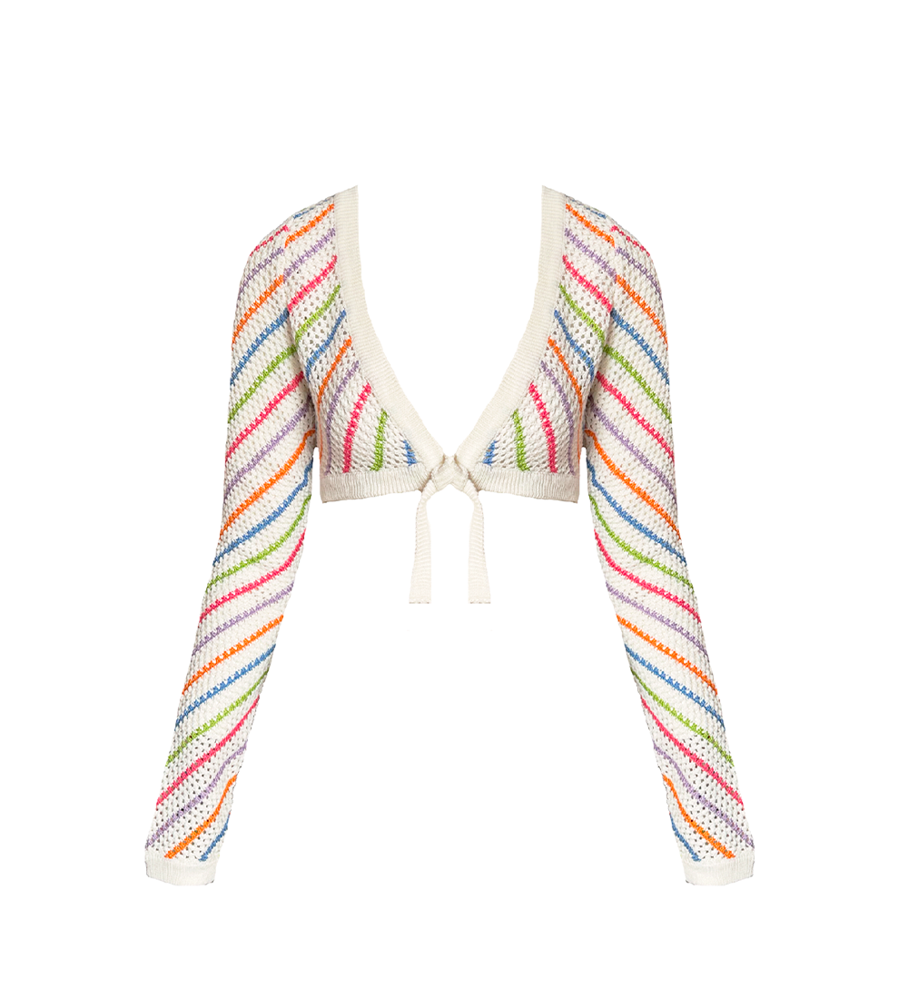 Bruna is what you were looking for. Ivory long sleeve top with details in colored lines that ties in the front and has an ideal fit for any occasion. Produced in a sustainable factory and handmade by Peruvian artisans.