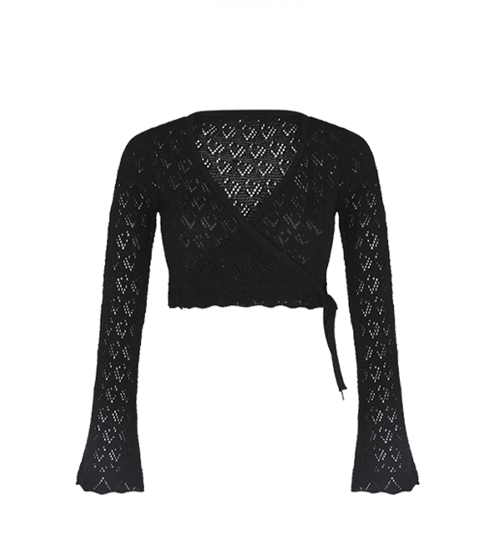The perfect mix of cute and comfy! Black mini croped jacket crocheted and that ties all the way around to accentuates your figure to the maximum. Produced in a sustainable factory and handmade by Peruvian artisans.
