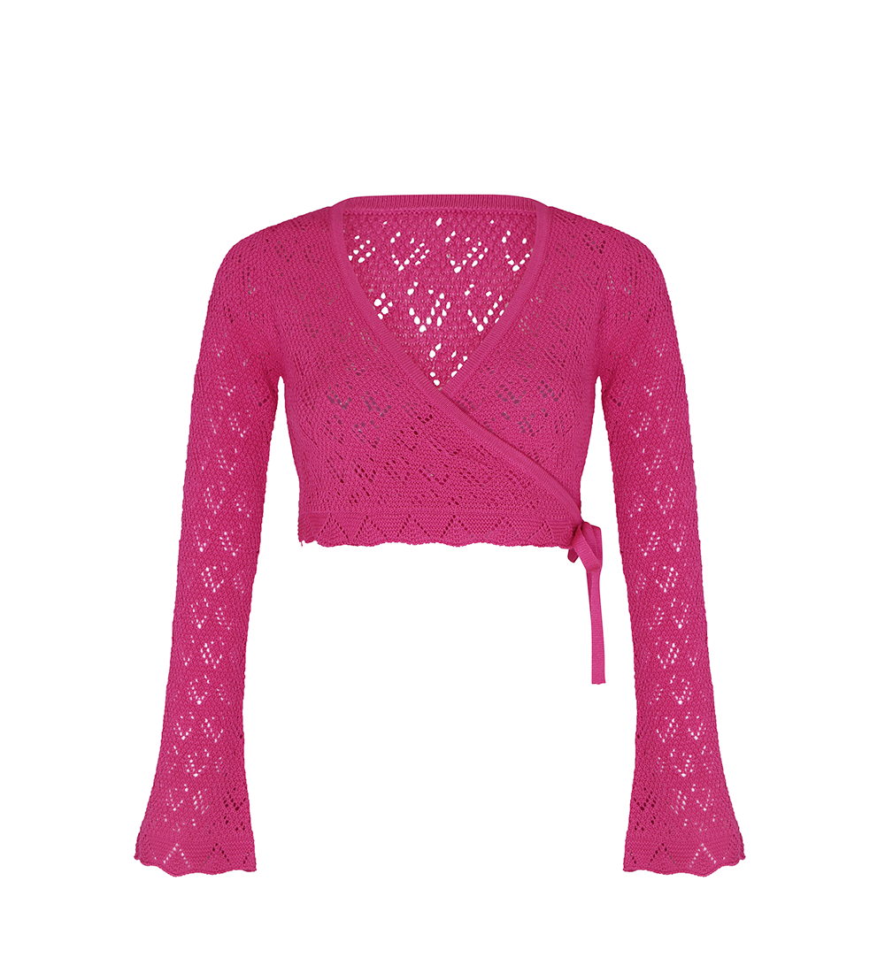 The perfect mix of cute and comfy! Fuchsia mini croped jacket crocheted and that ties all the way around to accentuates your figure to the maximum. Produced in a sustainable factory and handmade by Peruvian artisans.