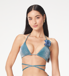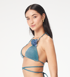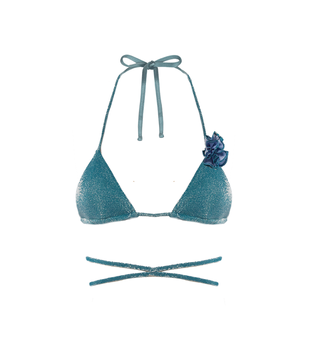 Lulu will make you shine like never before. Triangular bikini with shiny fabric, removable flower details and wrap-around pitas on the torso. Produced in a sustainable factory and handmade by Peruvian artisans.