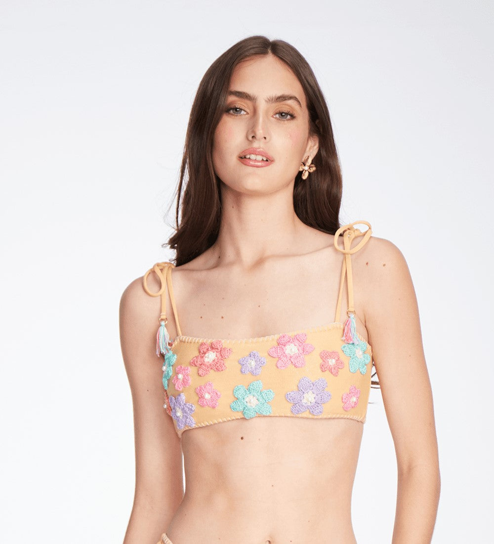 Bikini with a straight top adorned with hand-embroidered multicolored flowers and delicate pearls in the center. Made of textured fabric in waves, with straps to tie and matching tassels. With scalloped seams on the edge of the top and bottom.